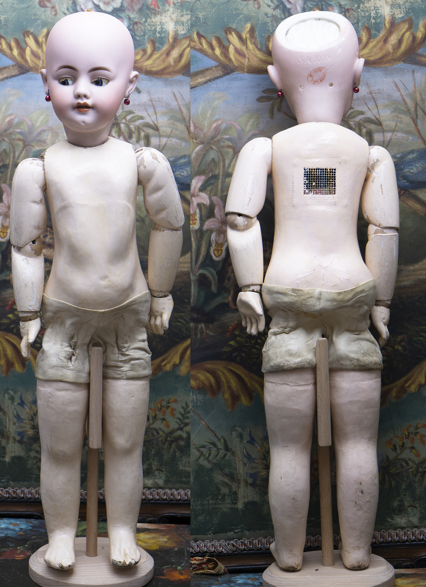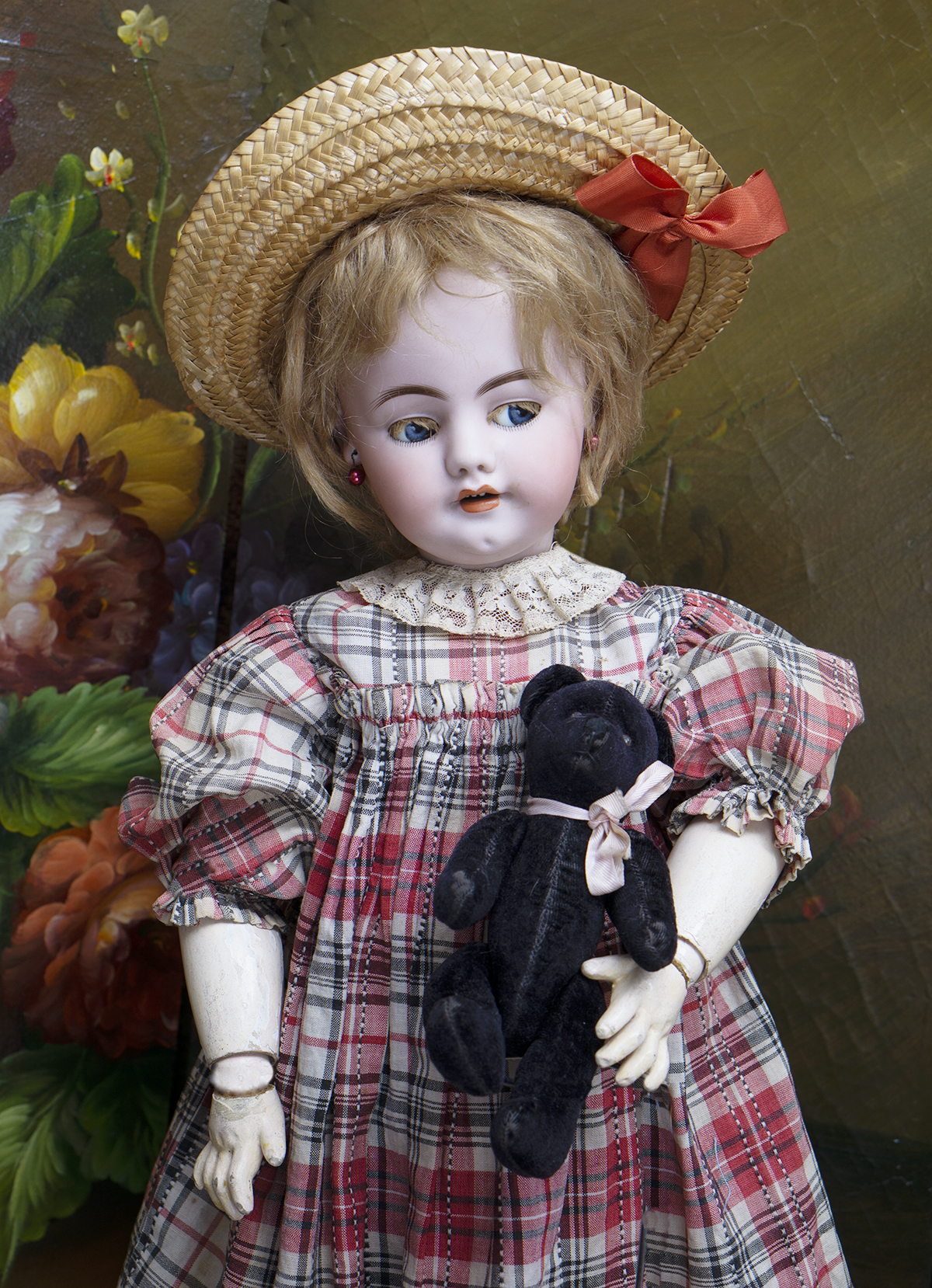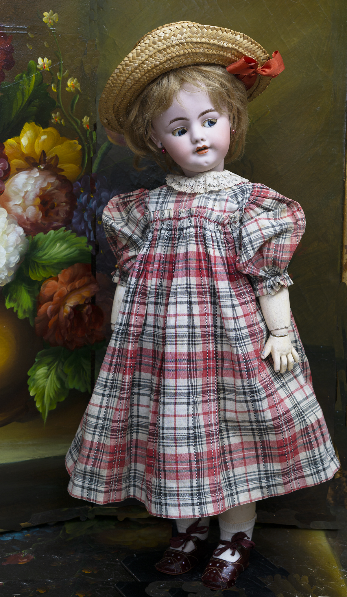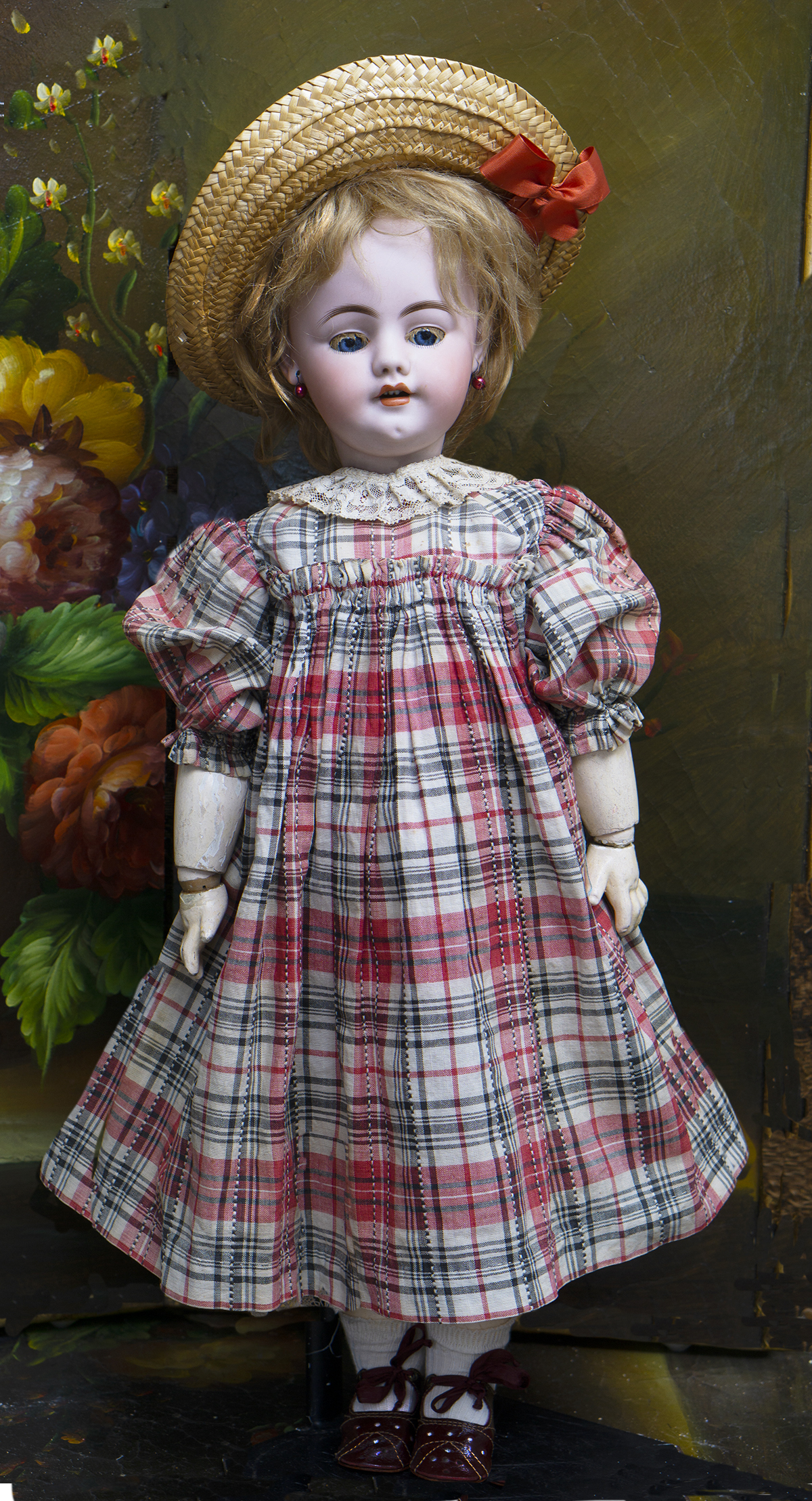 Bisque socket head, blue glass sleep and flirty eyes, mohair lashes, dark eyeliner,painted curly lashes, slightly- modeled brush-stroked and feathered brows, accented nostrils and eye corners, open mouth, shaded lips, four porcelain teeth, dimpled chin, pierced ears, auburn mohair original wig, French composition and wooden body with one- piece legs hinged by leather for "walking".