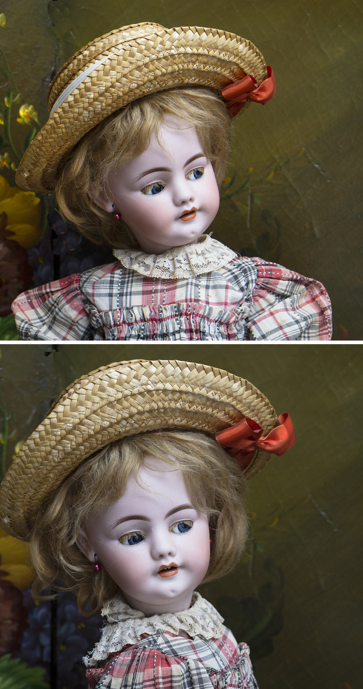 Very beautiful doll with "flirty" eye s enhanced by rare mohair lashes,original body and body finish,very fine antique dress, underwear, socks, straw hat and vintage leather shoes. 23" (58 cm) height Condition: generally excellent. Her bisque free of hairline, restoration, any damages. The body has original finish. Marks: SH 1039 Germany 10 1/2 DEP. Simon and Halbig, circa 1895, for french market. ------------------------------------ I DO A LAYAWAY! NO ANY SALES TAX! International shipping cost $70.00. Payment by PayPal, wire transfer. If you have any questions please email me to respectfulbear@respectfulbear.com. Thanks for your visit to Respectfulbear doll shop! ------------------------------------ I DO A LAYAWAY NO STATE SALES TAX! Thanks for your visit to Respectfulbear doll shop!