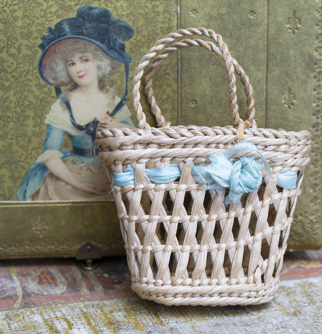 The little basket for fashion doll or small bebe is so sweet! The condition of the straw is quite good, decorated with aqua silk ribbon.