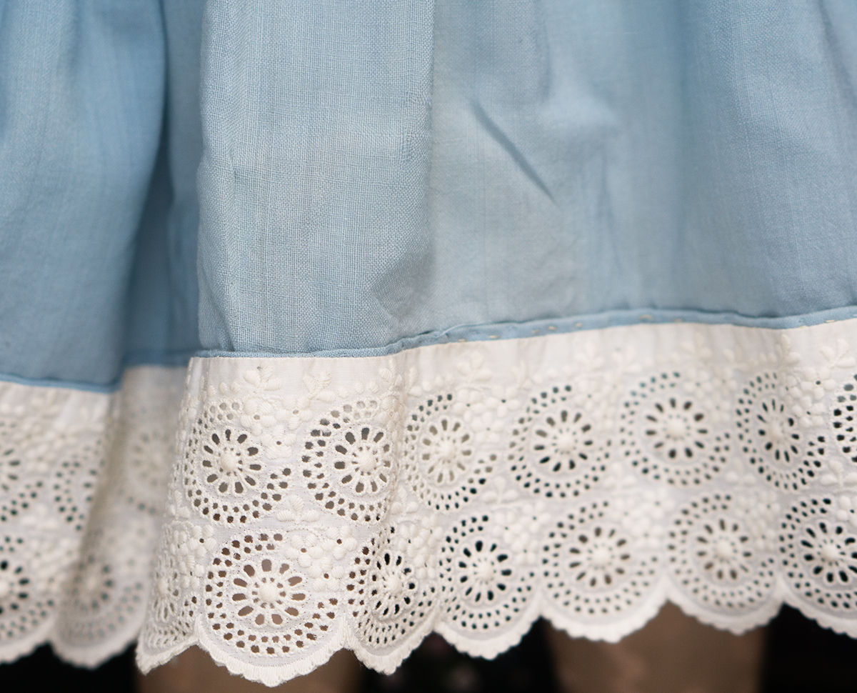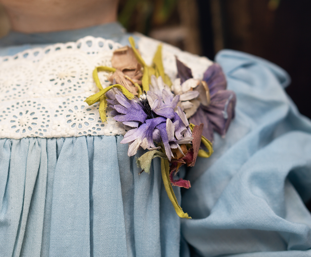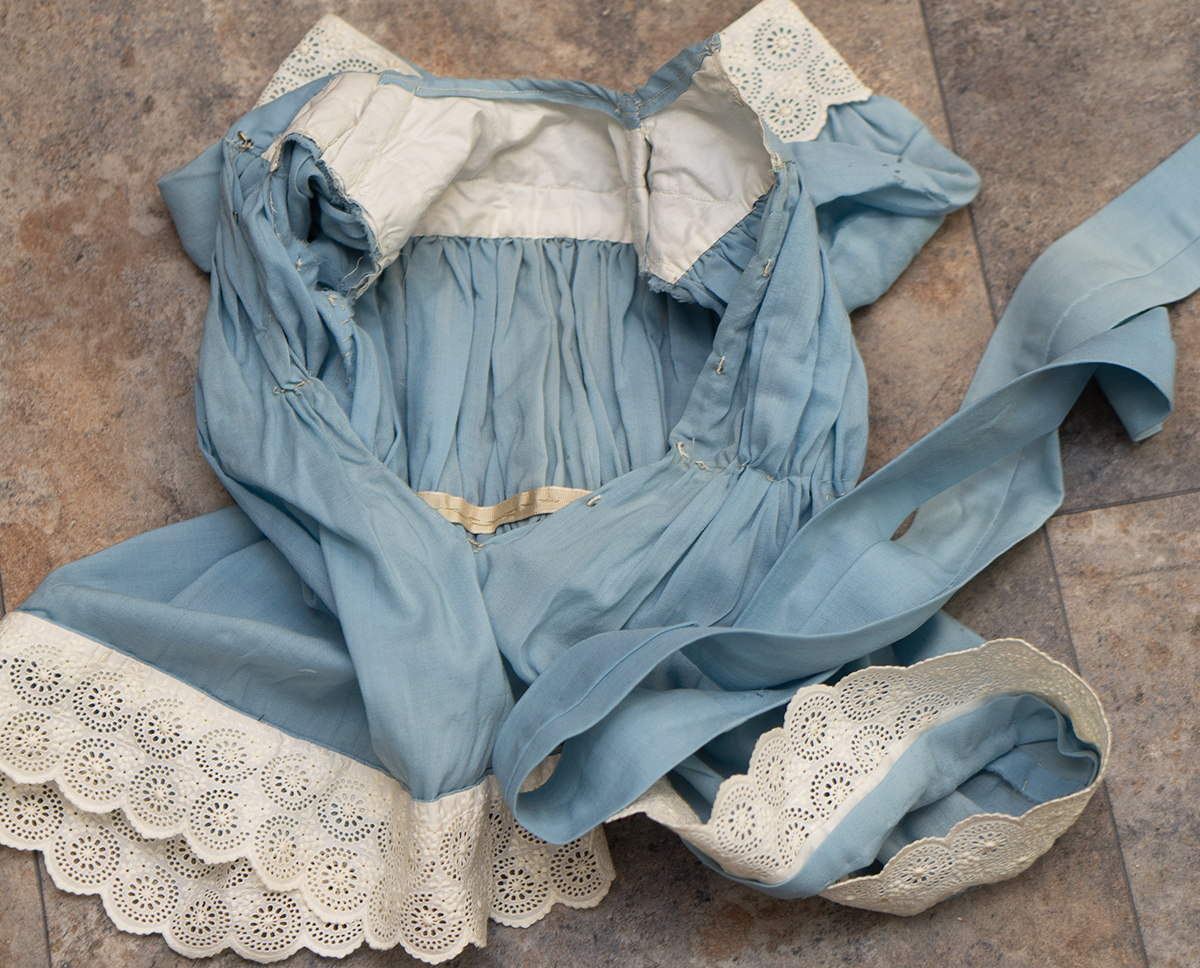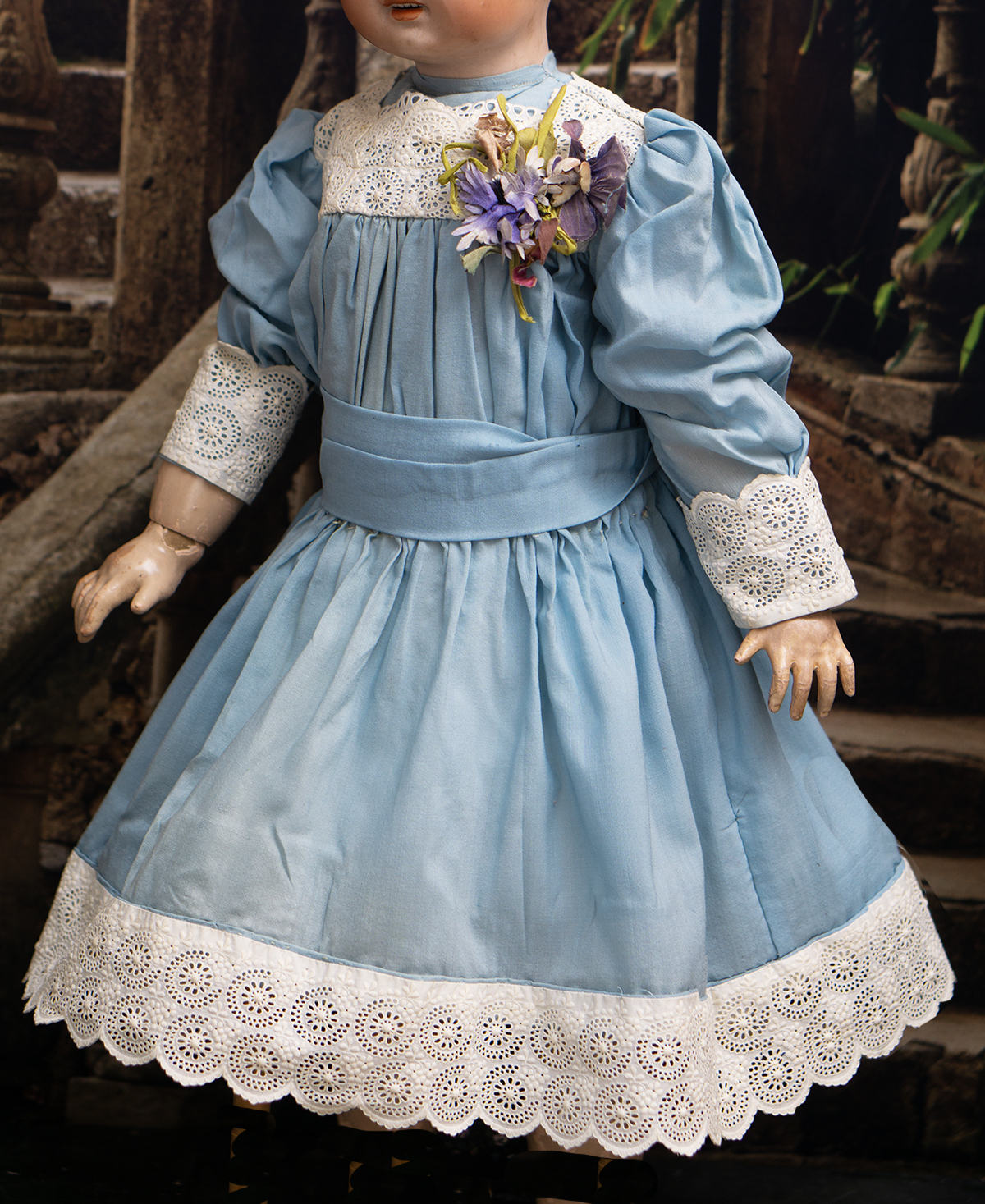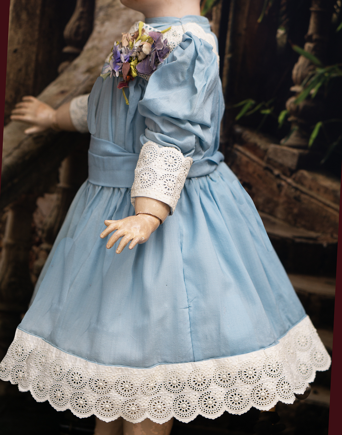 Very beautiful antique original woolen blue dress features rounded neckline, fitted bodice, 2/3 full sleeves with cuffs, decorate with cotton lace and flowers, closure at the back with hook and eye, wide sash. lined with cotton. Good condition to age. Fit for Jumeau, Bru, Steiner, Eden bebe or early german bisque doll about 25-26" tall (63-66 cm) Measures 17" (43 cm) length, 8" (20 cm) sleeve, 7" (18 cm) shoulders, 14 1/2" (37 cm) waist. Fit for Bebe doll 25-26" (63-66cm). International shipping cost bu UPS $55.00 NO extra duties or taxes on delivery (UPS DDP). ------------------------------------ I DO A LAYAWAY NO STATE SALES TAX! Thanks for your visit to Respectfulbear doll shop!