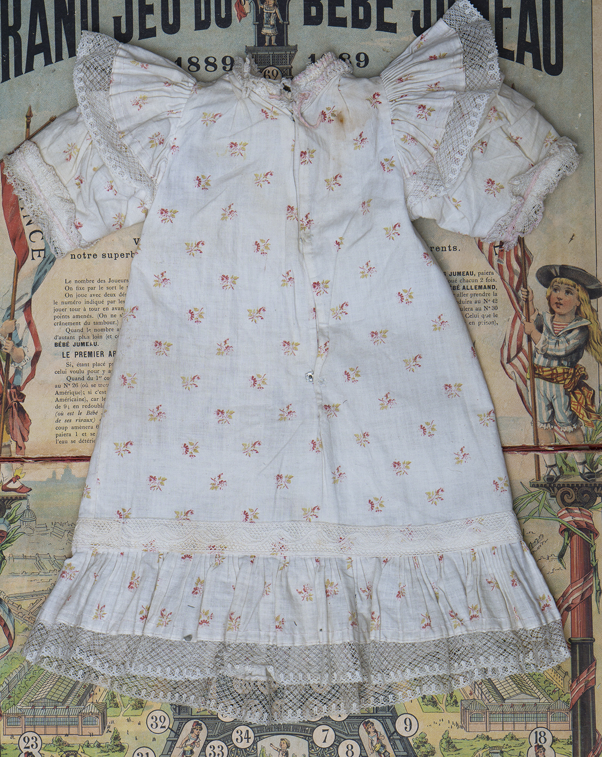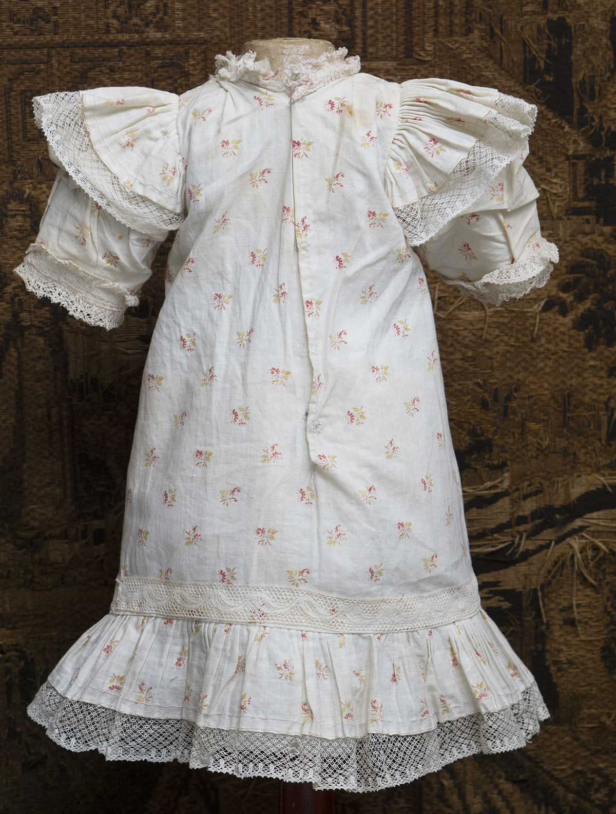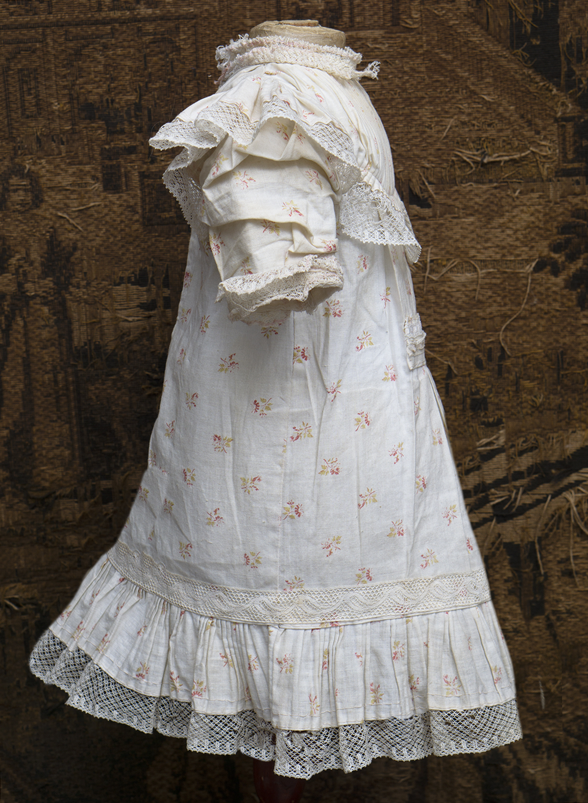 Antique french original factory Dress/ Chemise. White muslin is printed with tiny rose flowers. It has hem ruffle with lace edging.