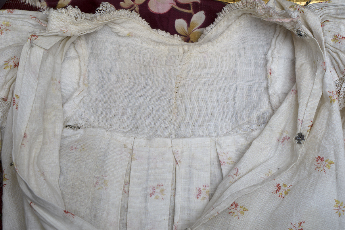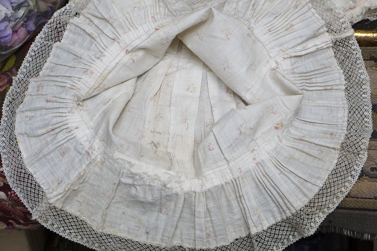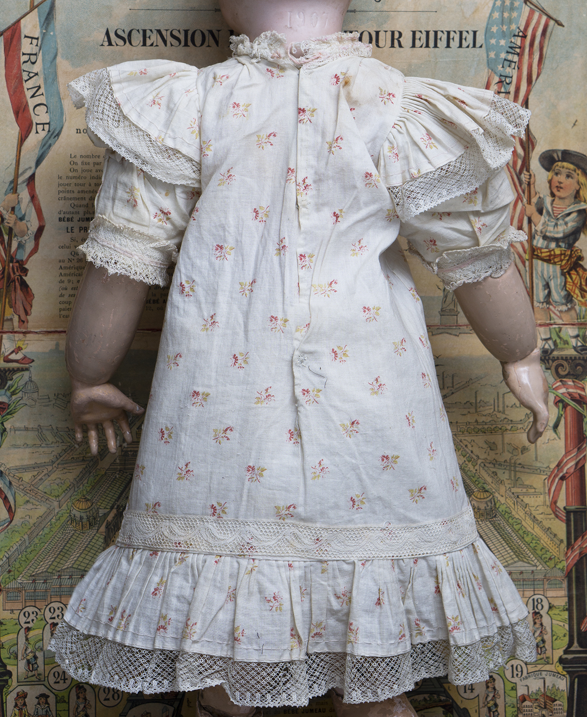 Antique french original factory Dress/ Chemise. White muslin is printed with tiny rose flowers. It has hem ruffle with lace edging.