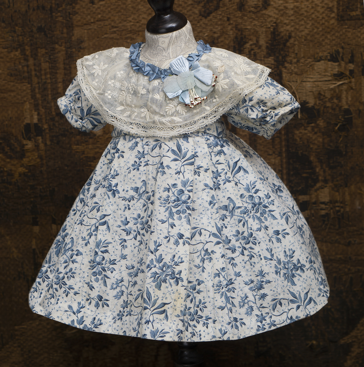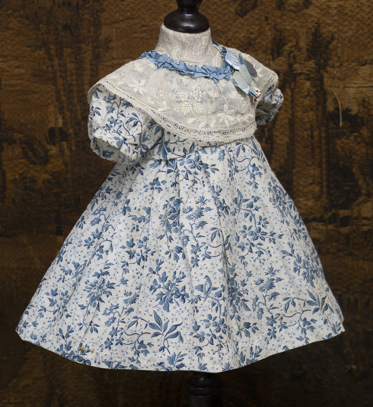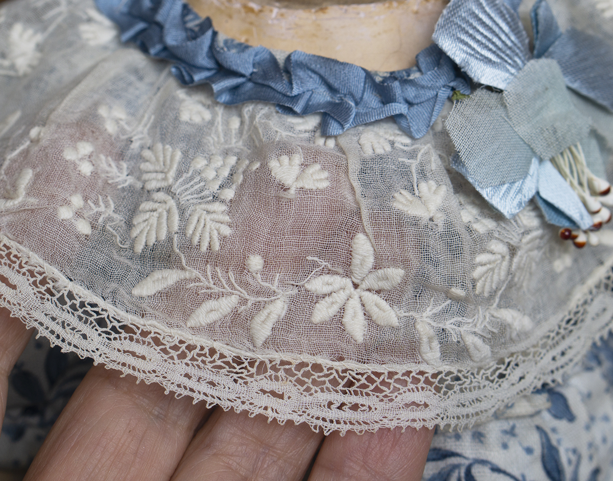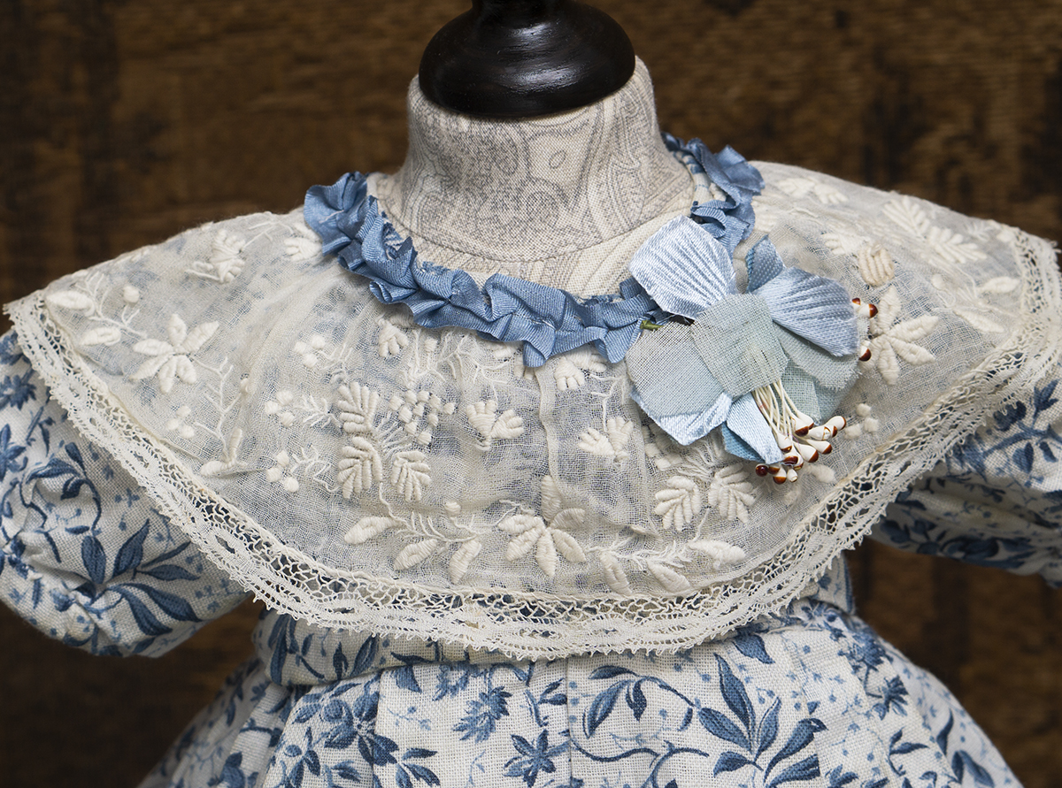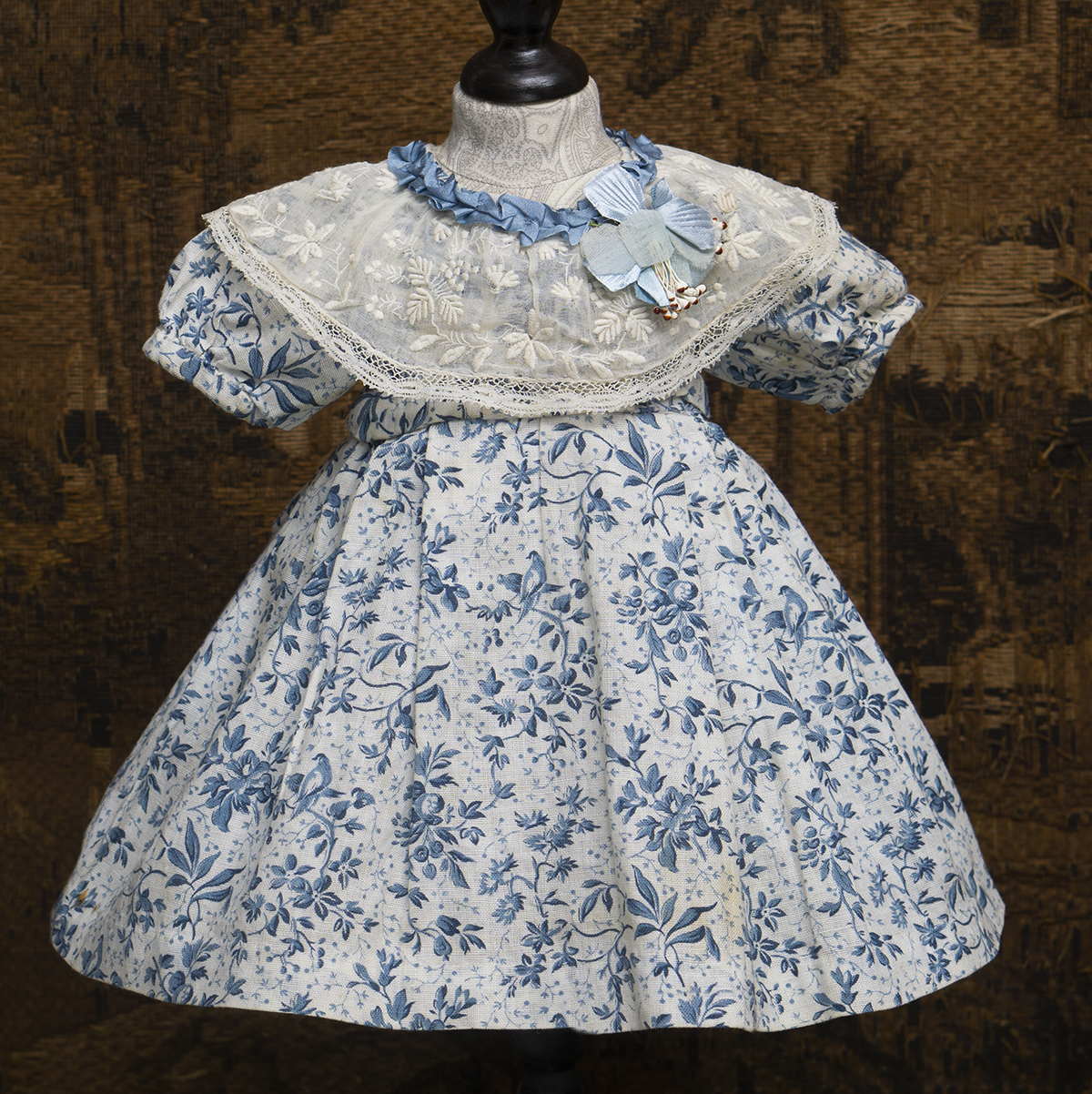 Very nice printed cotton dress with flowers and birds features high waist, muslin Bertha collar with white embroidery and lace edging, short sleeves, closure at the back, decorated with blue silk flower and blue silk ribbon on the neckline.