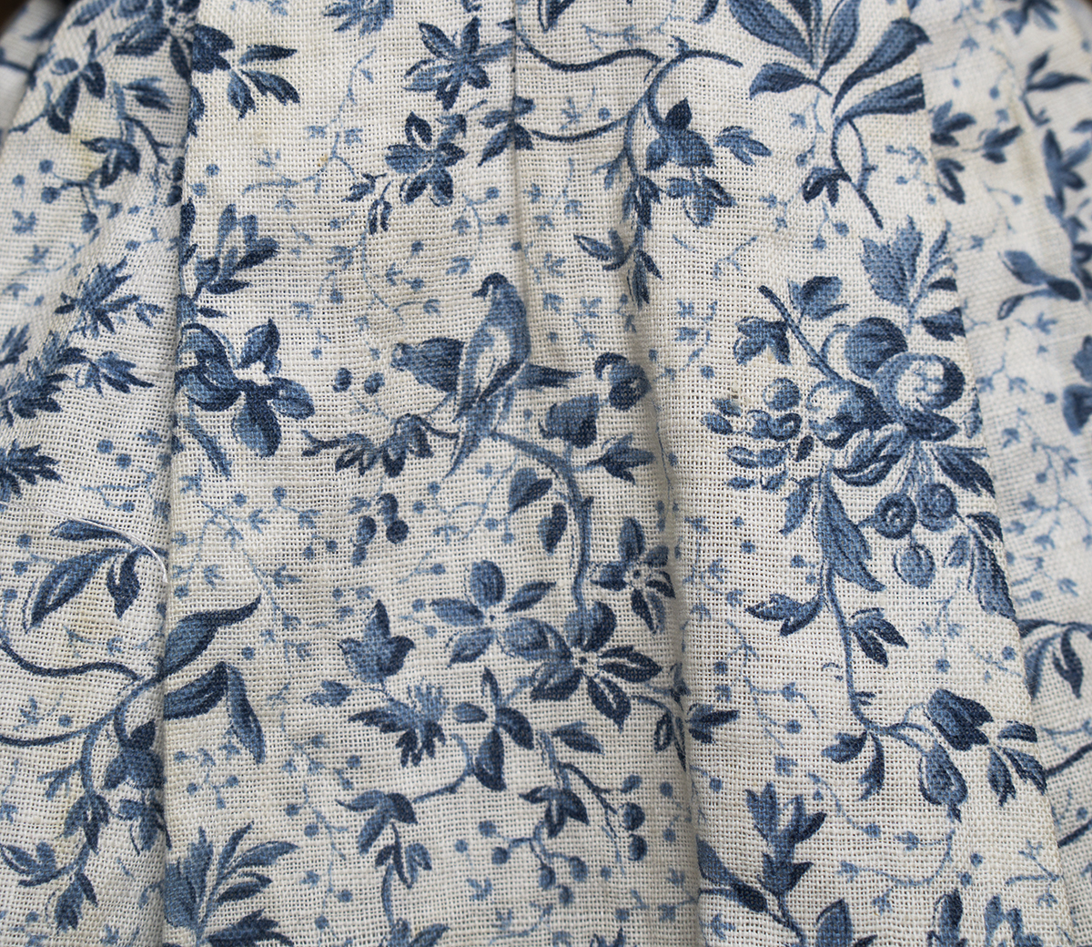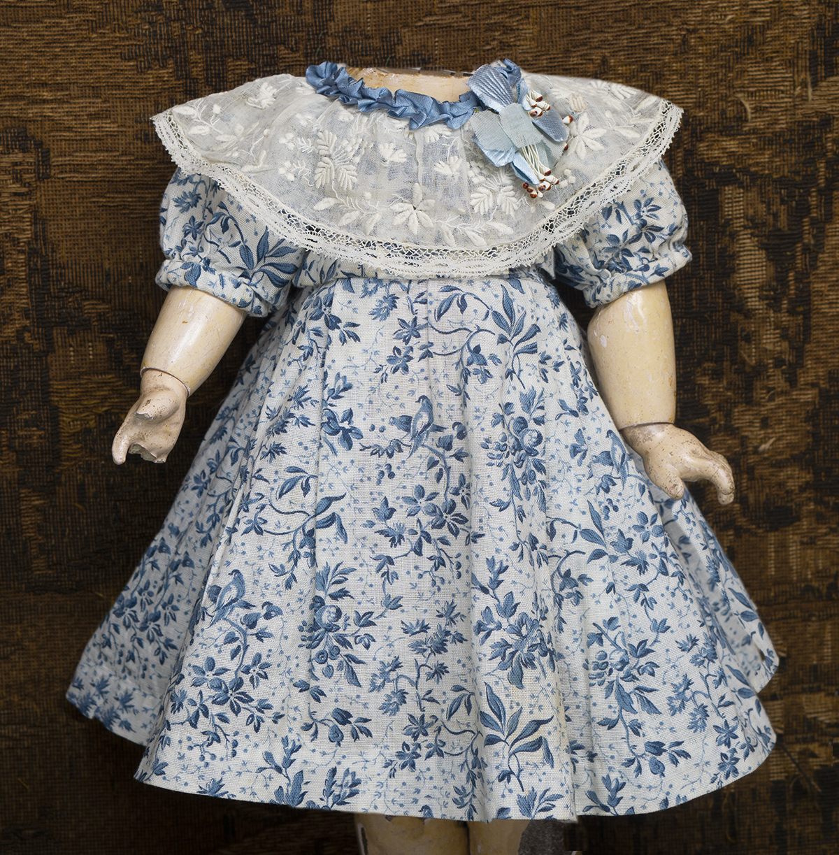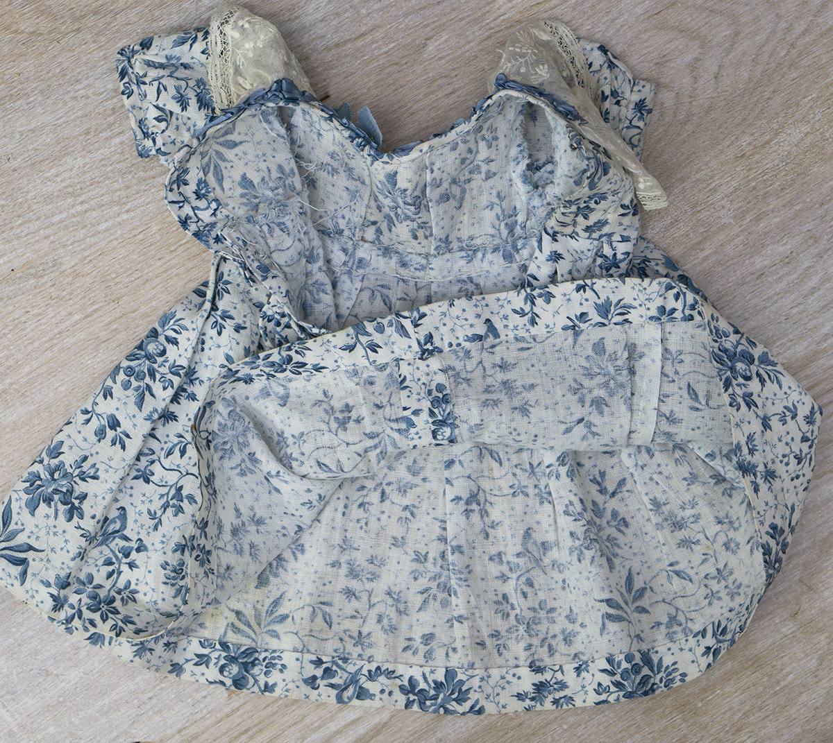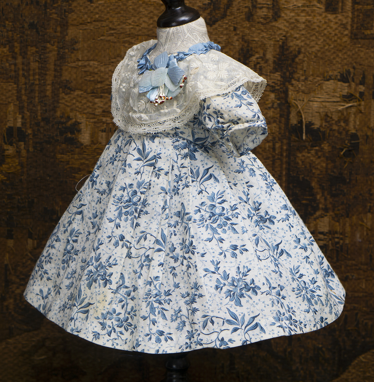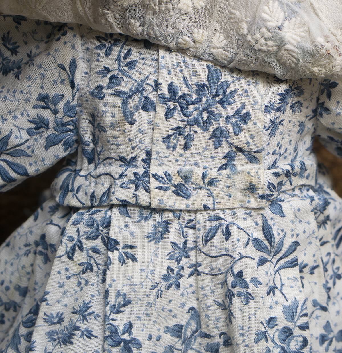 Very nice printed cotton dress with flowers and birds features high waist, muslin Bertha collar with white embroidery and lace edging, short sleeves, closure at the back, decorated with blue silk flower and blue silk ribbon on the neckline.