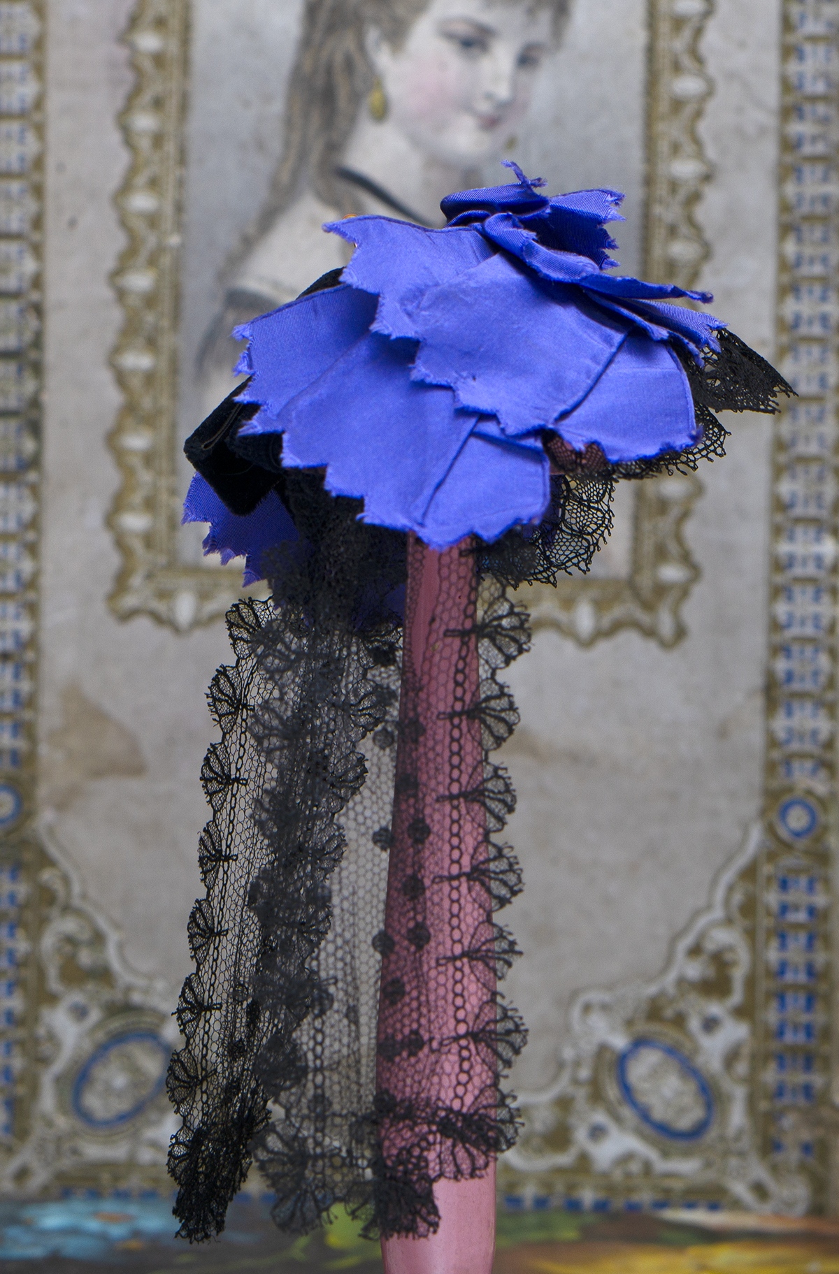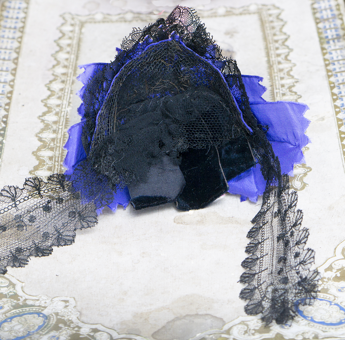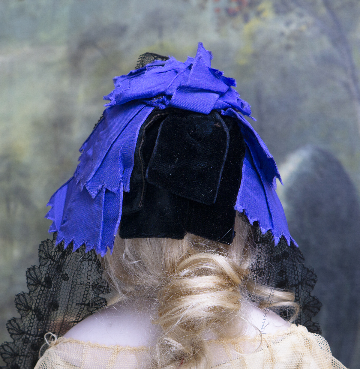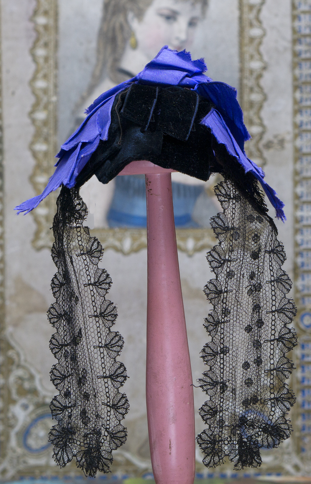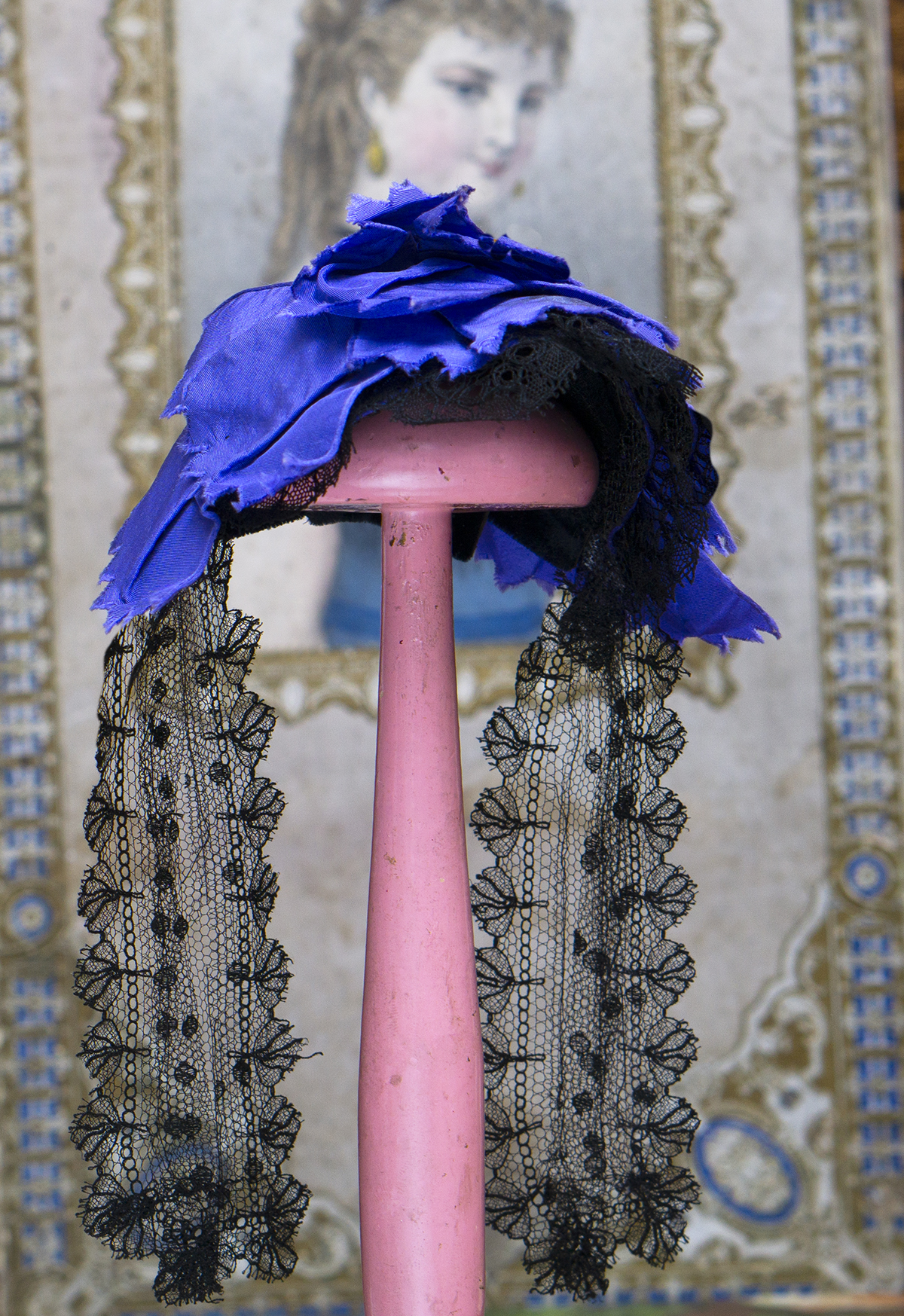 A very beautiful antique french original lilac silk, black lace and black velvet hat/bonnet for fashion doll.