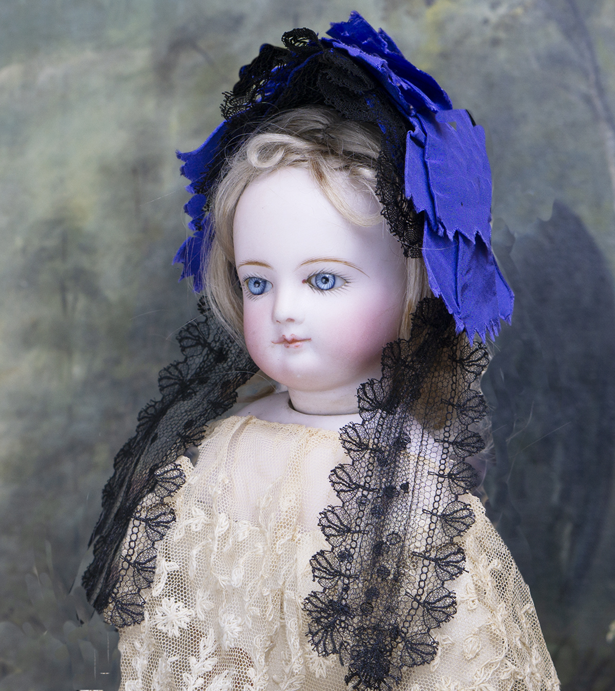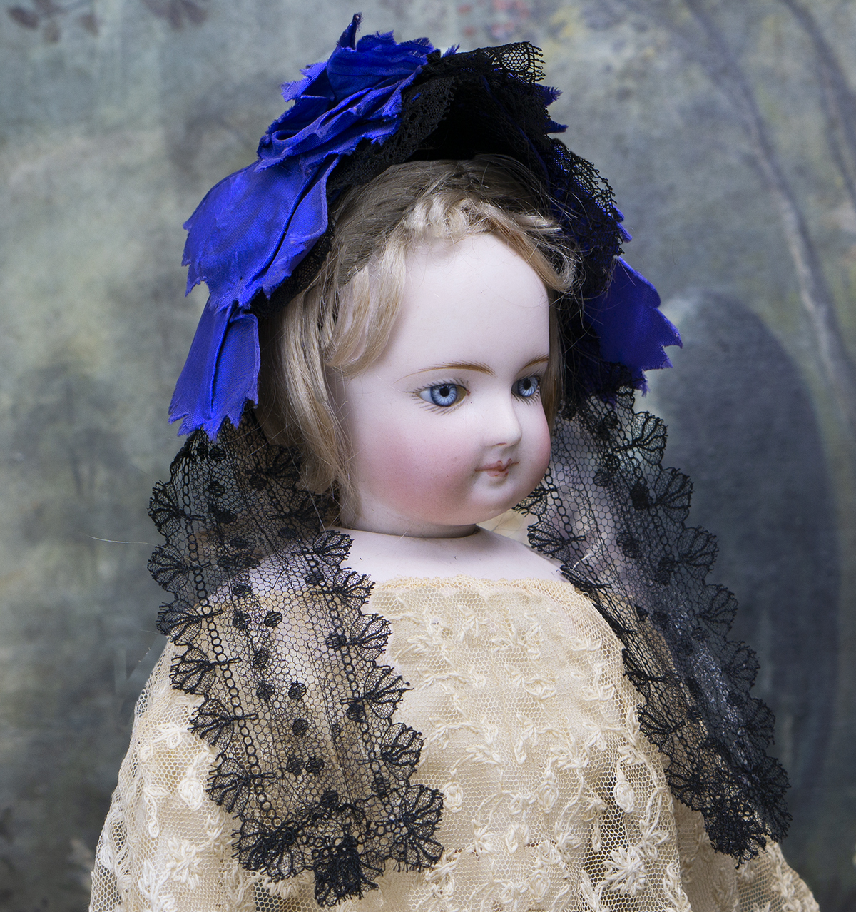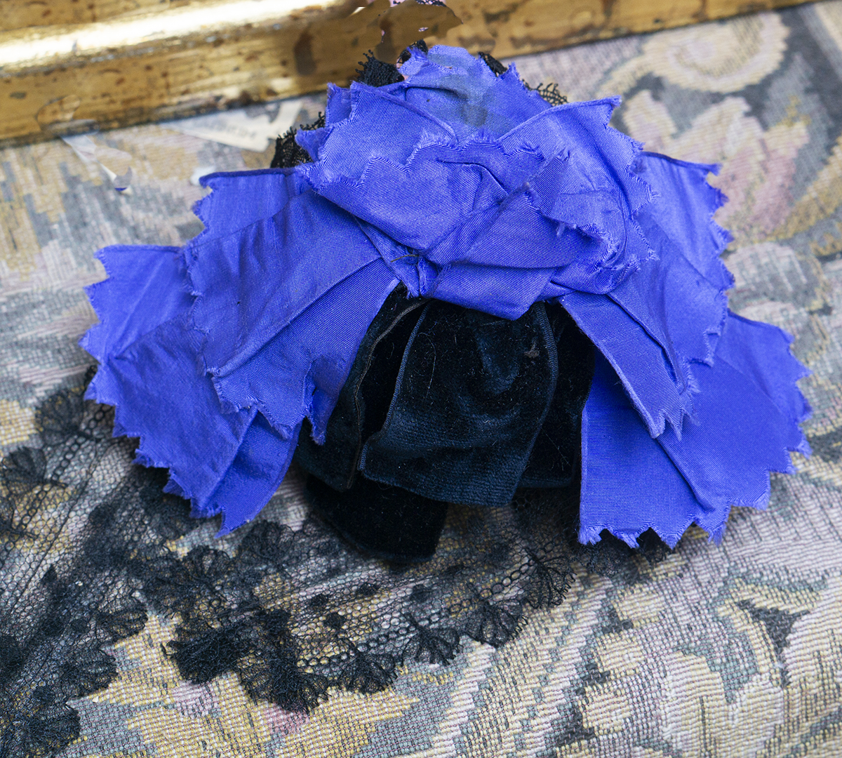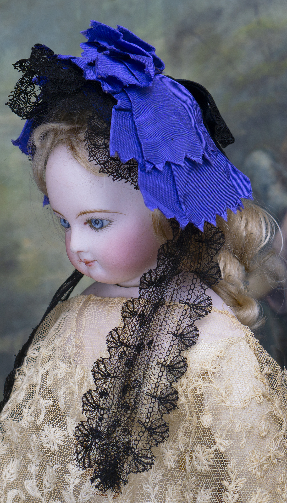 A very beautiful antique french original lilac silk, black lace and black velvet hat/bonnet for fashion doll.