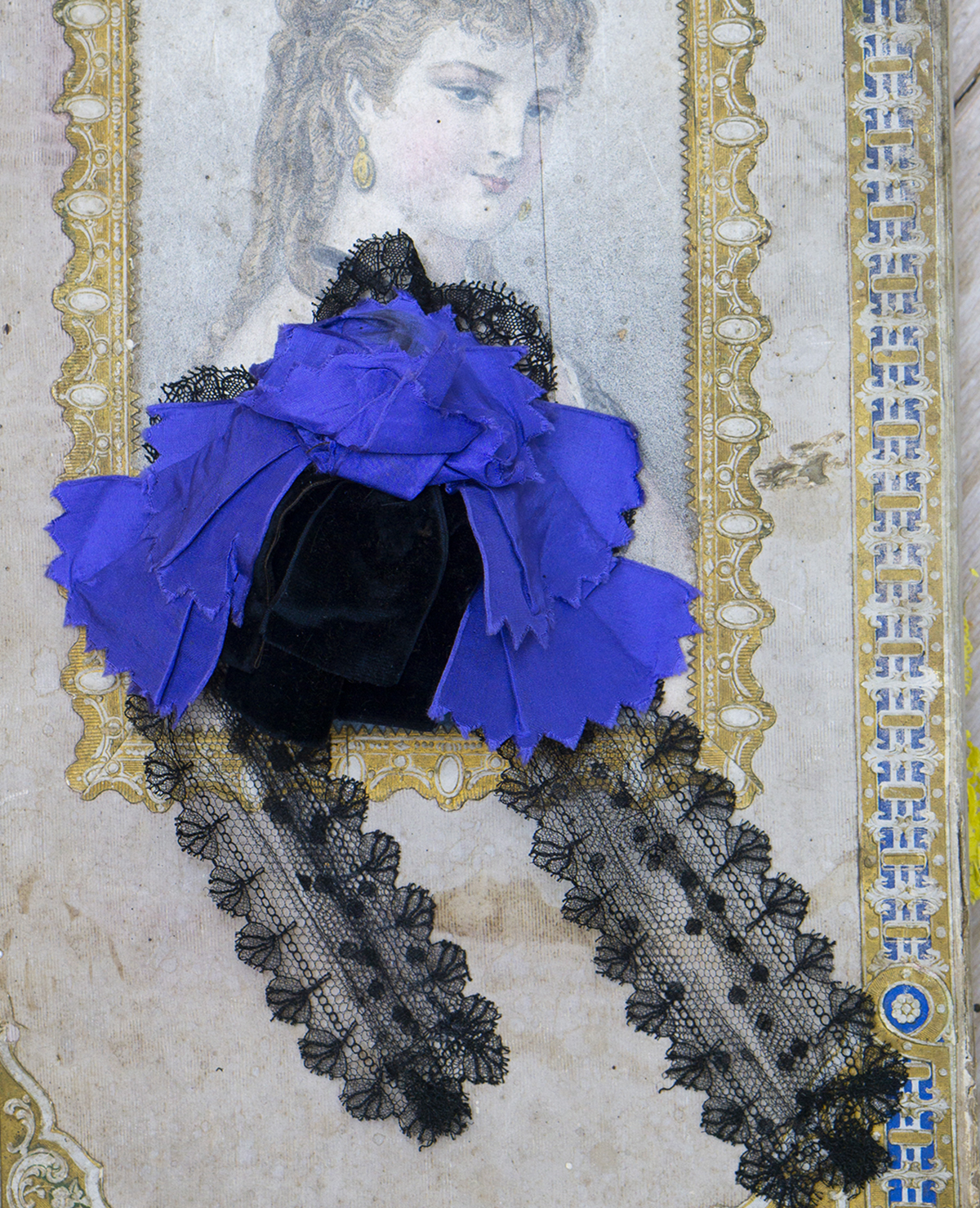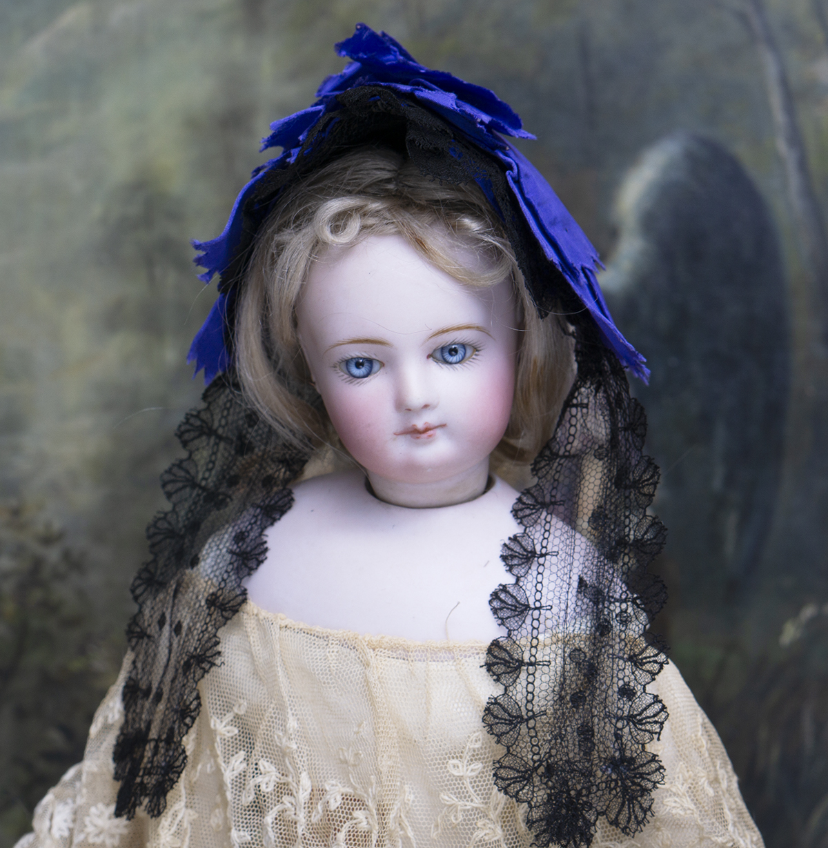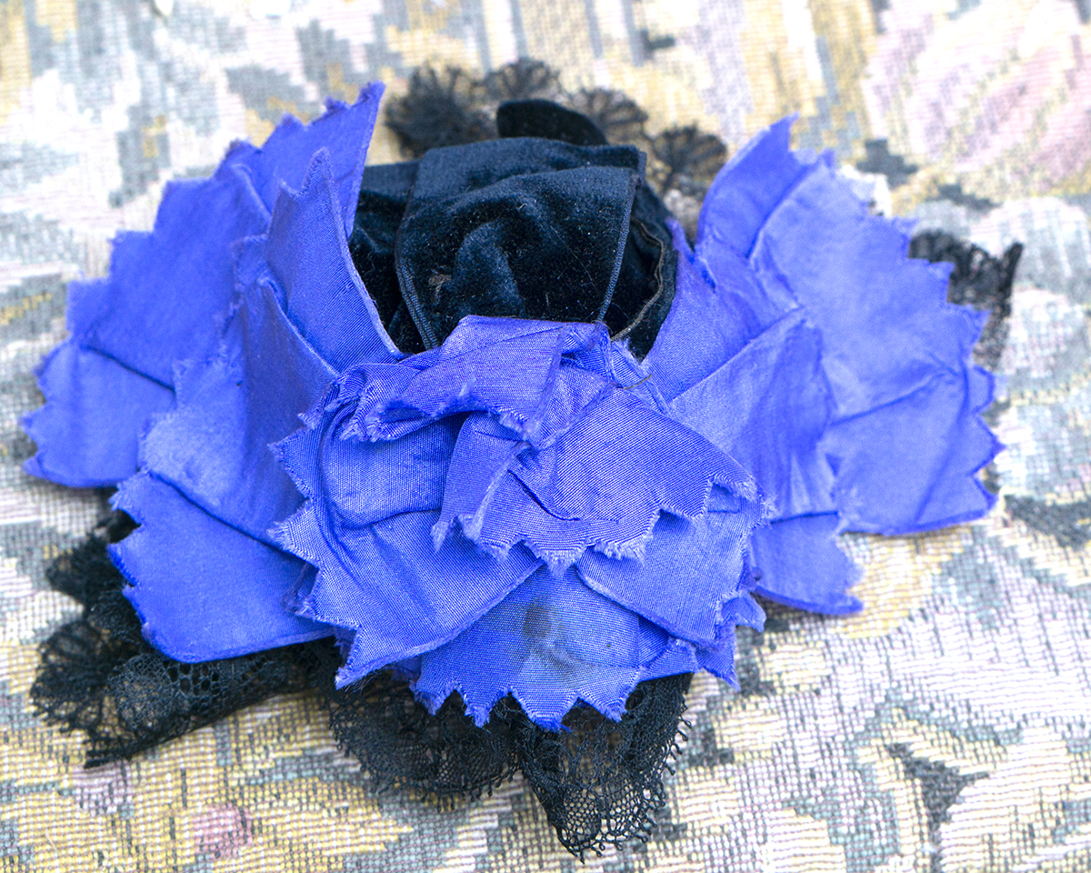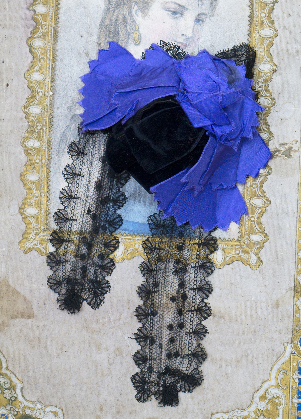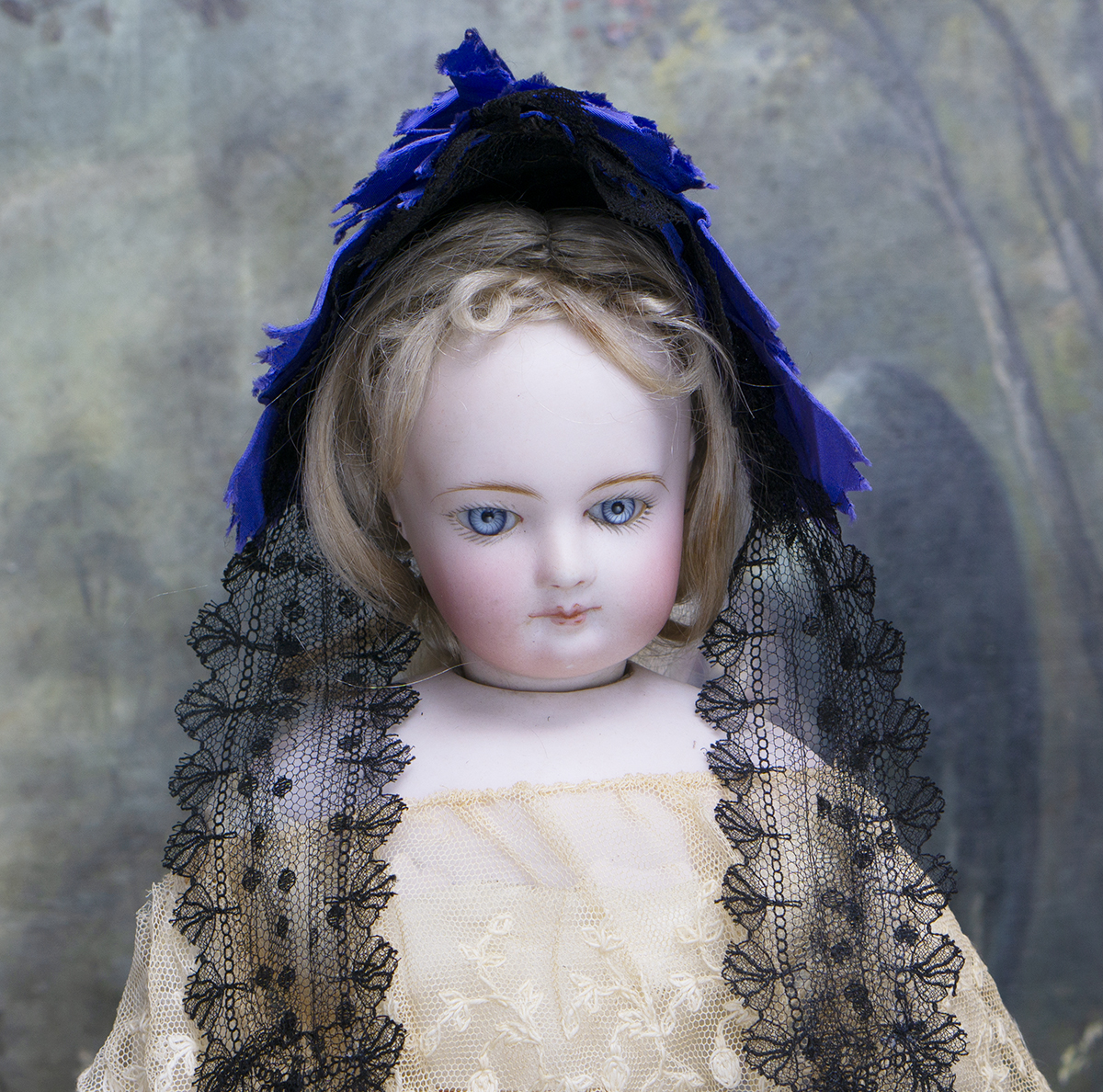 A very beautiful antique french original lilac silk, black lace and black velvet hat/bonnet for fashion doll.