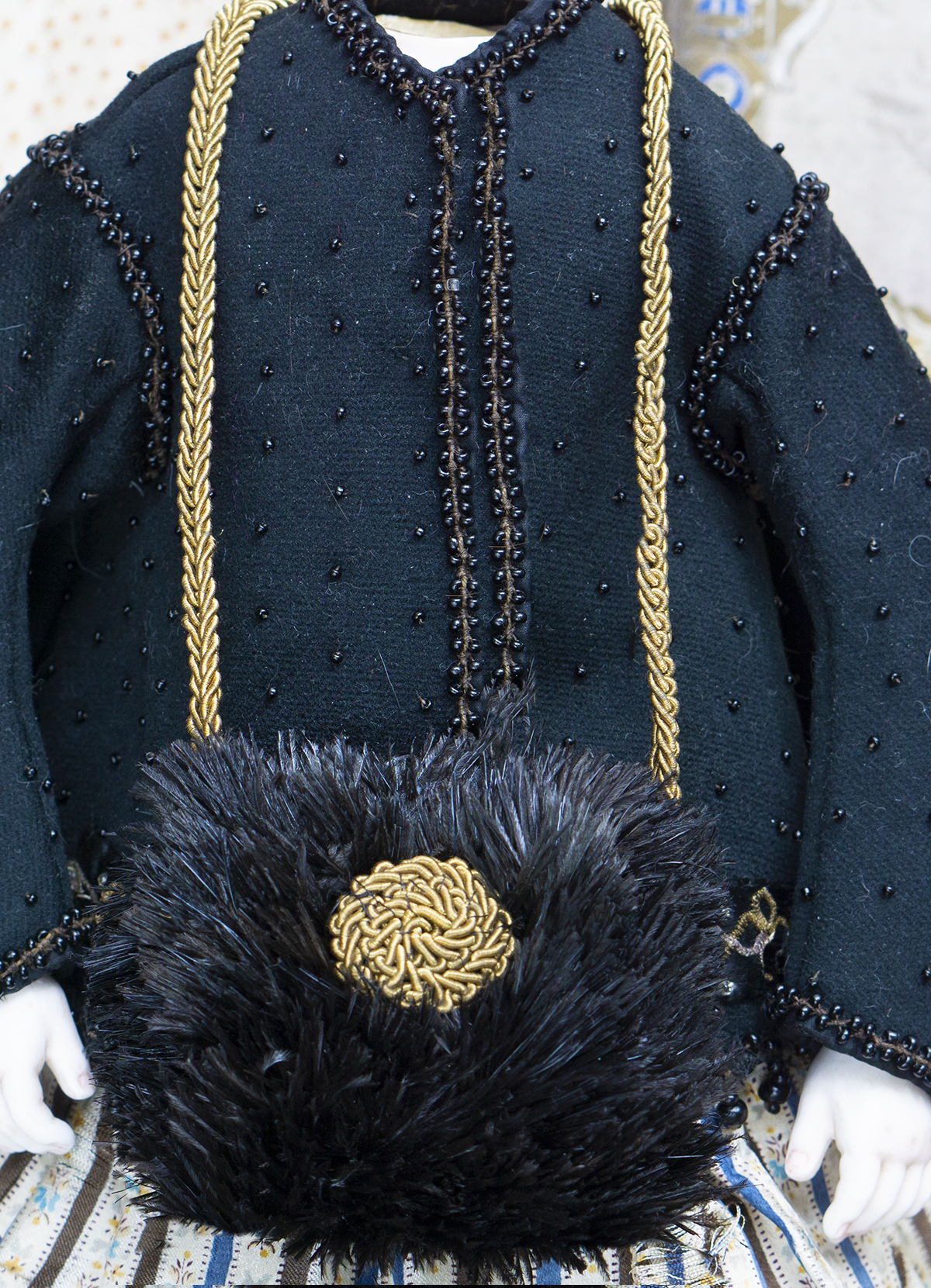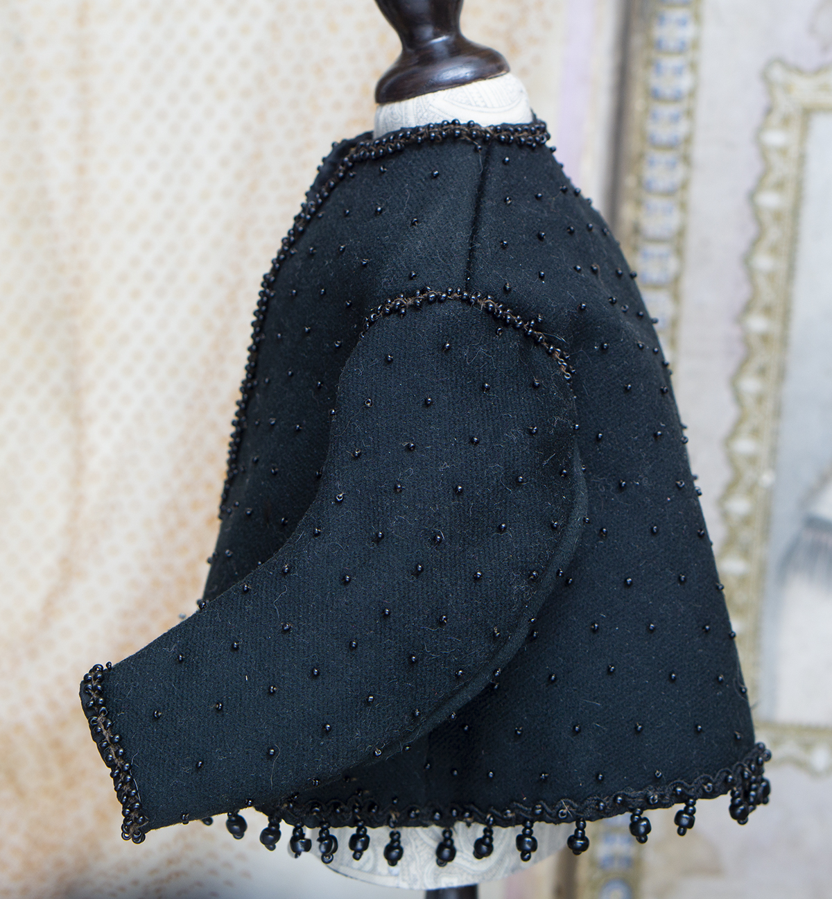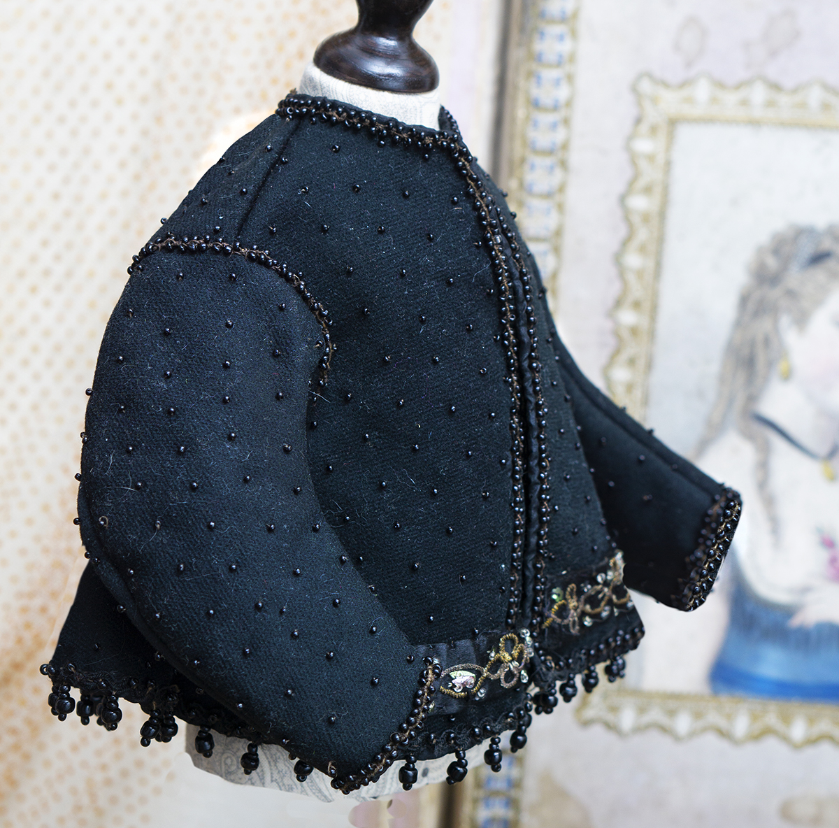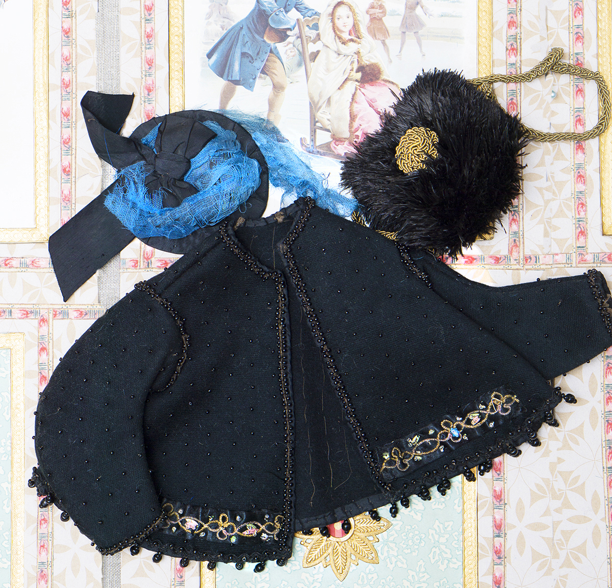 1/ Of soft black velvet all original jacket with fitted bodice, elongated back, trimmed with black braid ornamented with black beads, decorated with tiny beads and black silk ribbons with color glasses, gold metal thread embroidery and beads, closure at the front with hook and eye. Measures 7" (18cm) length, 5 1/2" (14cm) sleeve, 5 1/2" (14cm) shoulders, free waist. 2/ Antique black silk feather muff with gold metal cord lined with black silk. Measures 3" x 2.5" (7.5 X 6.5 cm), the cord 6 1/2" (17cm) height. 3/The matching black silk and straw hat decorated with blue gauze silk and black velvet ribbon. Measures 2" (5cm) wide inside and 3 1/2" (8cm) full wide. This set in good condition to age. French, c.1860. Measures The jacket 6in (15cm) length, 4 1/2" (11.5cm) shoulders, 4" (10cm) sleeve, free waist. the hat 2 1/2" (5.5 cm) height, 2" (5cm) wide inside amd 3 1/2" (8,5cm) wide including hat brim. Fit for fashion doll about 16-17in tall. I DO A LAYAWAY. No any sales tax. International shipping cost $45.00 Payment by PayPal, wire transfer. Please email me if you have any questions. Thanks for your visit to Respectfulbear doll shop. ------------------------------------ I DO A LAYAWAY NO STATE SALES TAX! Thanks for your visit to Respectfulbear doll shop!