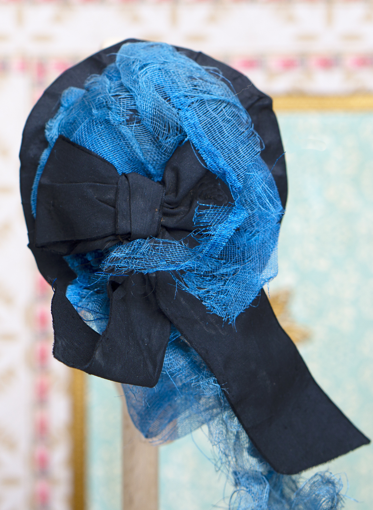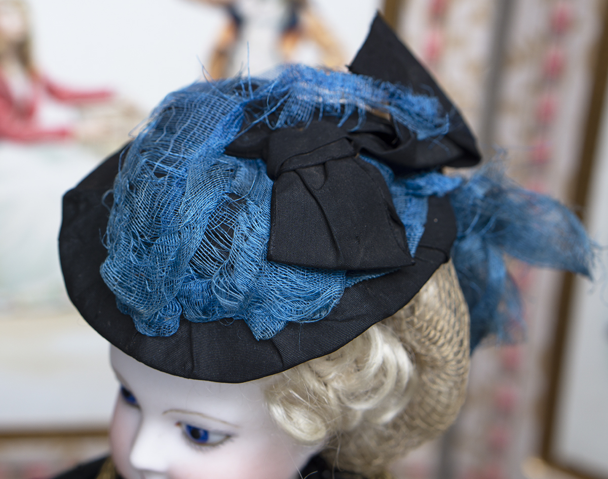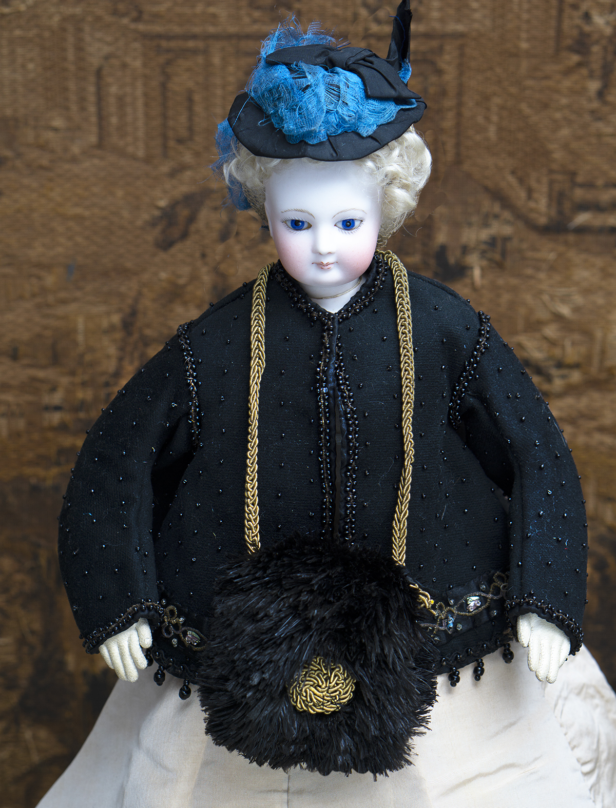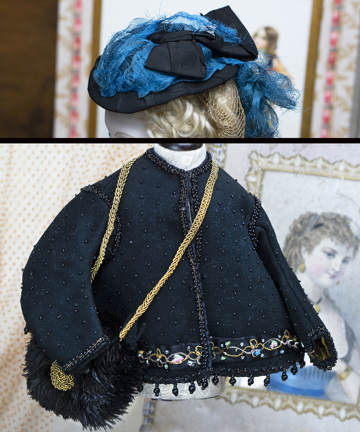 1/ Of soft black velvet all original jacket with fitted bodice, elongated back, trimmed with black braid ornamented with black beads, decorated with tiny beads and black silk ribbons with color glasses, gold metal thread embroidery and beads, closure at the front with hook and eye. Measures 7" (18cm) length, 5 1/2" (14cm) sleeve, 5 1/2" (14cm) shoulders, free waist. 2/ Antique black silk feather muff with gold metal cord lined with black silk. Measures 3" x 2.5" (7.5 X 6.5 cm), the cord 6 1/2" (17cm) height. 3/The matching black silk and straw hat decorated with blue gauze silk and black velvet ribbon. Measures 2" (5cm) wide inside and 3 1/2" (8cm) full wide. This set in good condition to age. French, c.1860. Measures The jacket 6in (15cm) length, 4 1/2" (11.5cm) shoulders, 4" (10cm) sleeve, free waist. the hat 2 1/2" (5.5 cm) height, 2" (5cm) wide inside amd 3 1/2" (8,5cm) wide including hat brim. Fit for fashion doll about 16-17in tall. I DO A LAYAWAY. No any sales tax. International shipping cost $45.00 Payment by PayPal, wire transfer. Please email me if you have any questions. Thanks for your visit to Respectfulbear doll shop. ------------------------------------ I DO A LAYAWAY NO STATE SALES TAX! Thanks for your visit to Respectfulbear doll shop!