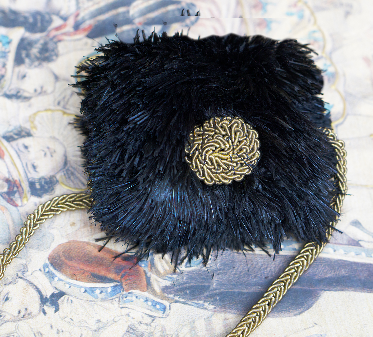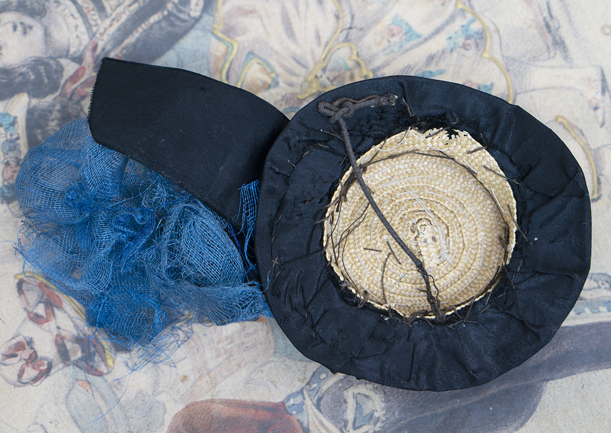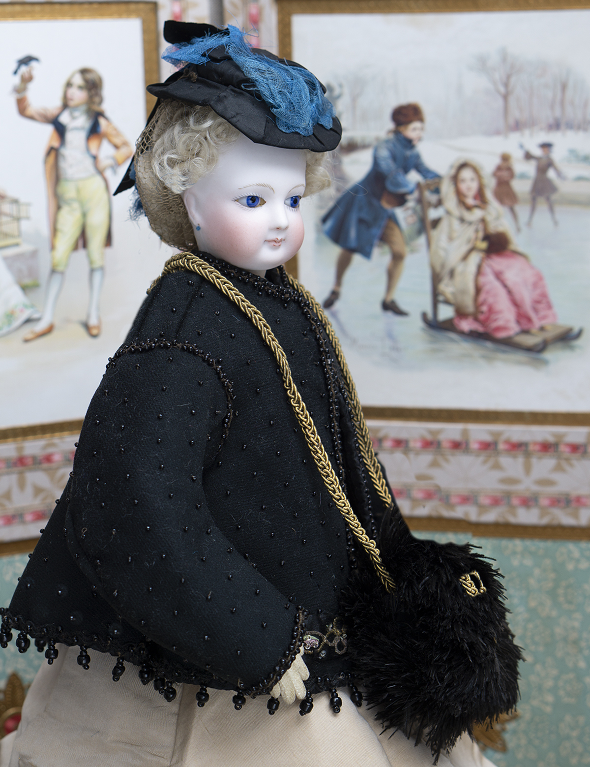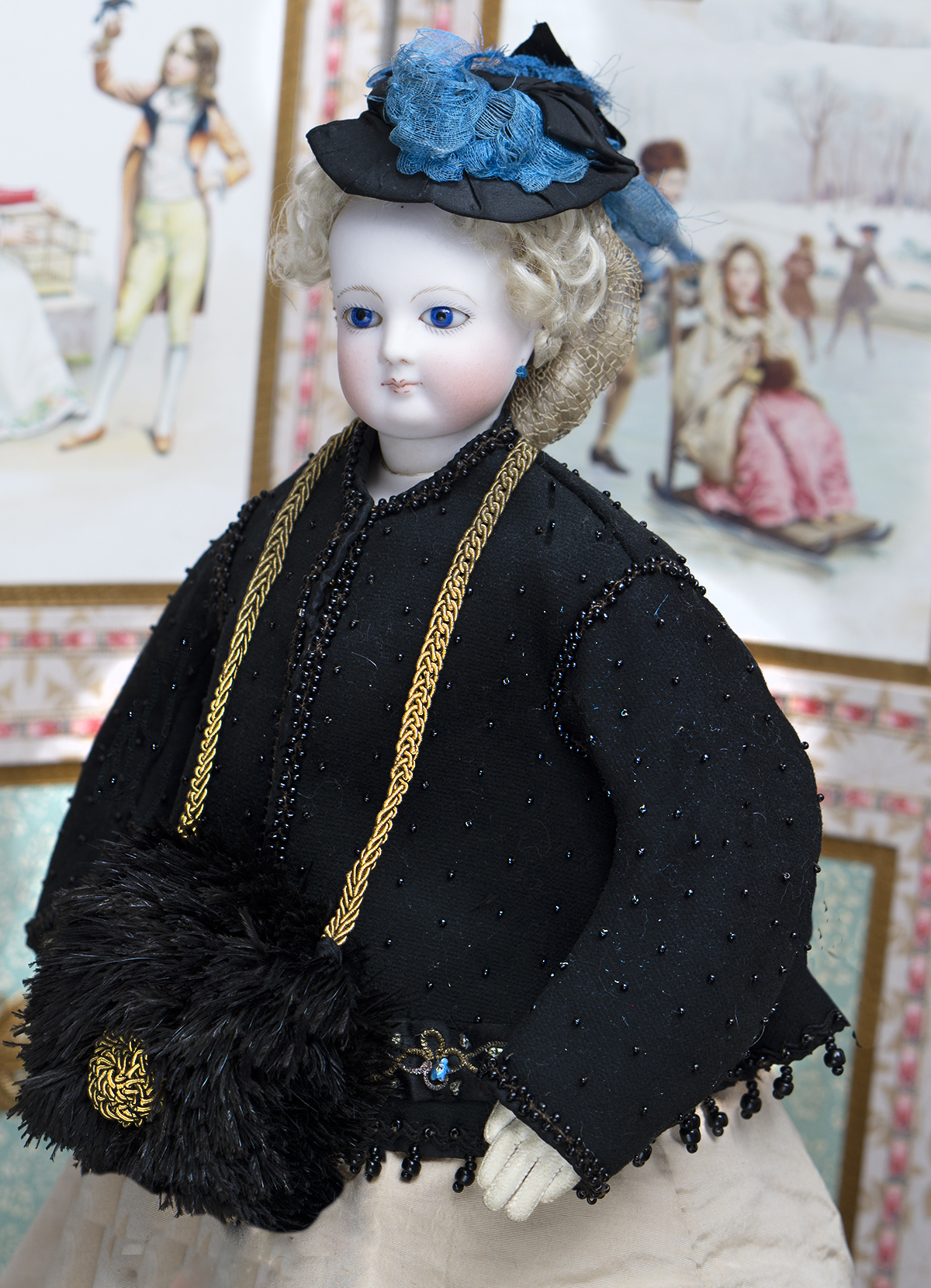 1/ Of soft black velvet all original jacket with fitted bodice, elongated back, trimmed with black braid ornamented with black beads, decorated with tiny beads and black silk ribbons with color glasses, gold metal thread embroidery and beads, closure at the front with hook and eye. Measures 7" (18cm) length, 5 1/2" (14cm) sleeve, 5 1/2" (14cm) shoulders, free waist. 2/ Antique black silk feather muff with gold metal cord lined with black silk. Measures 3" x 2.5" (7.5 X 6.5 cm), the cord 6 1/2" (17cm) height. 3/The matching black silk and straw hat decorated with blue gauze silk and black velvet ribbon. Measures 2" (5cm) wide inside and 3 1/2" (8cm) full wide. This set in good condition to age. French, c.1860. Measures The jacket 6in (15cm) length, 4 1/2" (11.5cm) shoulders, 4" (10cm) sleeve, free waist. the hat 2 1/2" (5.5 cm) height, 2" (5cm) wide inside amd 3 1/2" (8,5cm) wide including hat brim. Fit for fashion doll about 16-17in tall. I DO A LAYAWAY. No any sales tax. International shipping cost $45.00 Payment by PayPal, wire transfer. Please email me if you have any questions. Thanks for your visit to Respectfulbear doll shop. ------------------------------------ I DO A LAYAWAY NO STATE SALES TAX! Thanks for your visit to Respectfulbear doll shop!