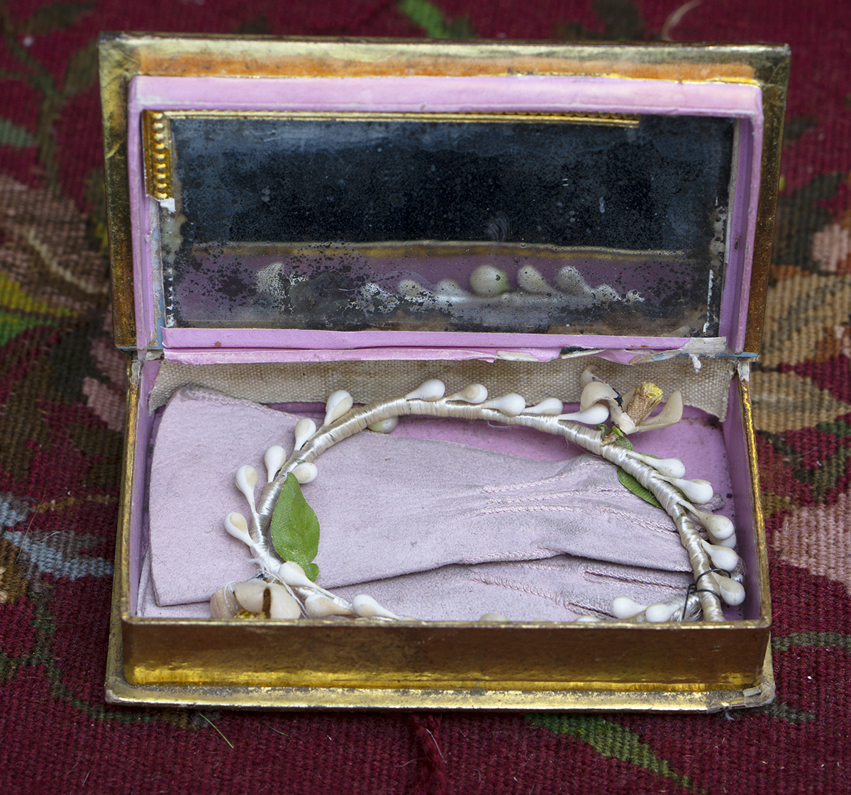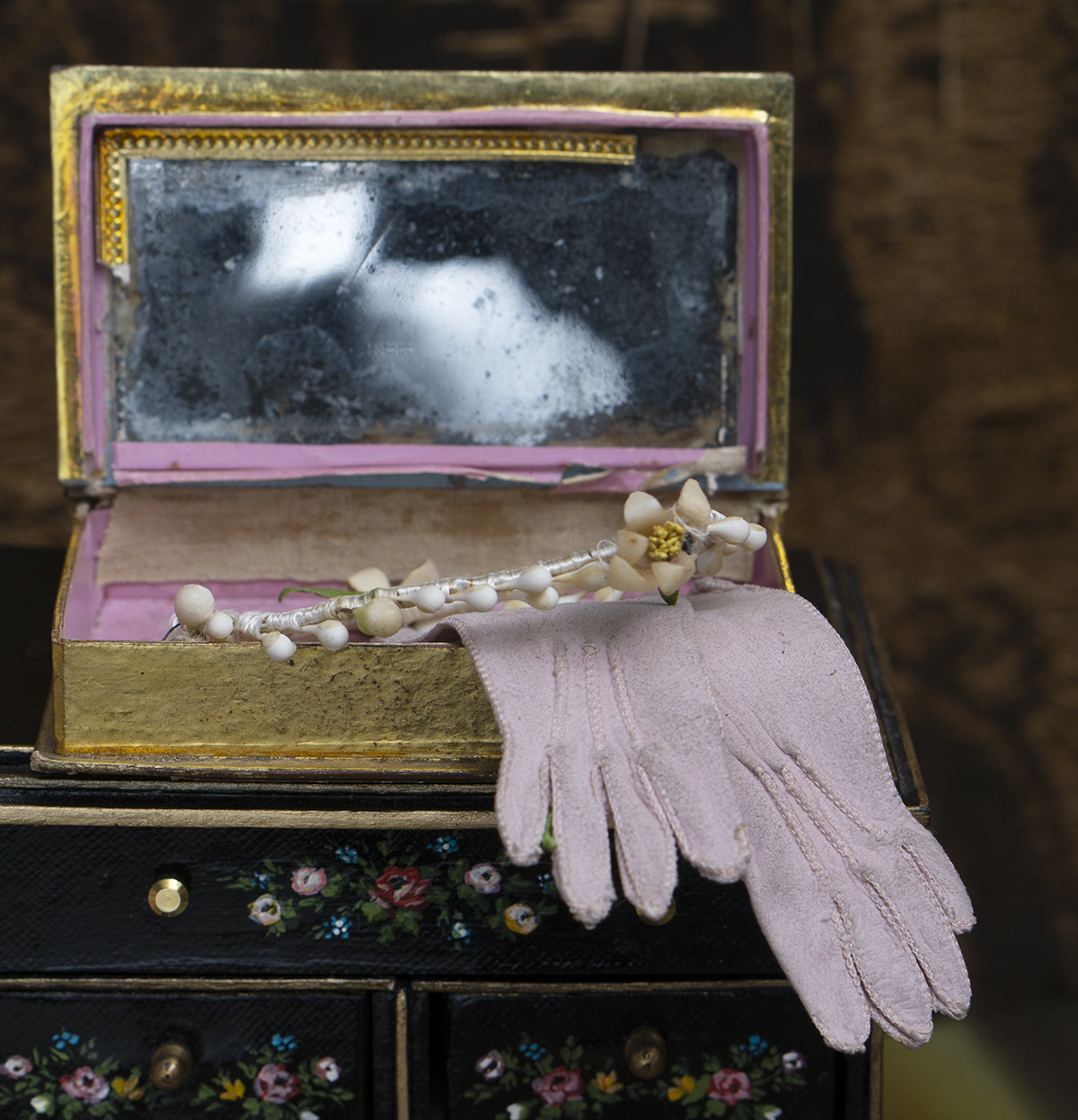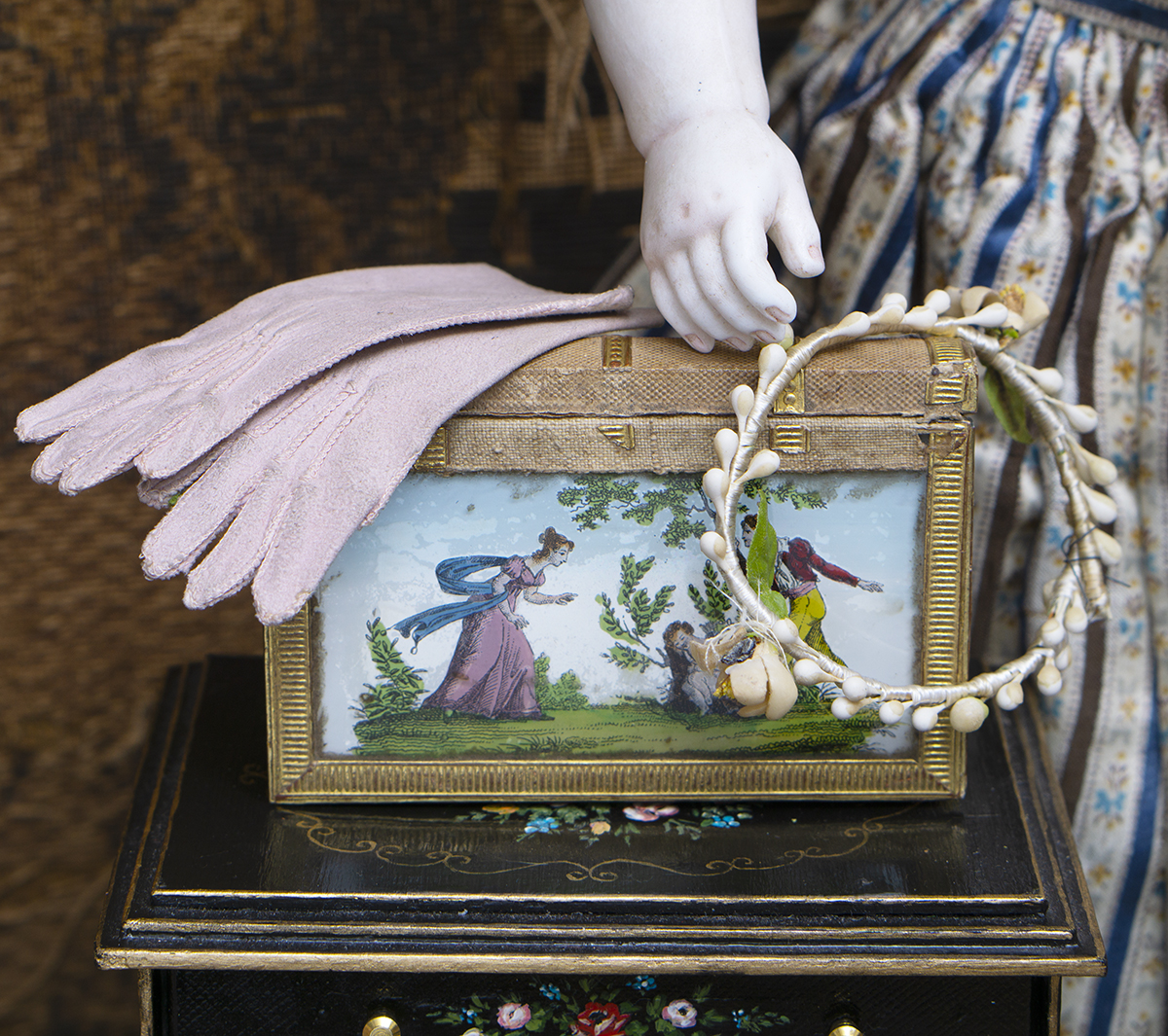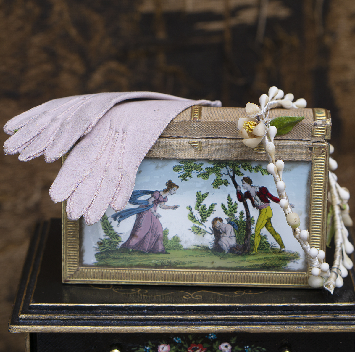 Antique french beige kidskin gloves and wax headdress for fashion doll in original presentation box with mirror, hand painted picture under the glass, decorated with gold paper.