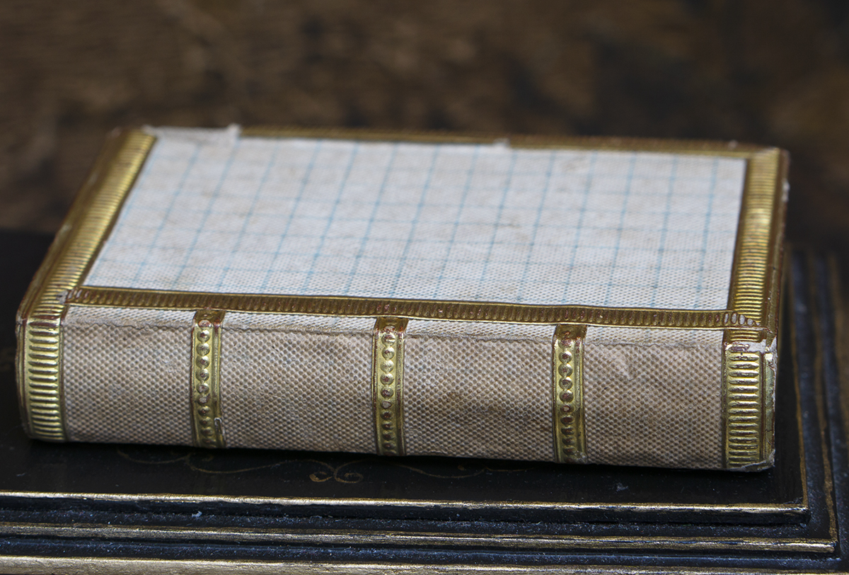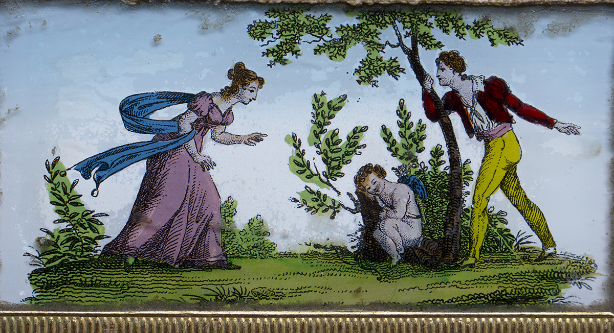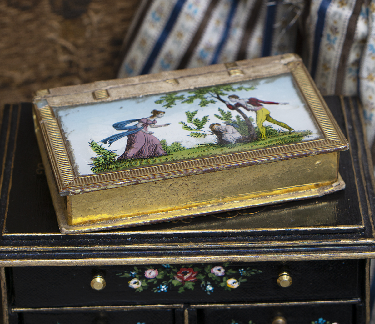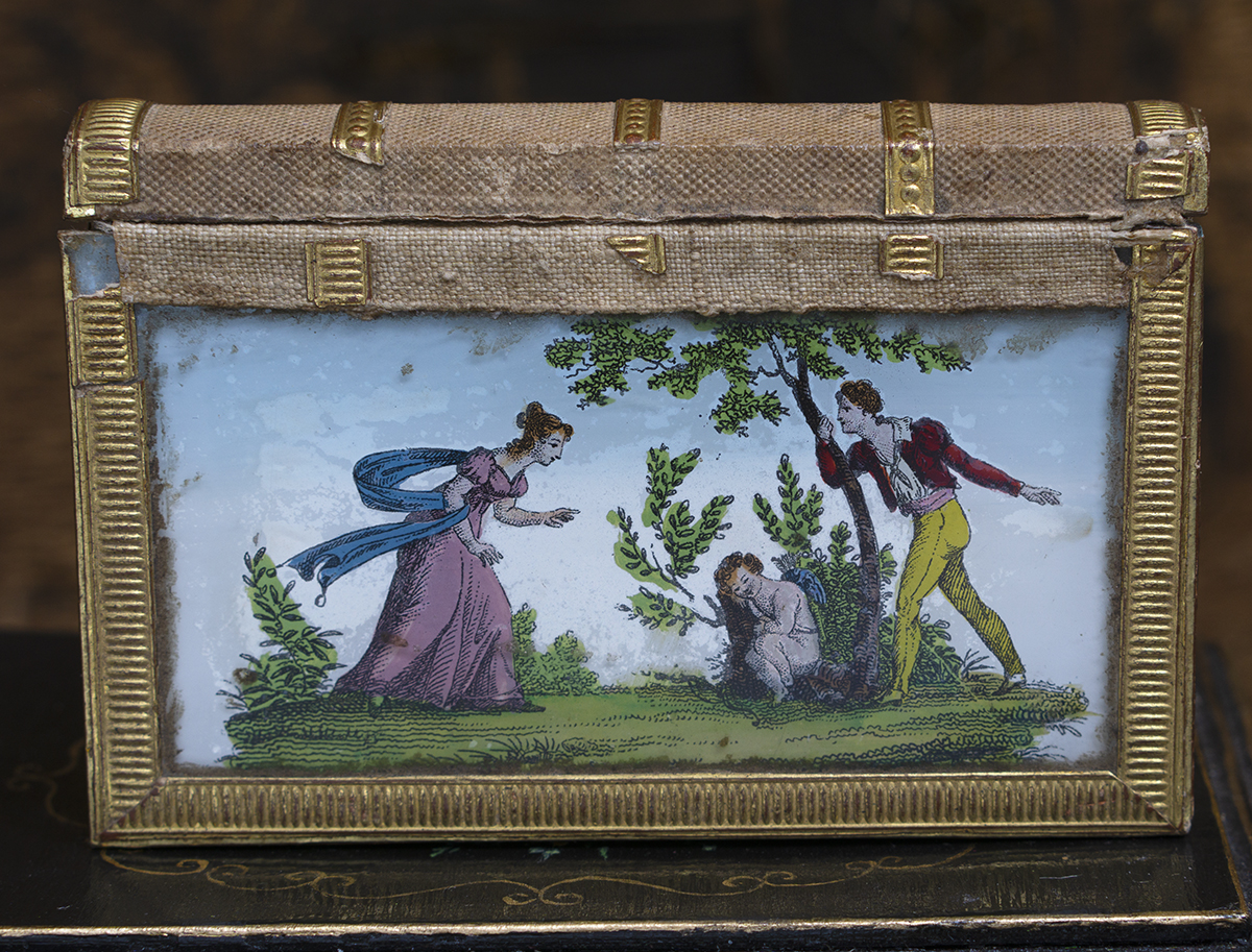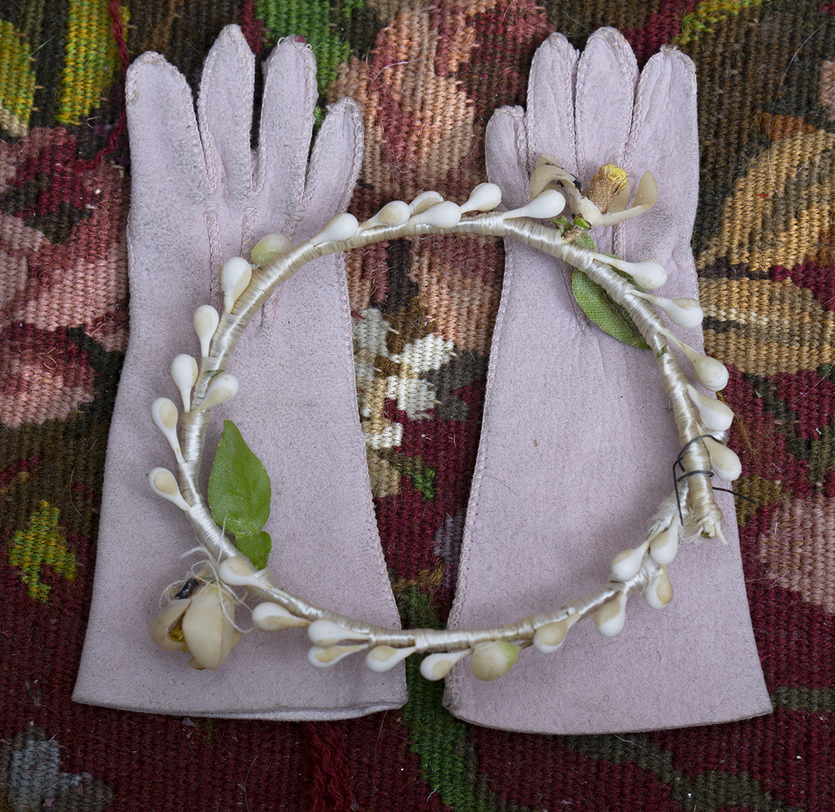 Antique french beige kidskin gloves and wax headdress for fashion doll in original presentation box with mirror, hand painted picture under the glass, decorated with gold paper.