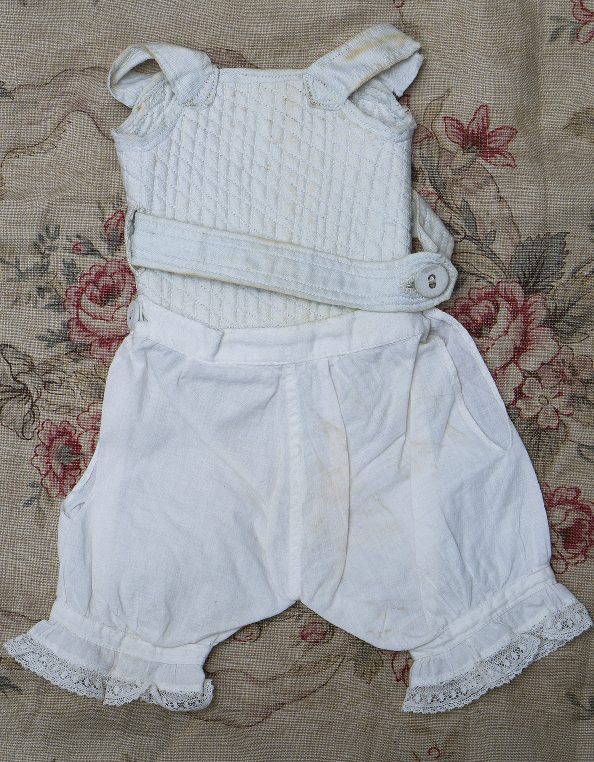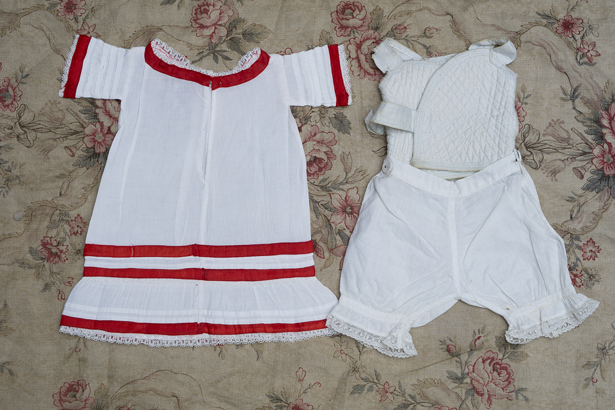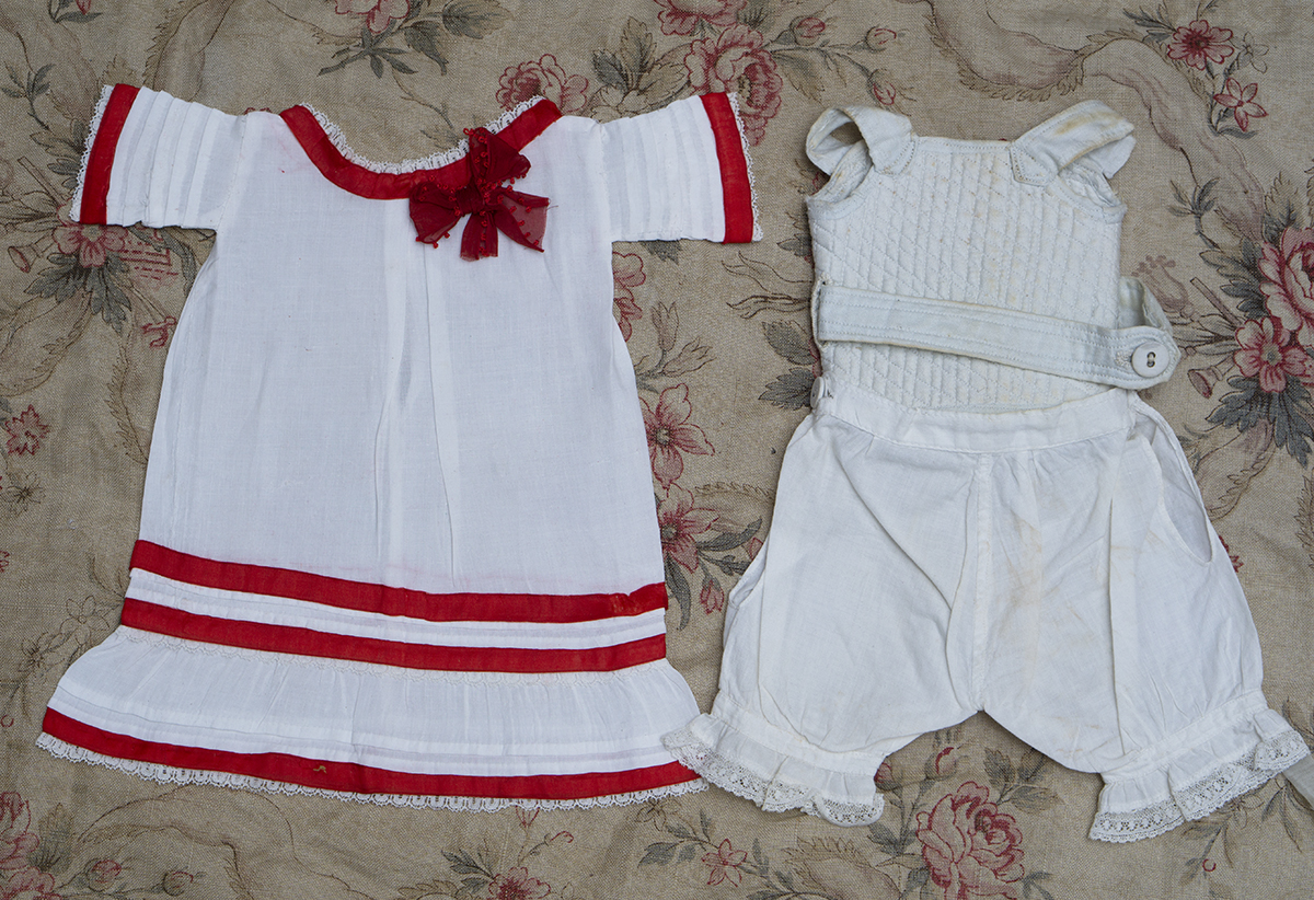 Antique original set consist of 3 pieces: original cotton chemise decorated with red silk ribbon and closure at the back with hook and eye, original silk corset /stay, original pantaloon with lace edging.