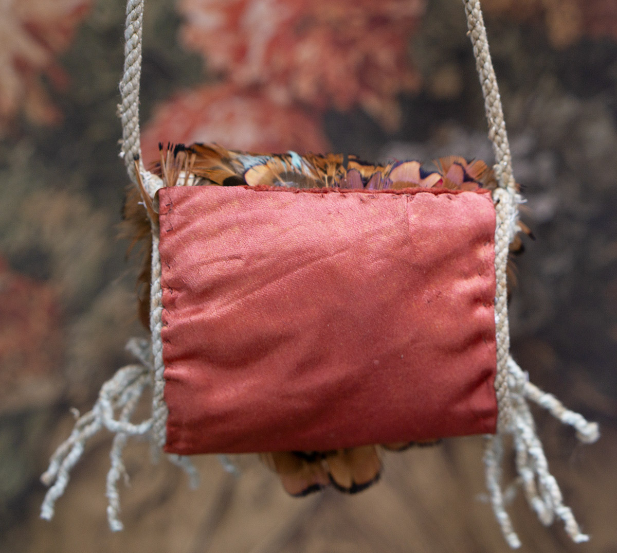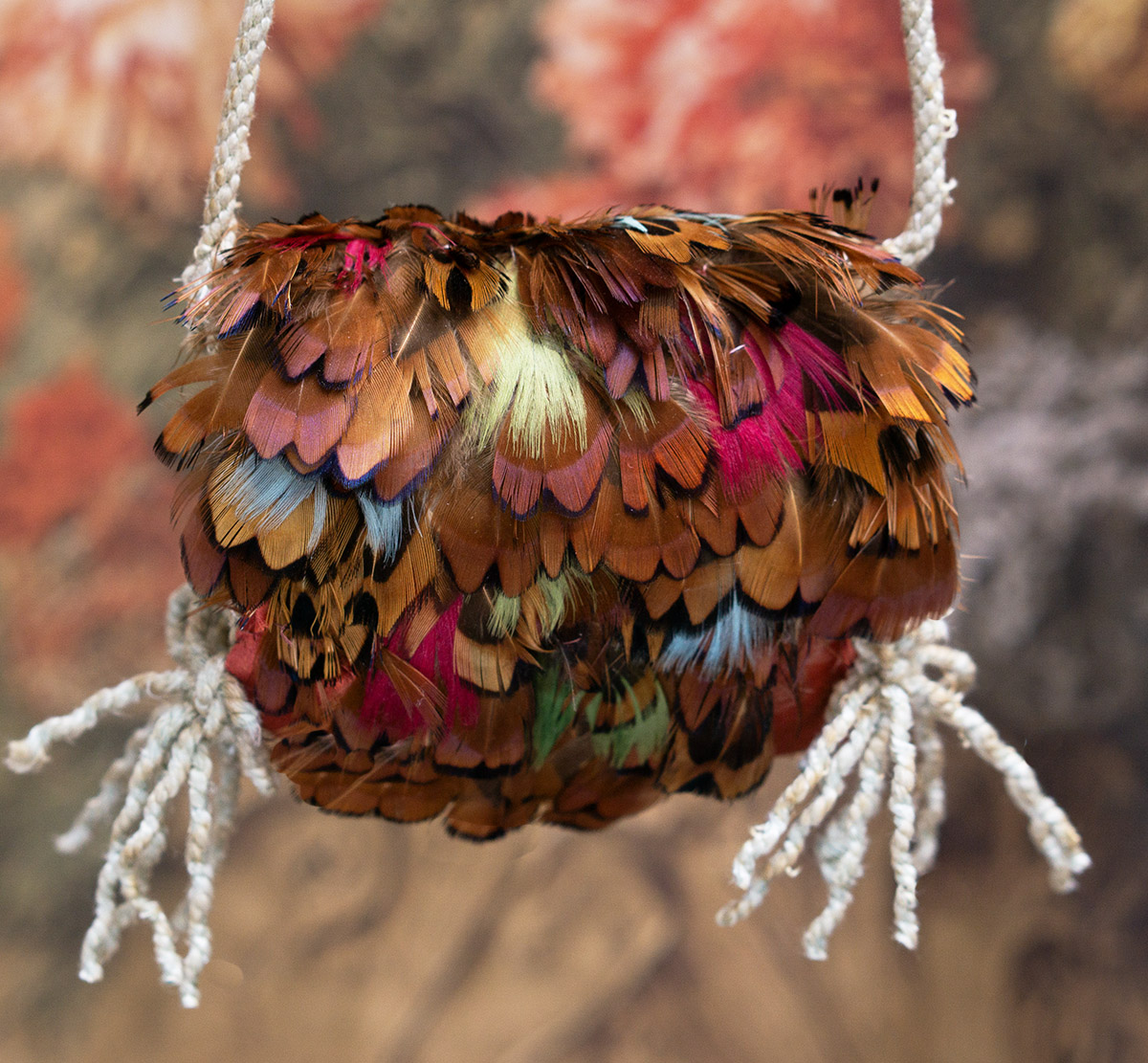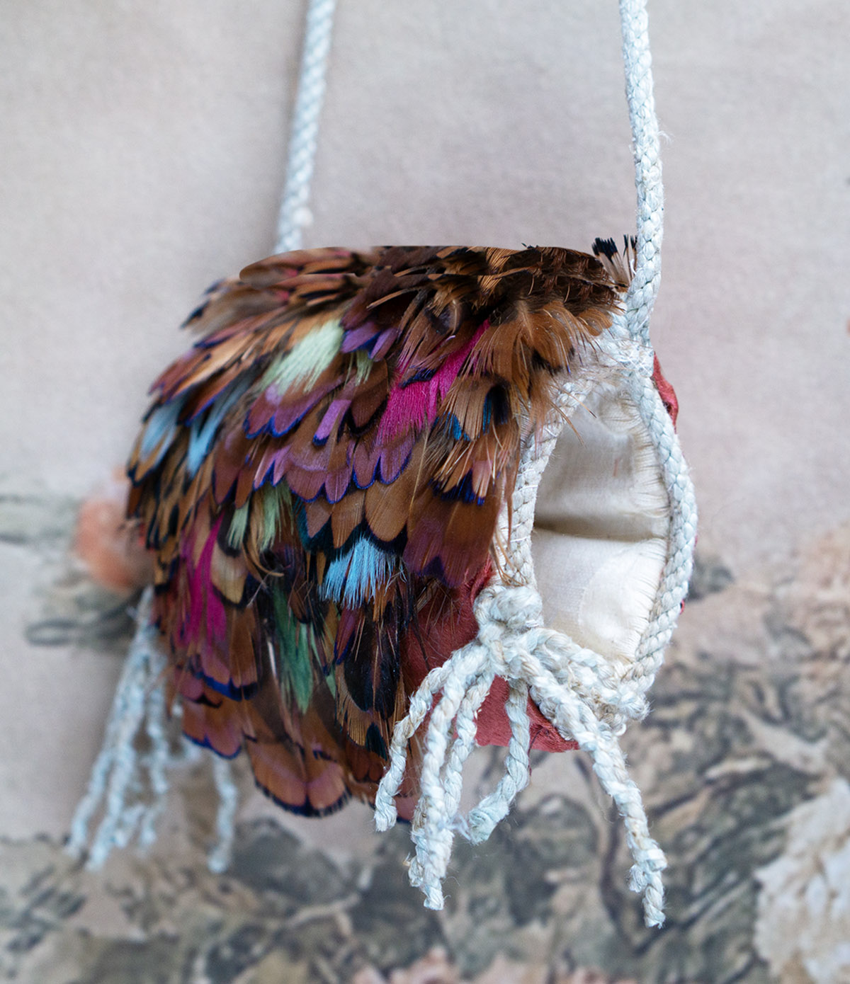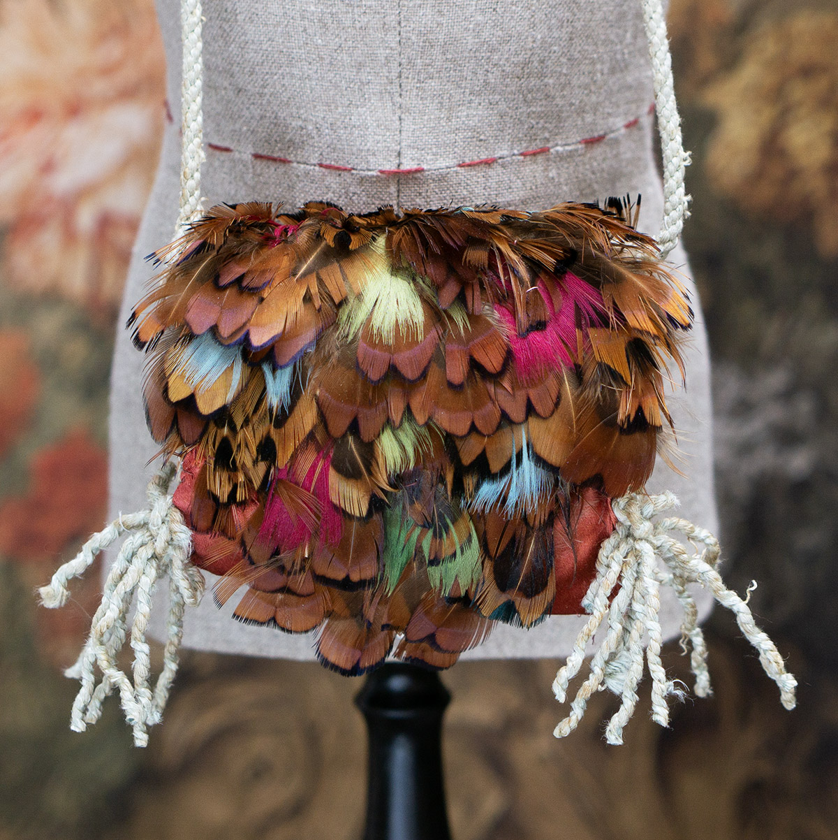 Very beautiful multi-colored feather padded muff with aqua tips, silk lining, cord tie, and red-brown silk back.