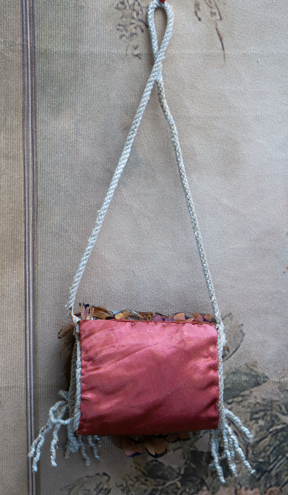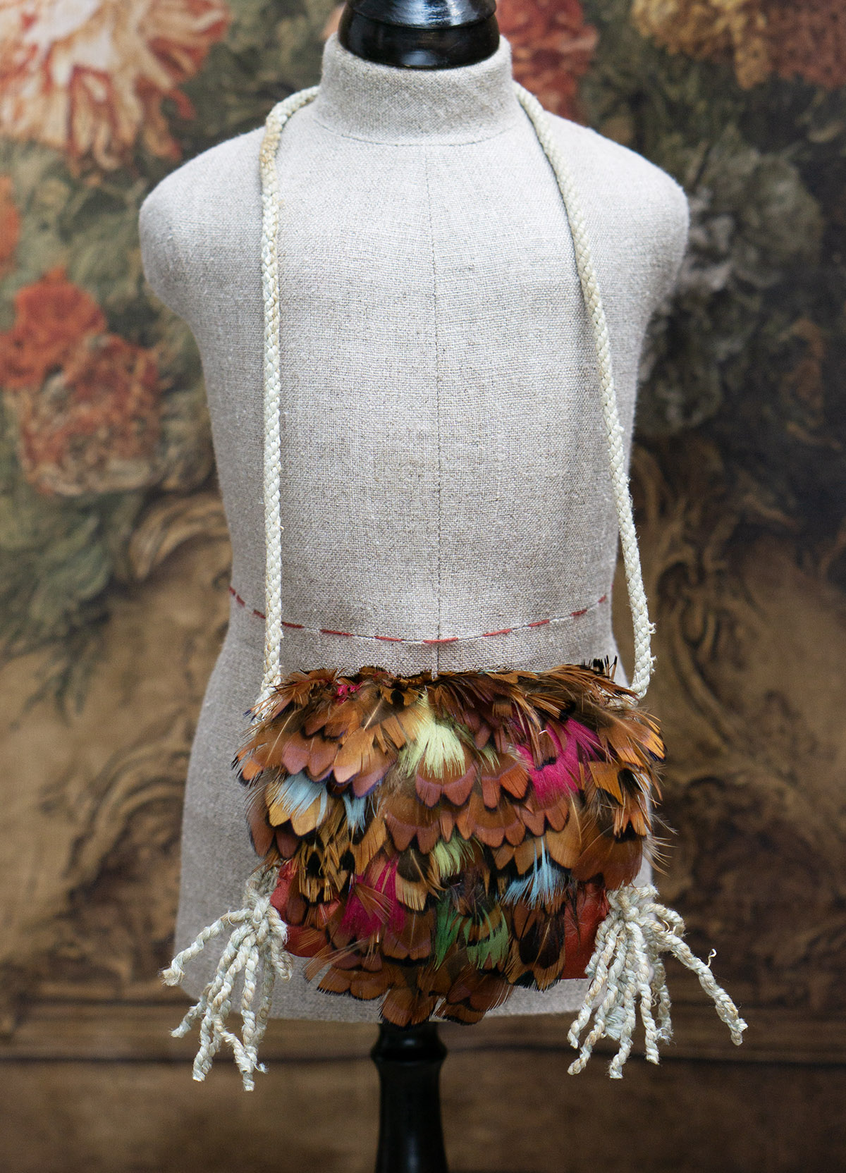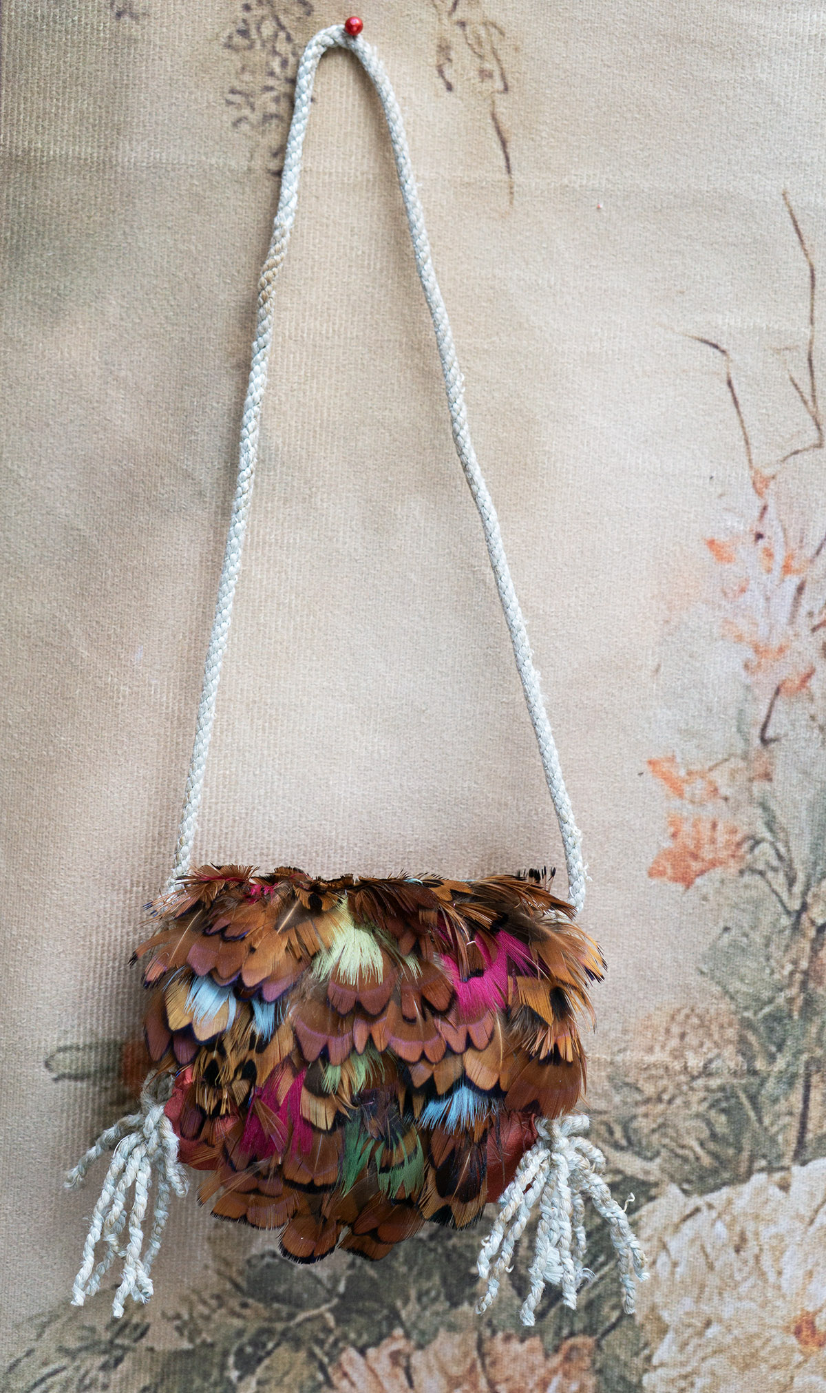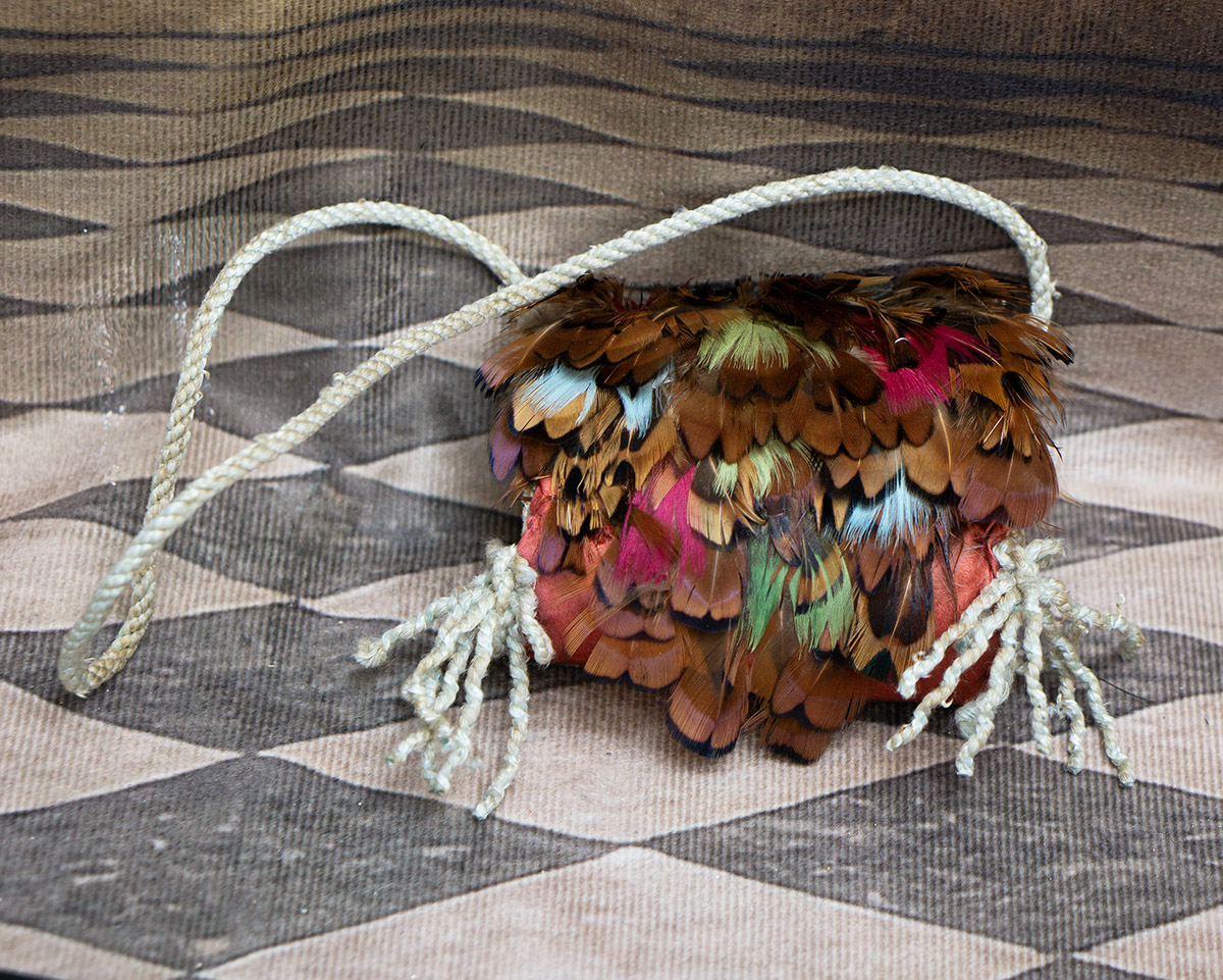 Very beautiful multi-colored feather padded muff with aqua tips, silk lining, cord tie, and red-brown silk back.