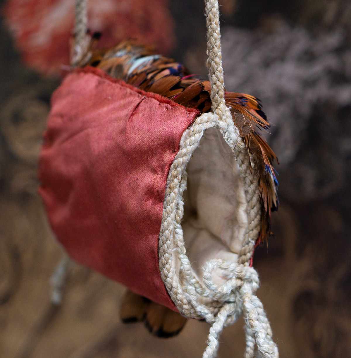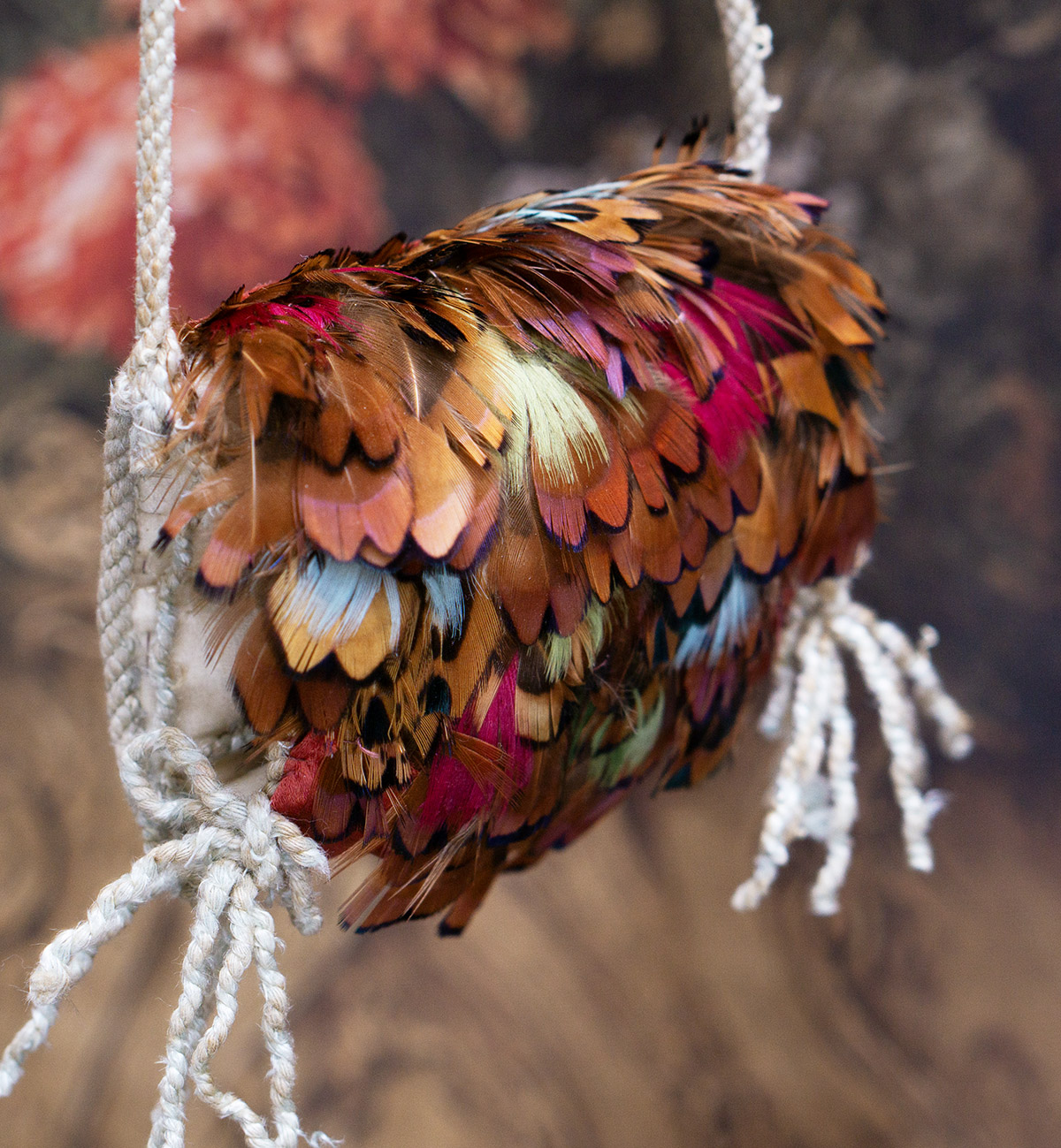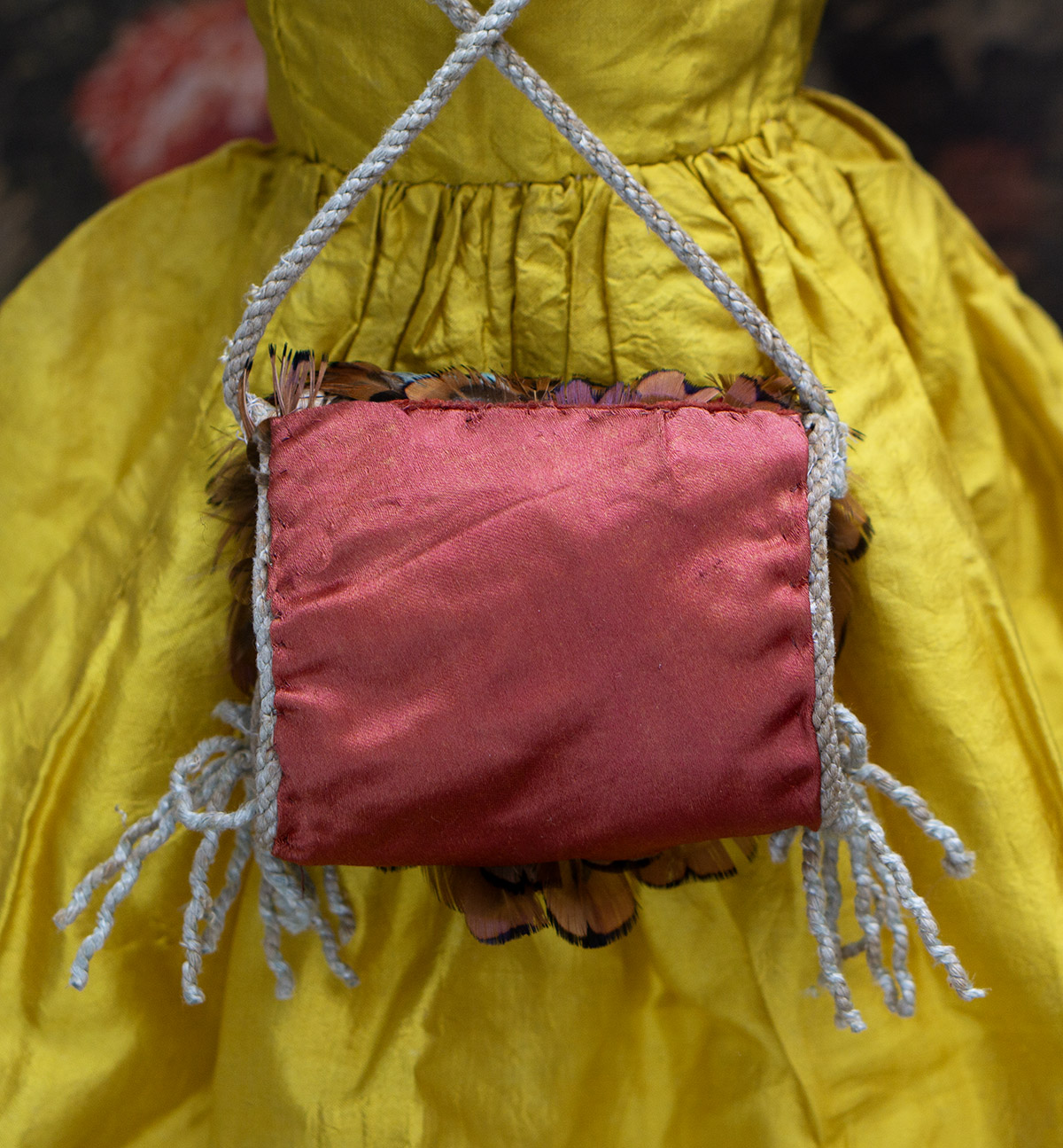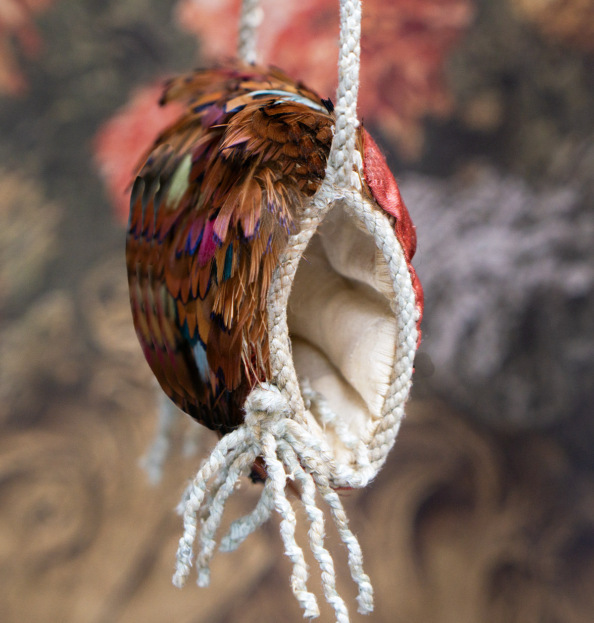 Very beautiful multi-colored feather padded muff with aqua tips, silk lining, cord tie, and red-brown silk back.