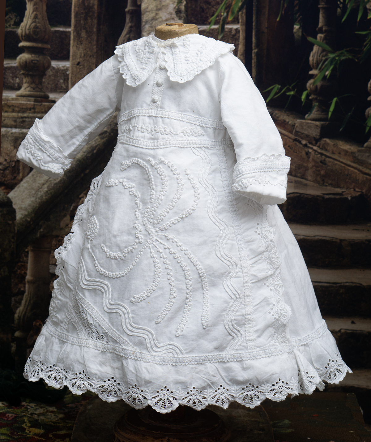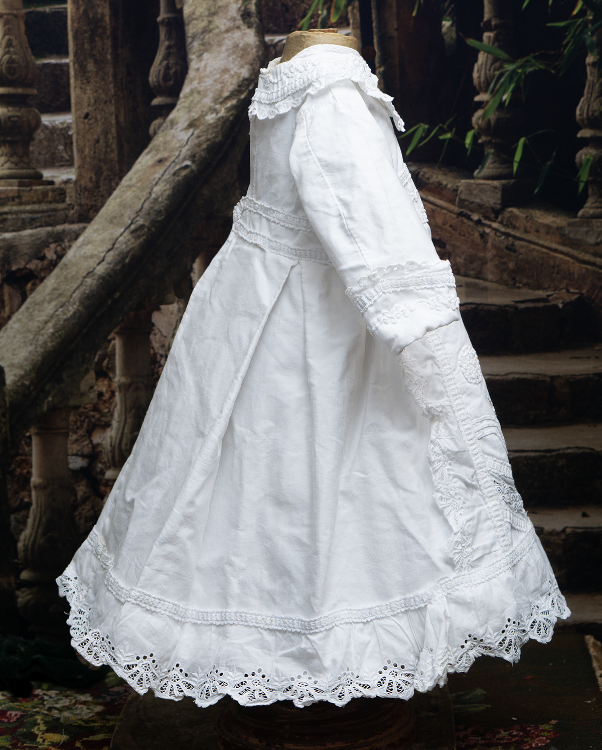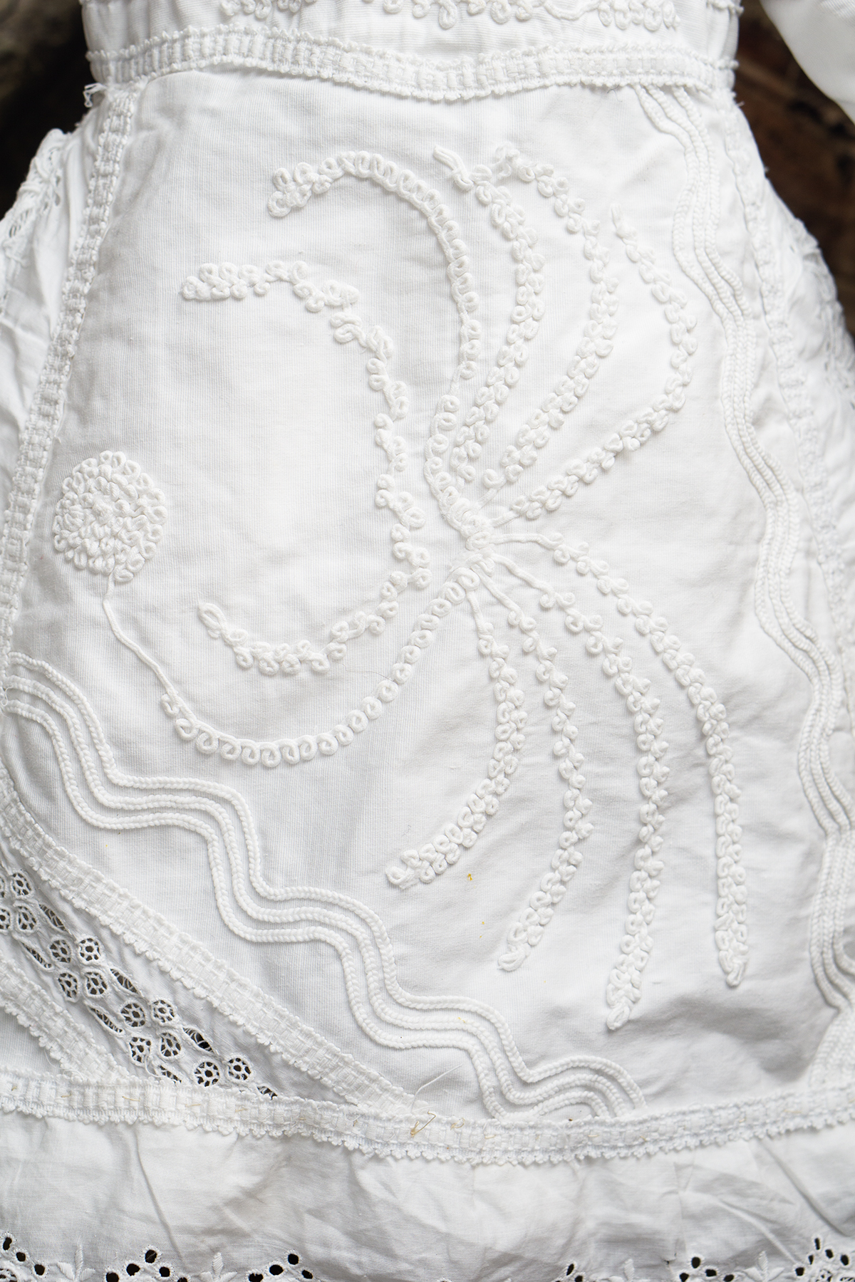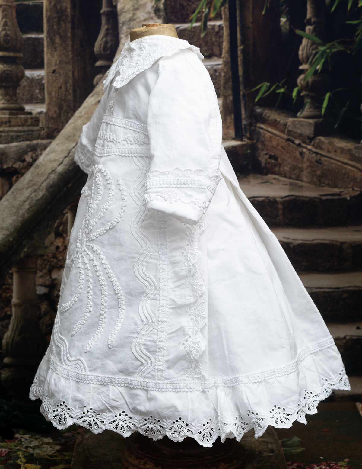 Of narrow horizontally-banded white cotton pique, the high-waisted dress has box-pleated back skirt with cotton lace edging, flat-cut flared front panel with cotton lace, elaborate overall soutache trim, long coat sleeves with cuffs, rounded collar, two pearl buttons closure at the back.