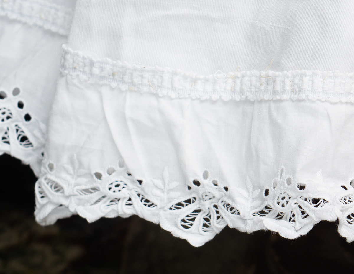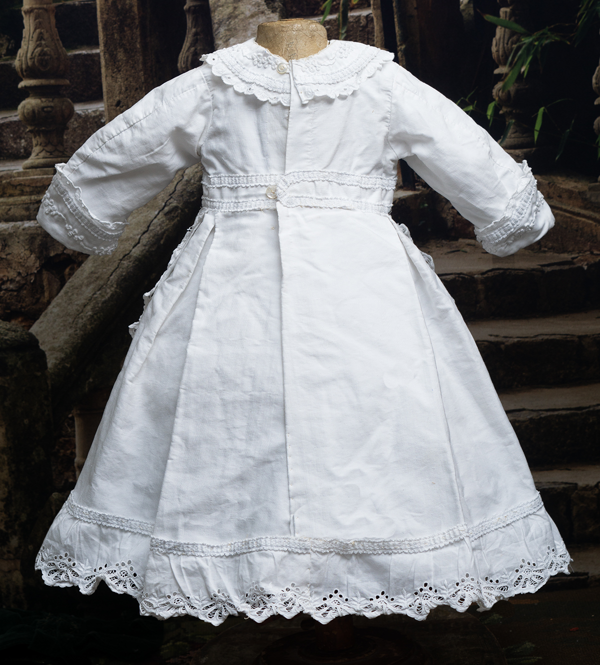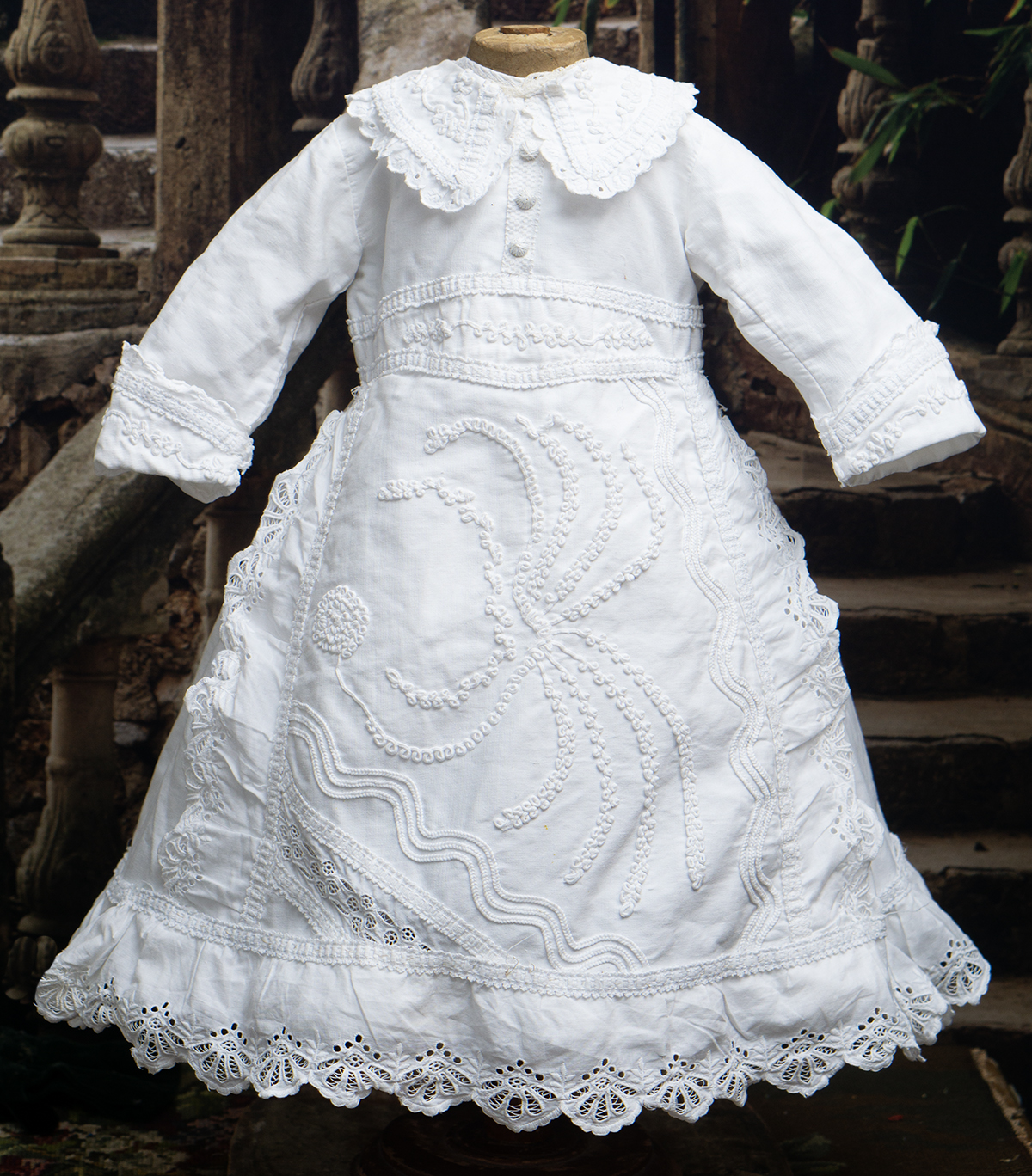 Of narrow horizontally-banded white cotton pique, the high-waisted dress has box-pleated back skirt with cotton lace edging, flat-cut flared front panel with cotton lace, elaborate overall soutache trim, long coat sleeves with cuffs, rounded collar, two pearl buttons closure at the back.