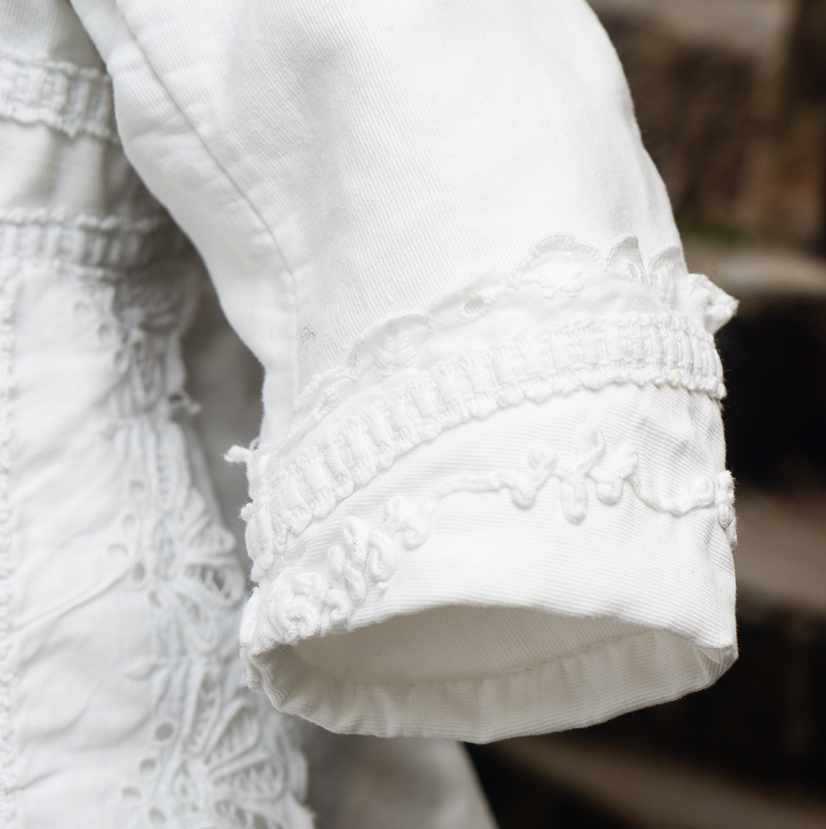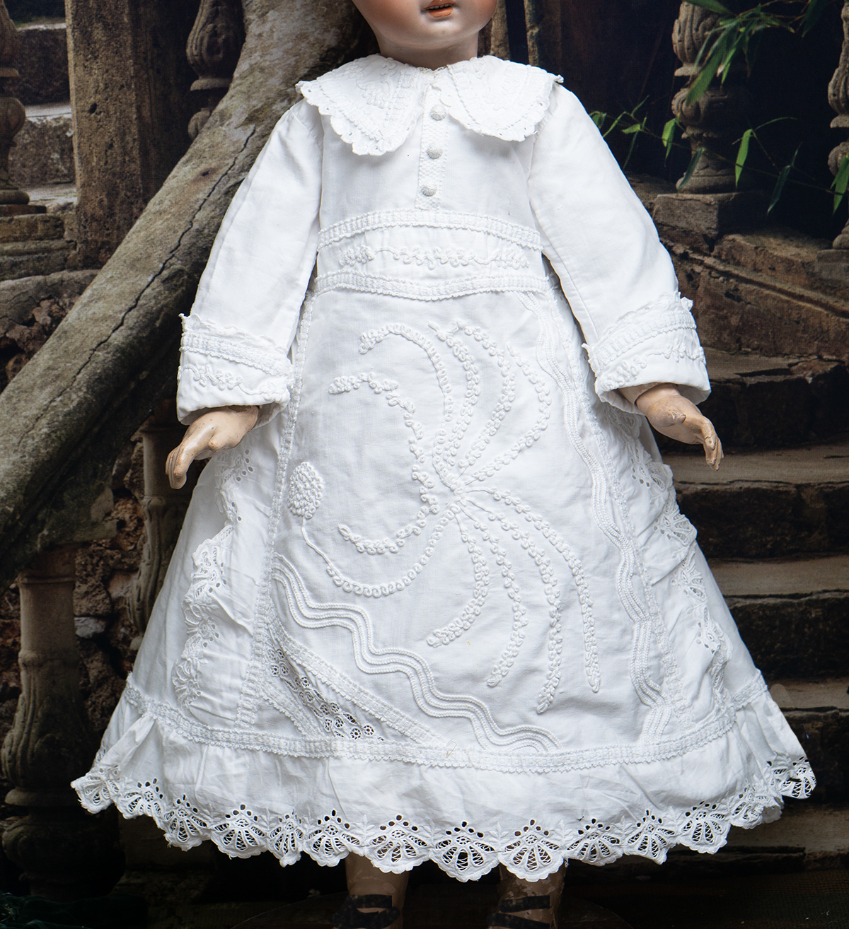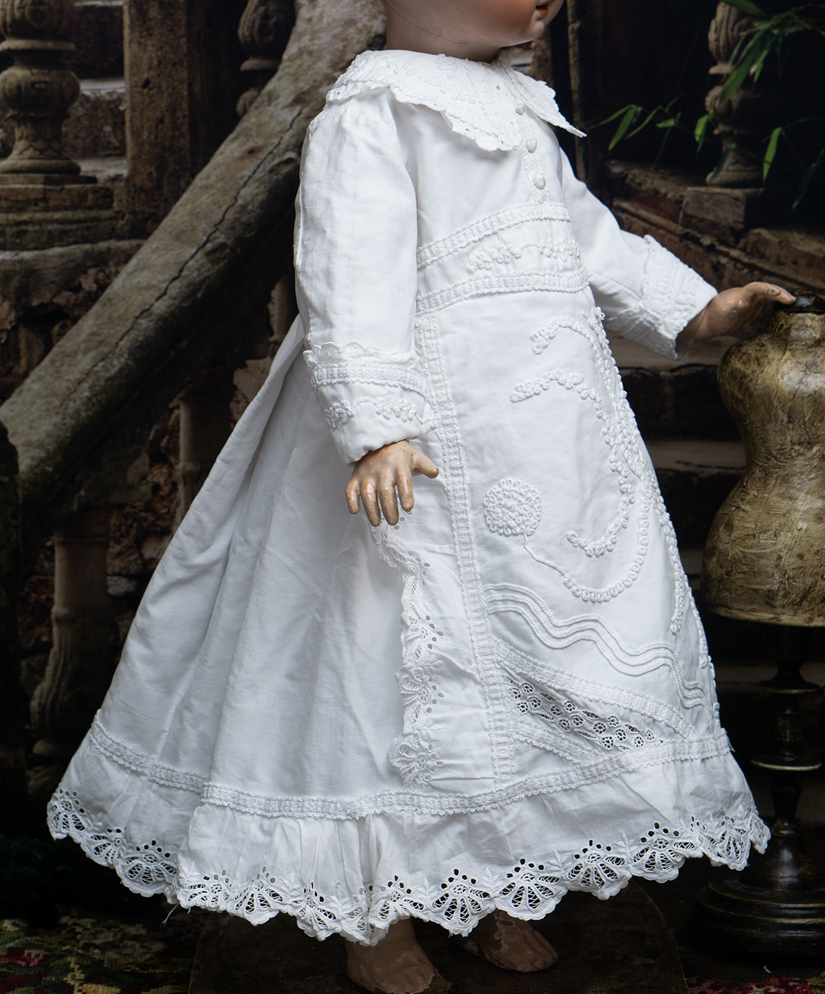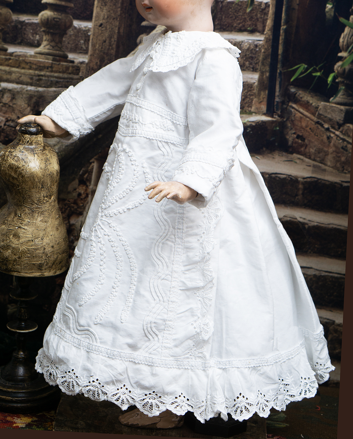Of narrow horizontally-banded white cotton pique, the high-waisted dress has box-pleated back skirt with cotton lace edging, flat-cut flared front panel with cotton lace, elaborate overall soutache trim, long coat sleeves with cuffs, rounded collar, two pearl buttons closure at the back.