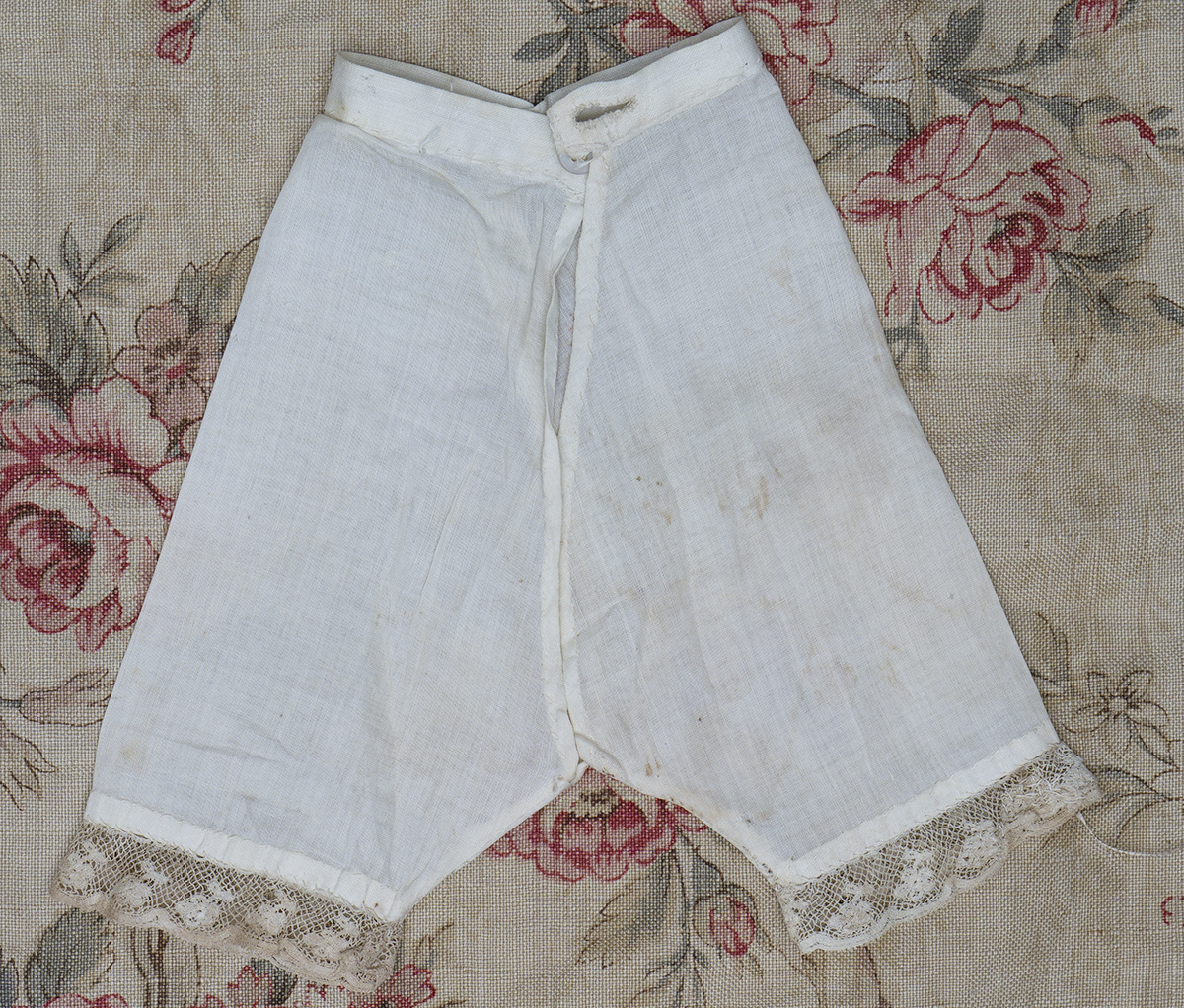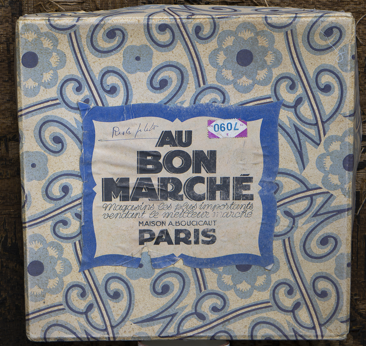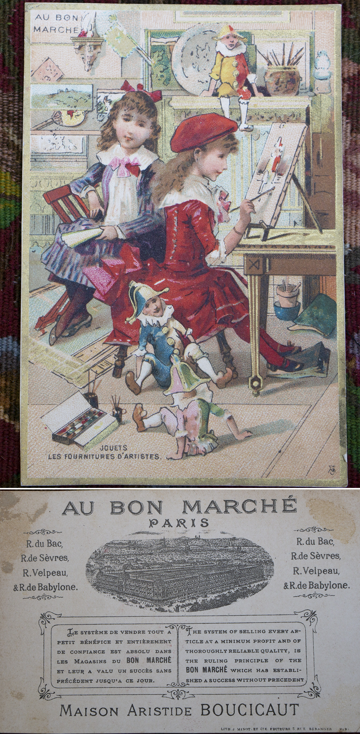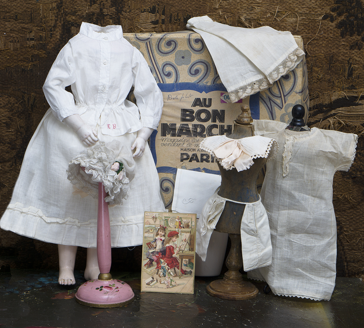 Wonderful original set clothes for fashion doll in original "Au Bon Marche" box with trade card consist of 9 pieces: the chemise, pantaloon, petticoat, pique collar, lace bonnet, blouse, two handkerchiefs, underskirt pockets.