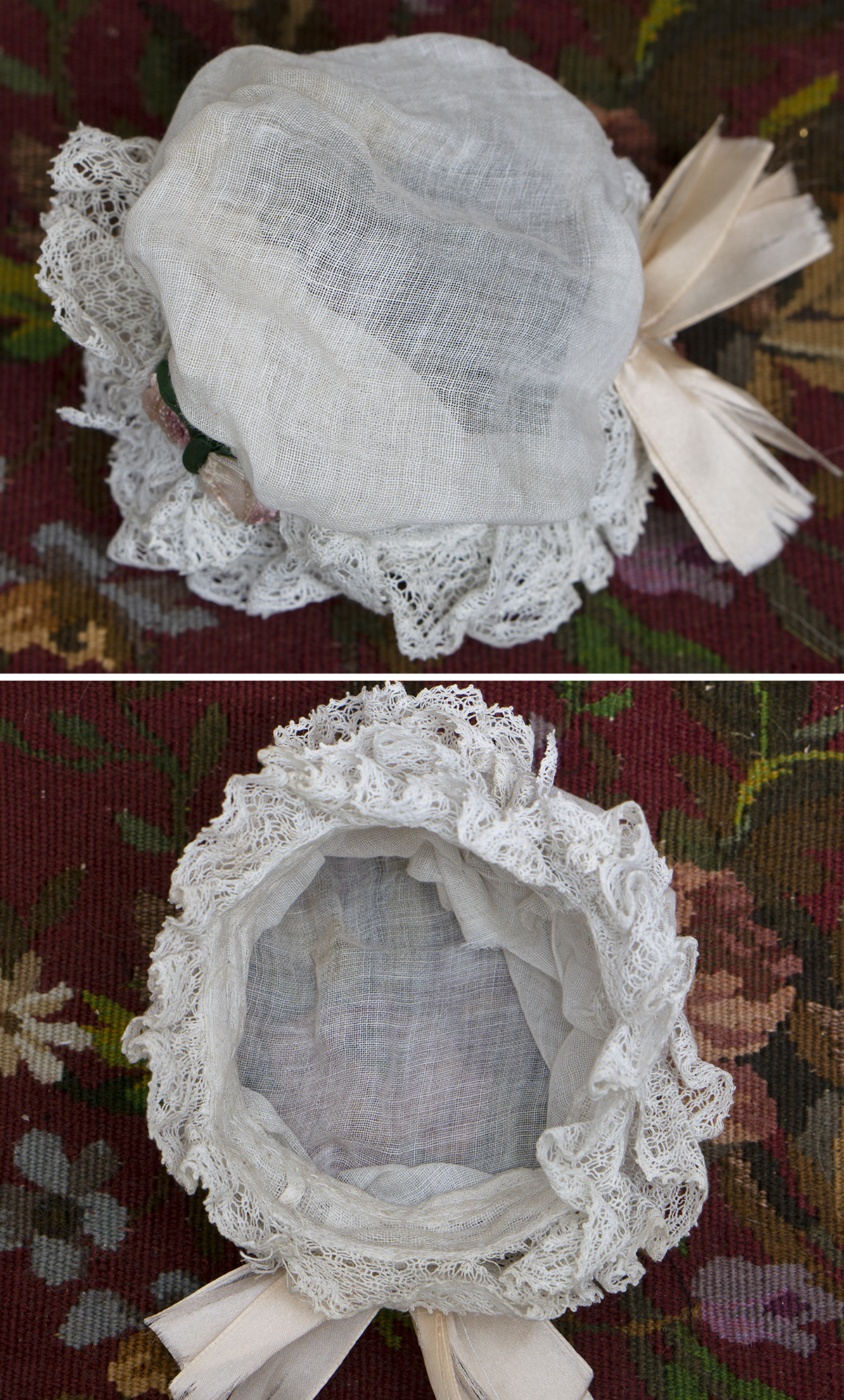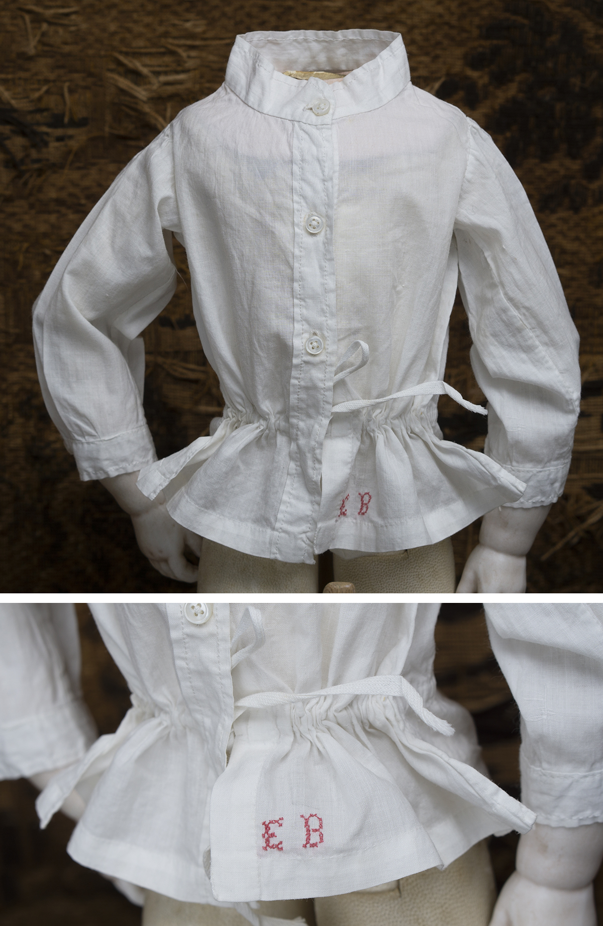 All pieces are hand stitched!! 1/ A very beautiful antique batiste chemise features short sleeves, hook and eye closure. Measures 9 1/2" (24 cm) length, 10" (25 cm) chest. 2/ A very full antique white batiste petticoat with pleats and white cord. Measures 8 1/2" (22 cm) length, the waist adjusting with cord. 3/ Antique white cotton pantaloon closure at the waist with pearl button, measures 6 3/4" (17cm) length, 7" (18 cm) waist. 4/ Antique white lace bonnet decorated with two silk roses and silk bow, measures 2 1/2" (6 cm) wide inside. 5/ The white pique collar closure at the back with pearl buttons, decorated with pink silk bow. Measures 4" (10 cm) wide. 6/ Original white cotton blouse with long sleeves, decorated with red embroidered monogram E.B. Measures 6 1/2" (16cm) height, 5" (12.5cm) sleeve, 12" (30cm) chest, 4 1/2" (12cm) shoulders. 7/ White cotton handkerchief with white monogram 5 1/2" x 5 1/2" (14x14cm). 8/ Two small pockets 3 1/2" (9cm) height with matching small handkerchief. The set has french trade card and original presentation box of AI BON MARCHE. Measures of the box 10 1/2" (27 cm) x 10 1/2" (27 cm) x 2" (5 cm). The trade card 4 1/2" x 3" (11.5cm x 7.5cm) Fit for french fashion doll 17-18in tall. All items in good condition to age France, Paris, c.1890. ------------------------ I DO A LAYAWAY (max. 3 months for this item) International shipping cost $45.00 NO ANY SALES TAX! Please email me if you have any questions or need more photos. Thanks for your visit to Respectfulbear doll shop. ------------------------------------ I DO A LAYAWAY NO STATE SALES TAX! Thanks for your visit to Respectfulbear doll shop!