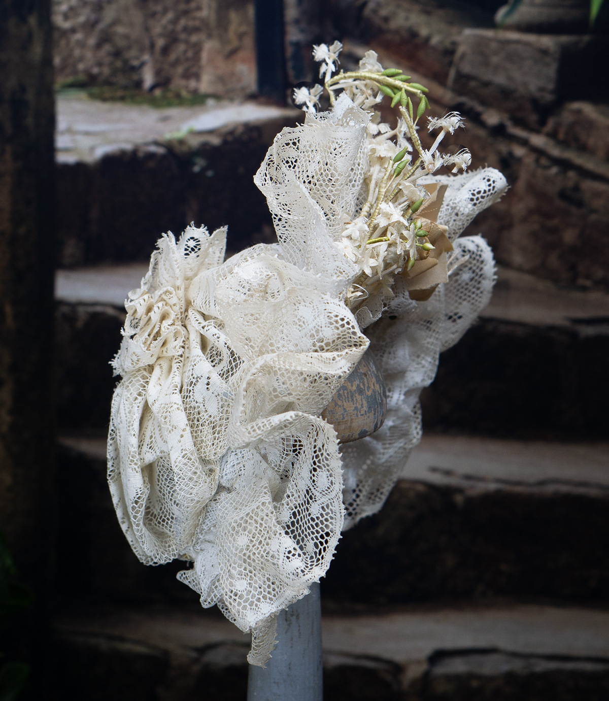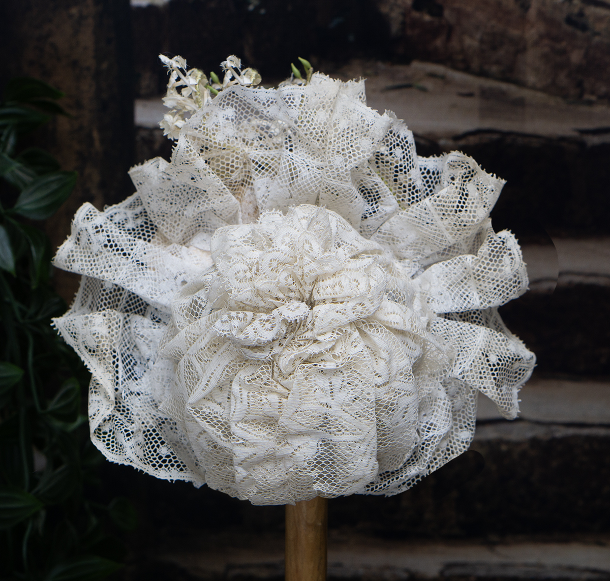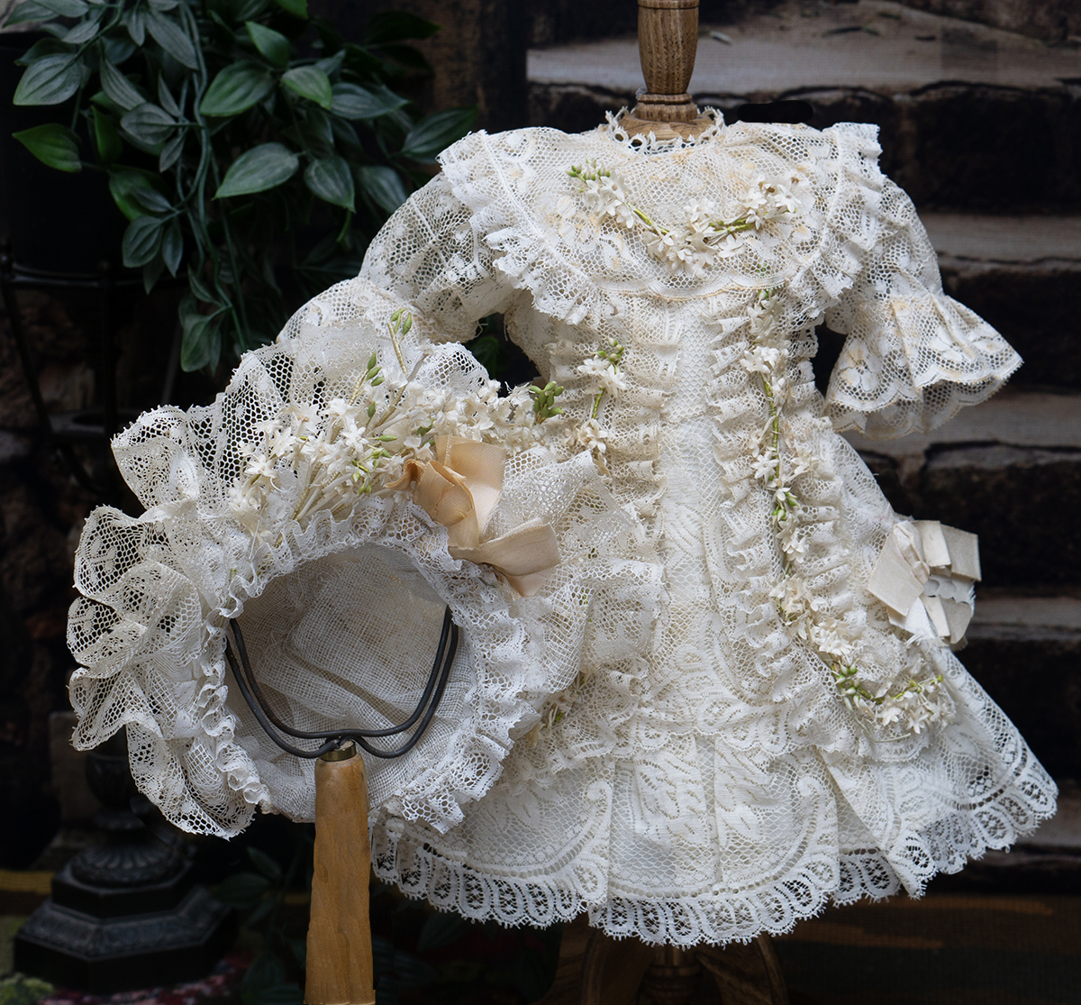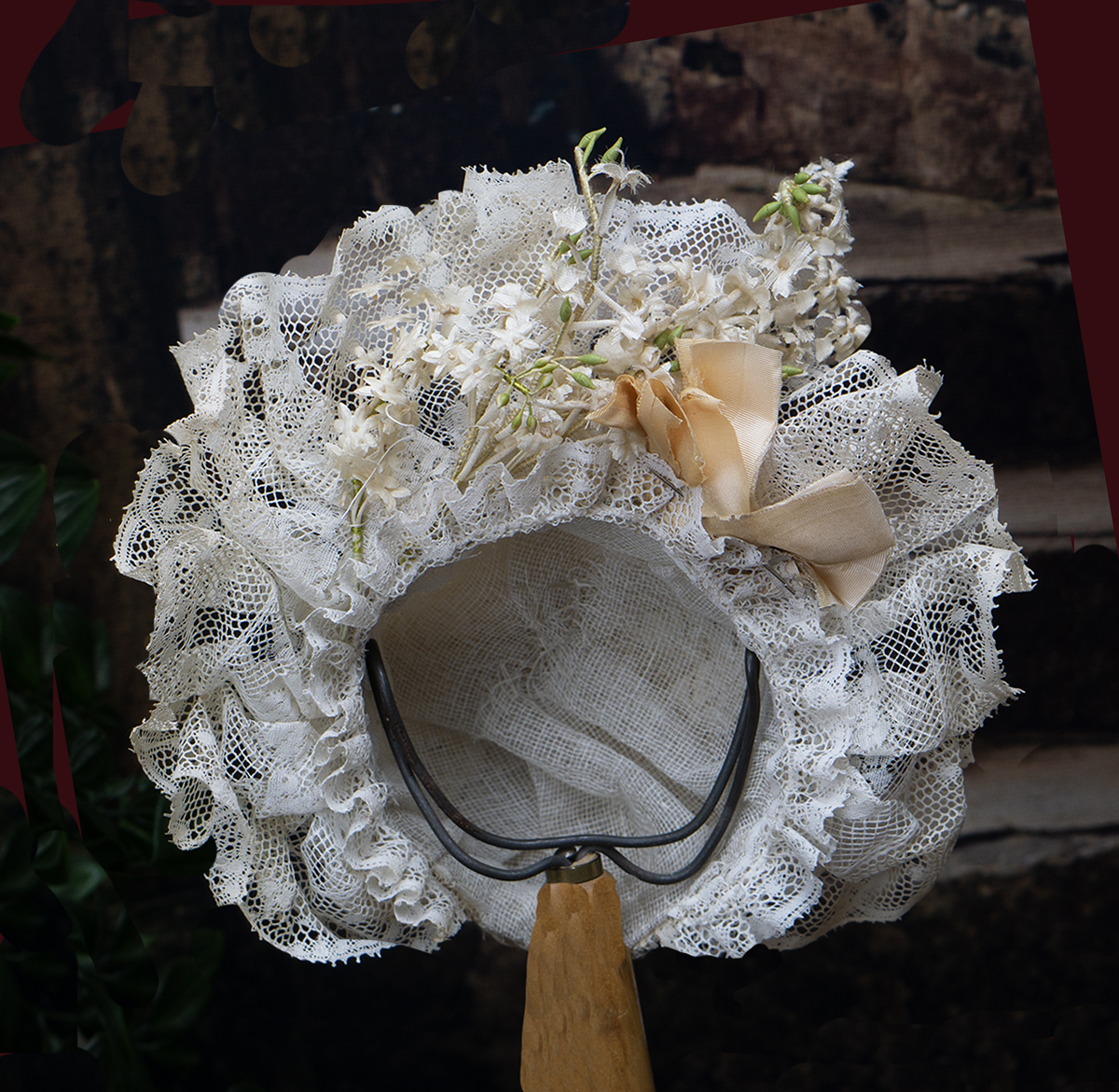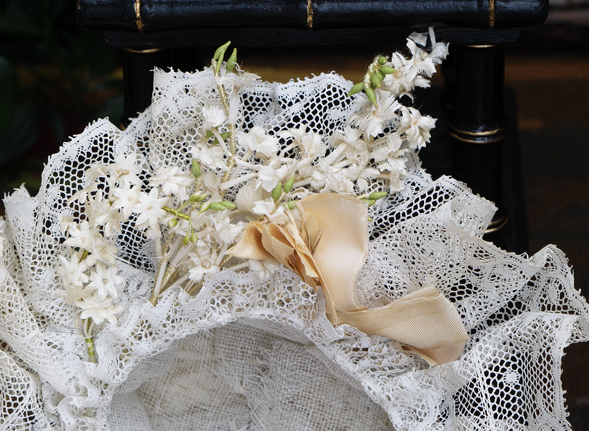 Wonderful all original wire framed french lace bonnet has box-pleated lace framing the face, fully hand stitched, decorated with small flowers and silk bow, lined with tarlatan.