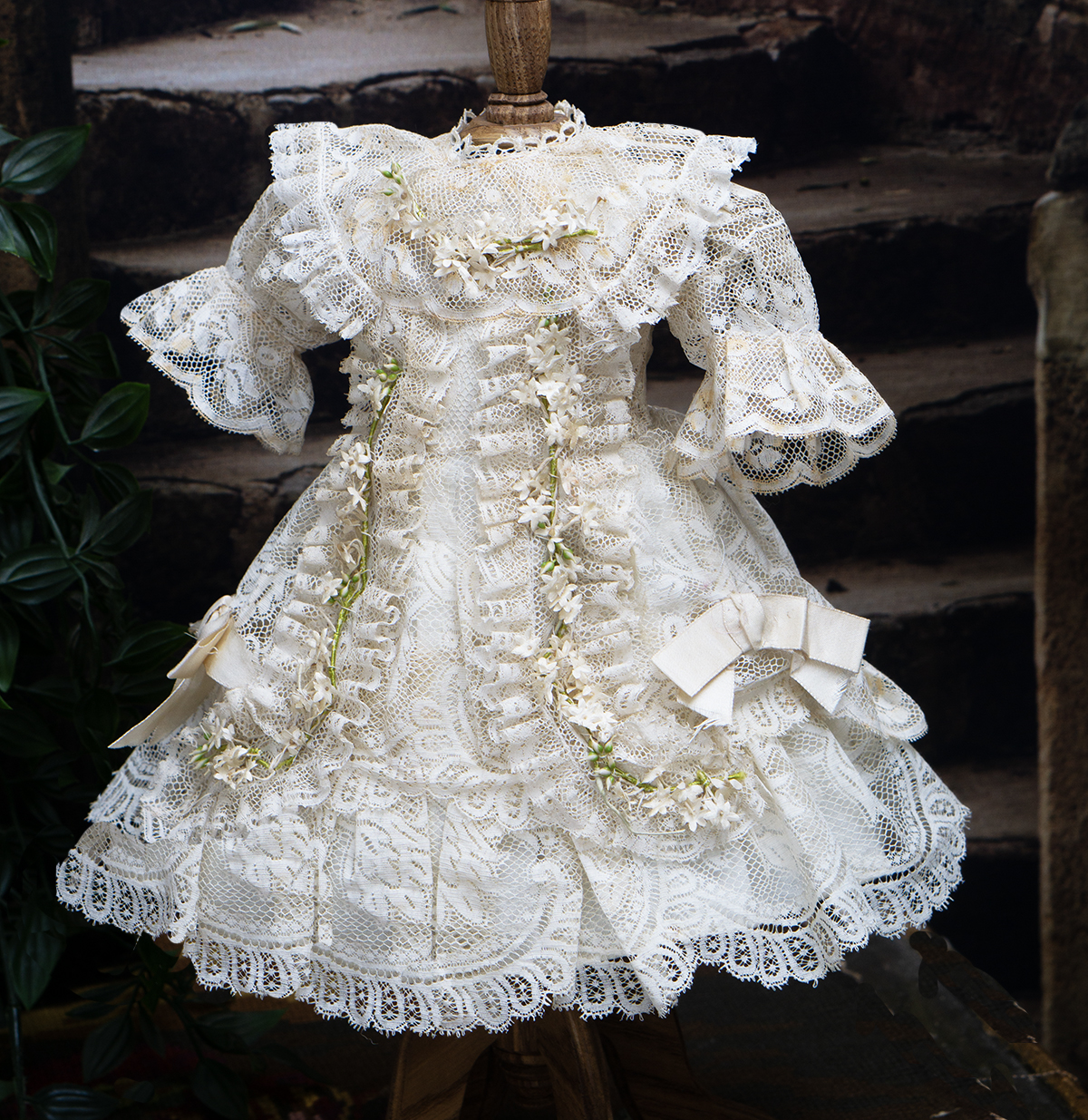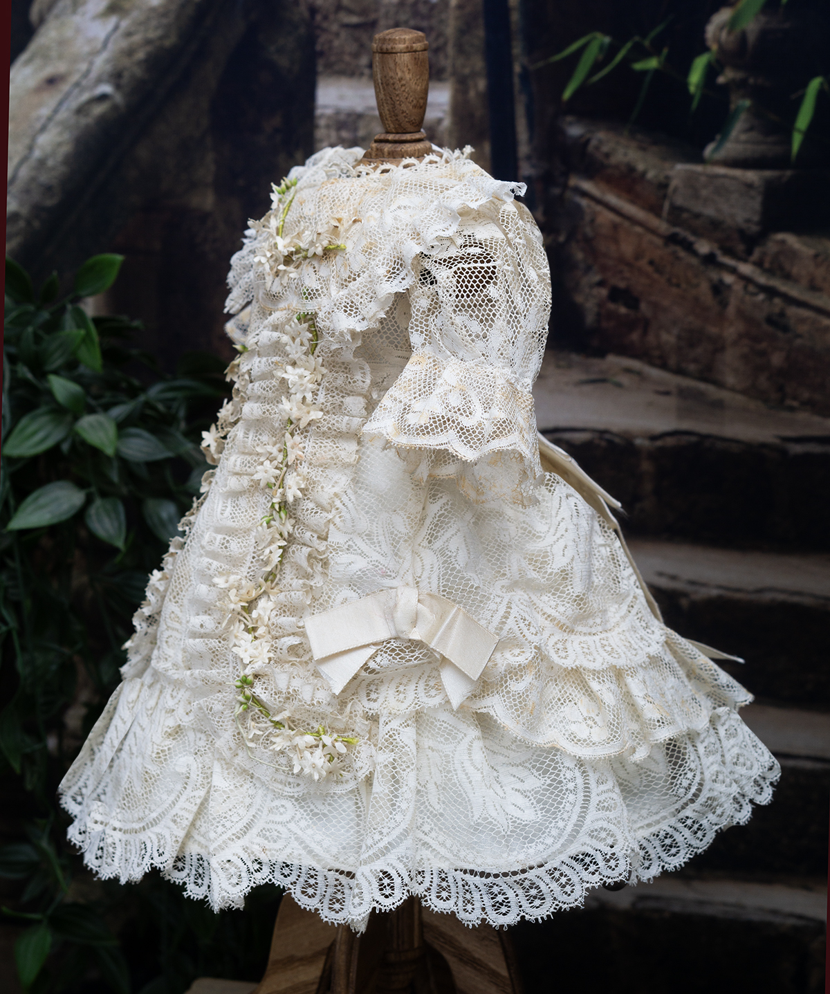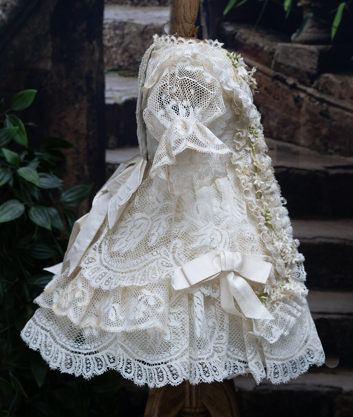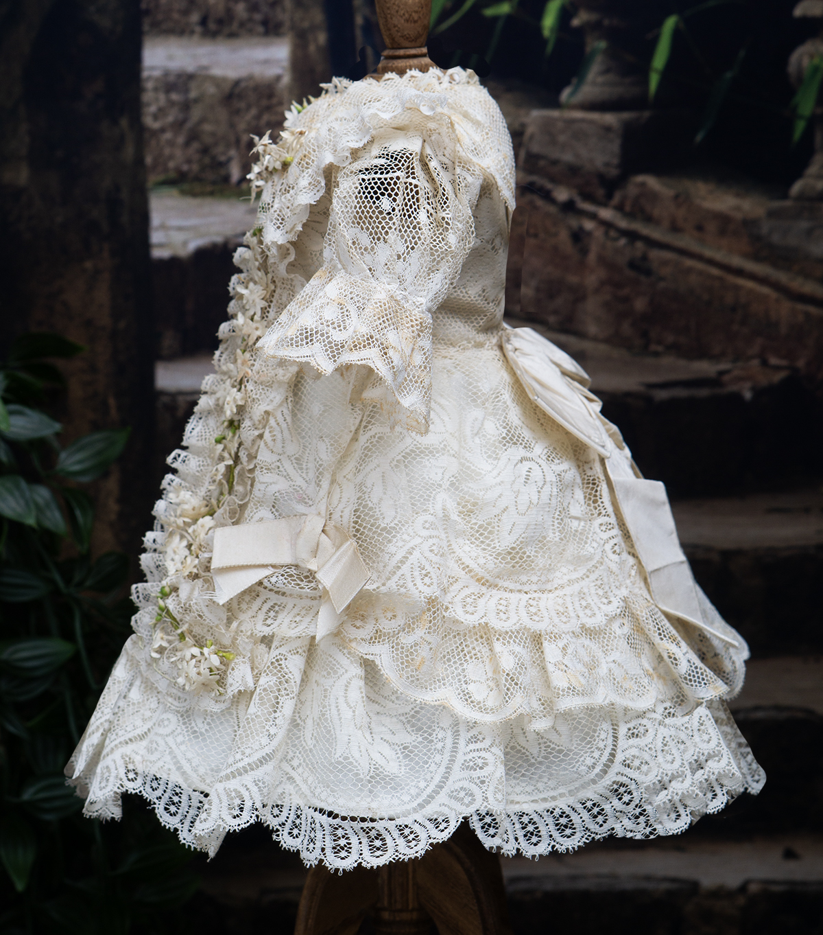 Wonderful lace dress features rounded neckline, short full sleeves, very full skirt, Bertha collar, decorated with small ivory flowers and silk ivory bows, fully hand stitched and full lined with cotton.