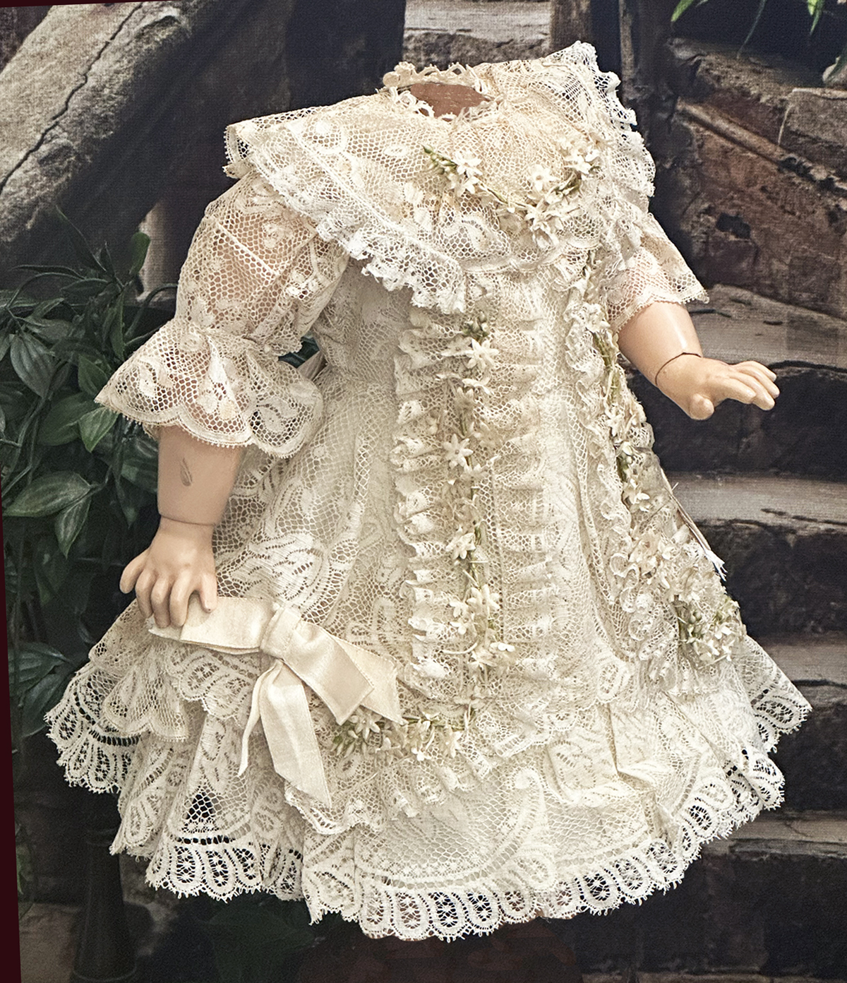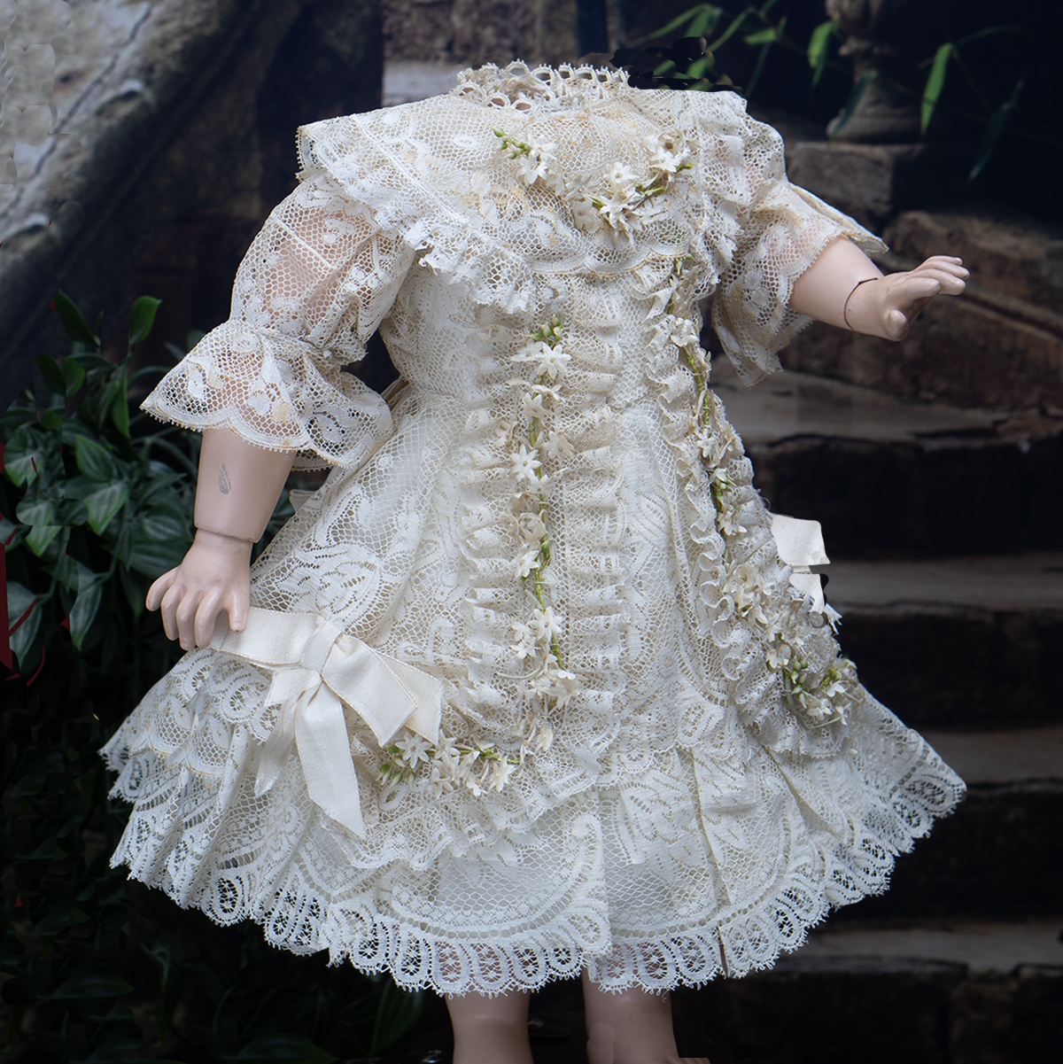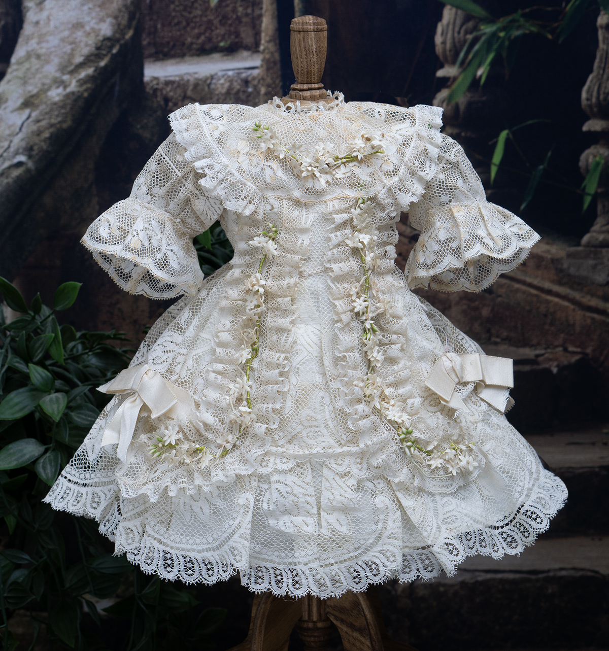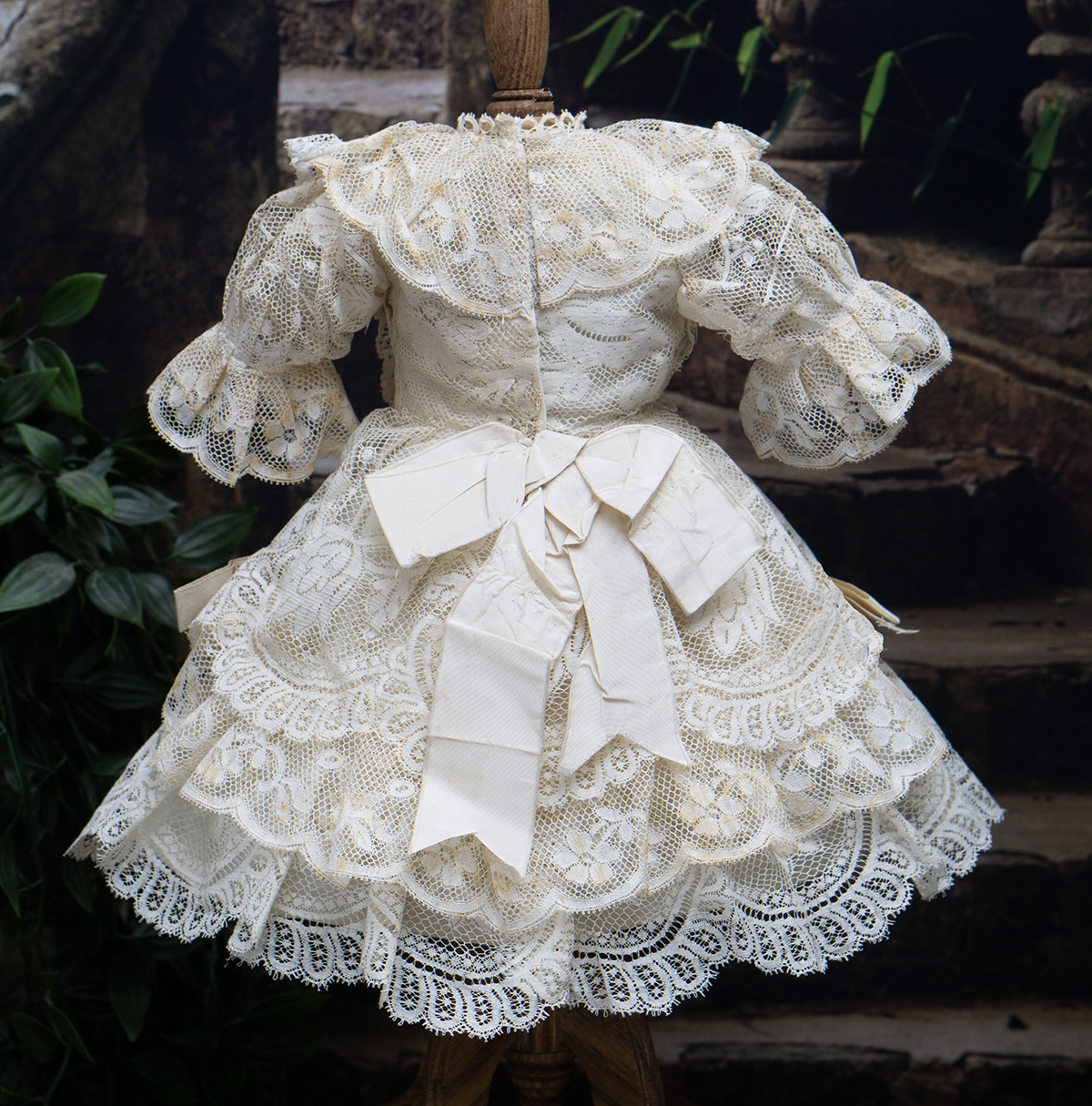 Wonderful lace dress features rounded neckline, short full sleeves, very full skirt, Bertha collar, decorated with small ivory flowers and silk ivory bows, fully hand stitched and full lined with cotton.
