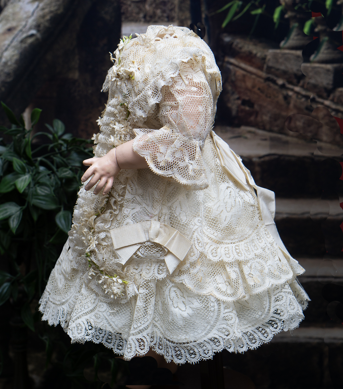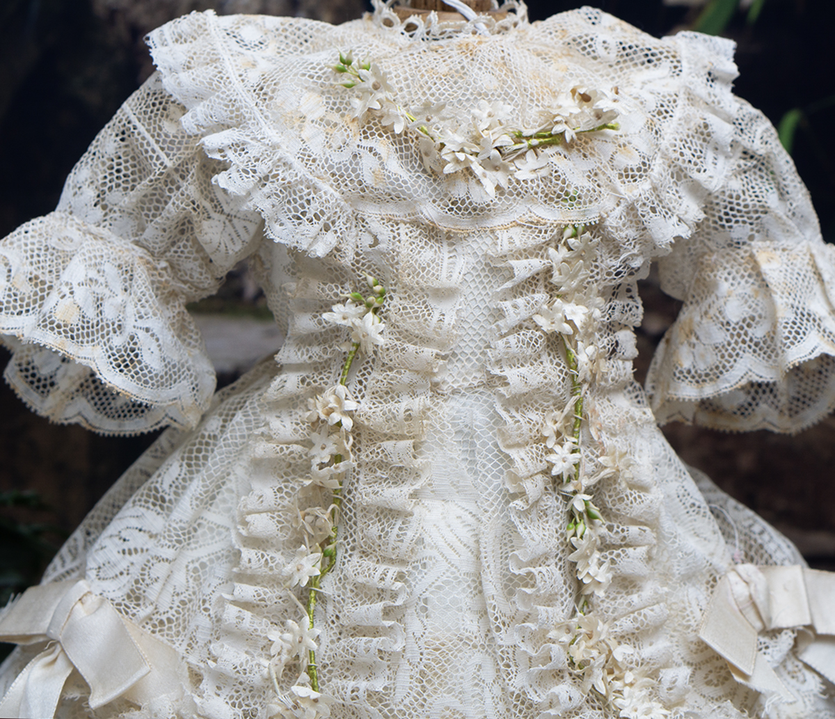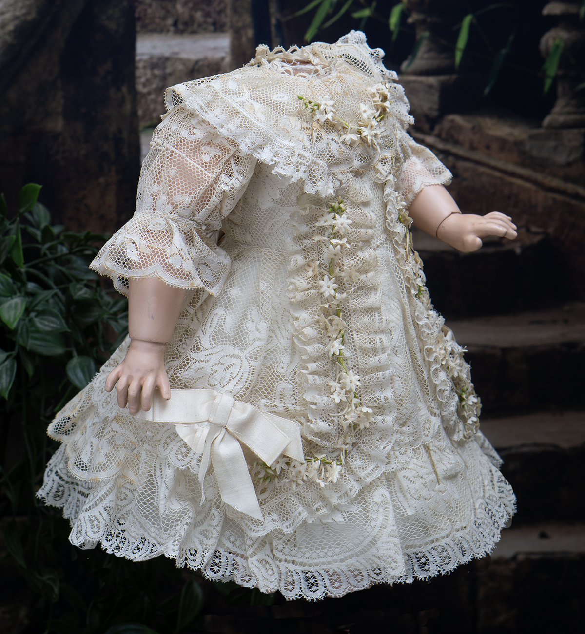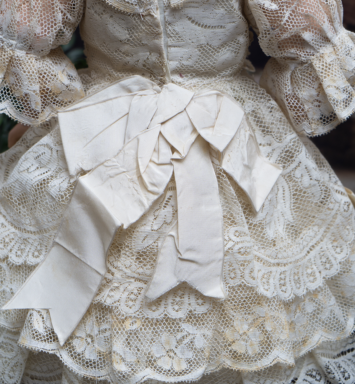 Wonderful lace dress features rounded neckline, short full sleeves, very full skirt, Bertha collar, decorated with small ivory flowers and silk ivory bows, fully hand stitched and full lined with cotton.