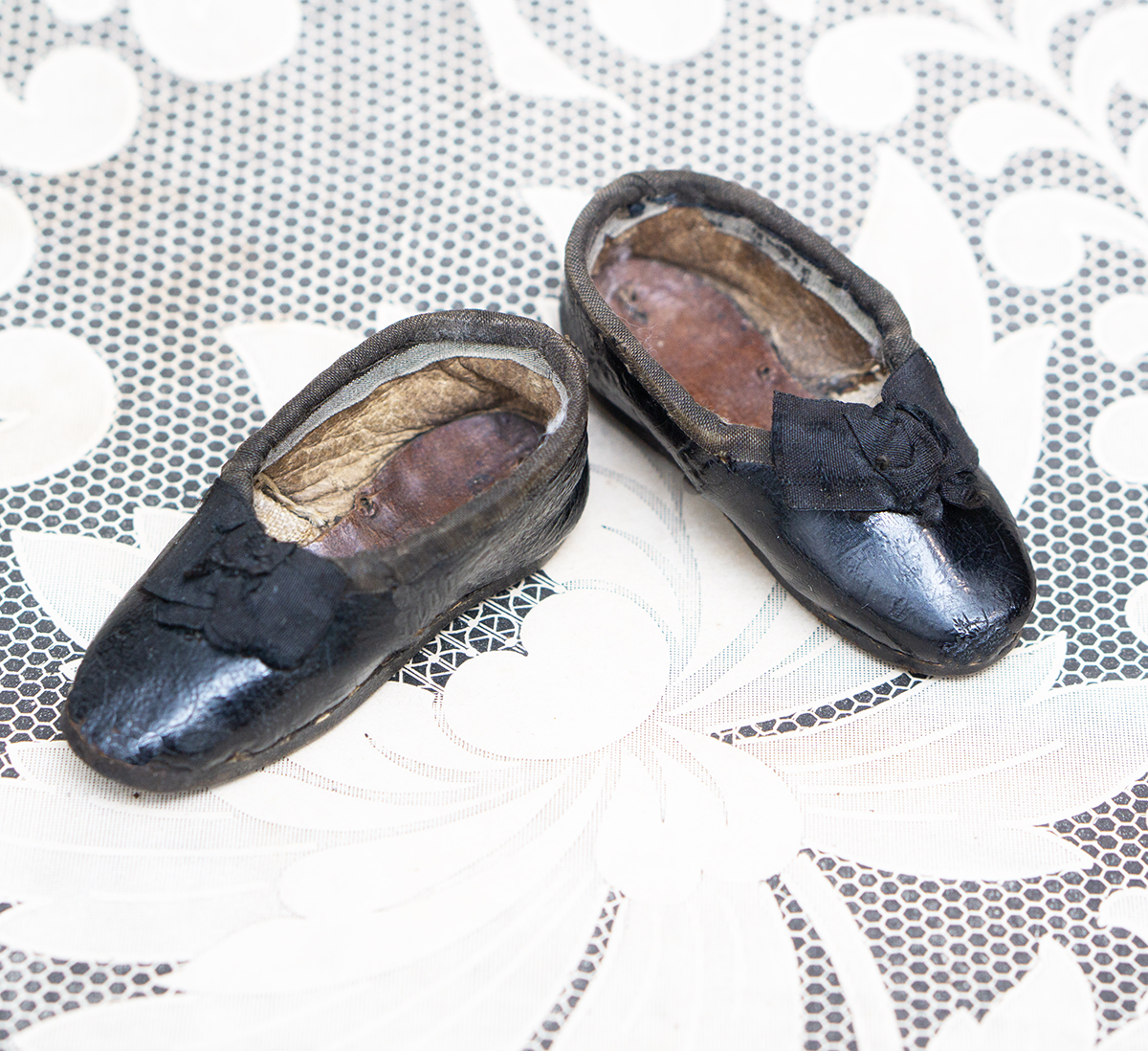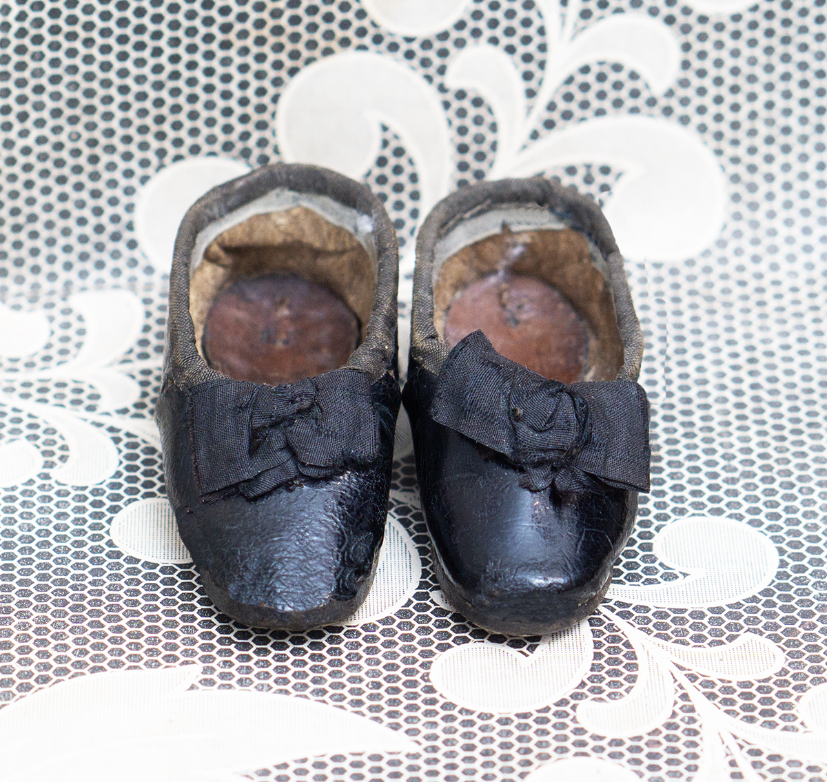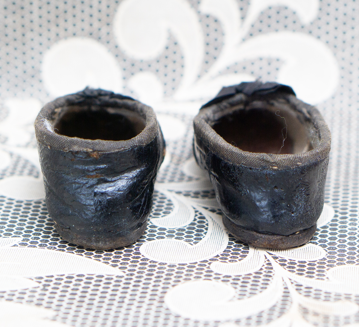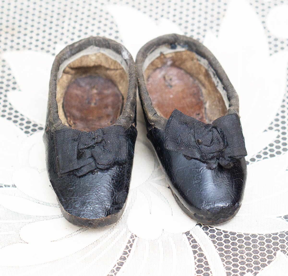 Pair of handmade doll all original shoes for a French fashion doll. Black leather uppers with silk black bows. Thick leather soles and leather inside as well. Nicely made.