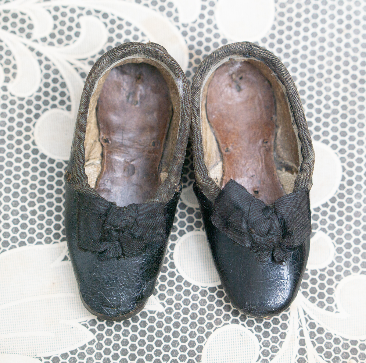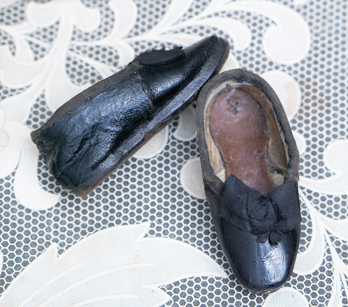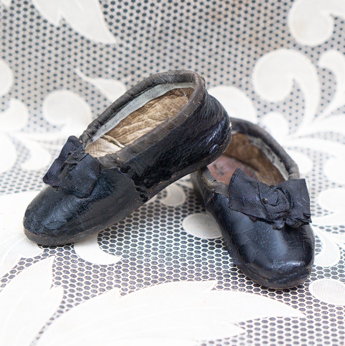 Pair of handmade doll all original shoes for a French fashion doll. Black leather uppers with silk black bows. Thick leather soles and leather inside as well. Nicely made.