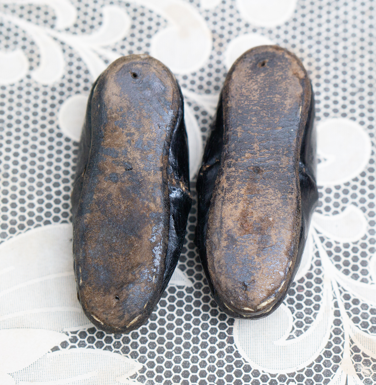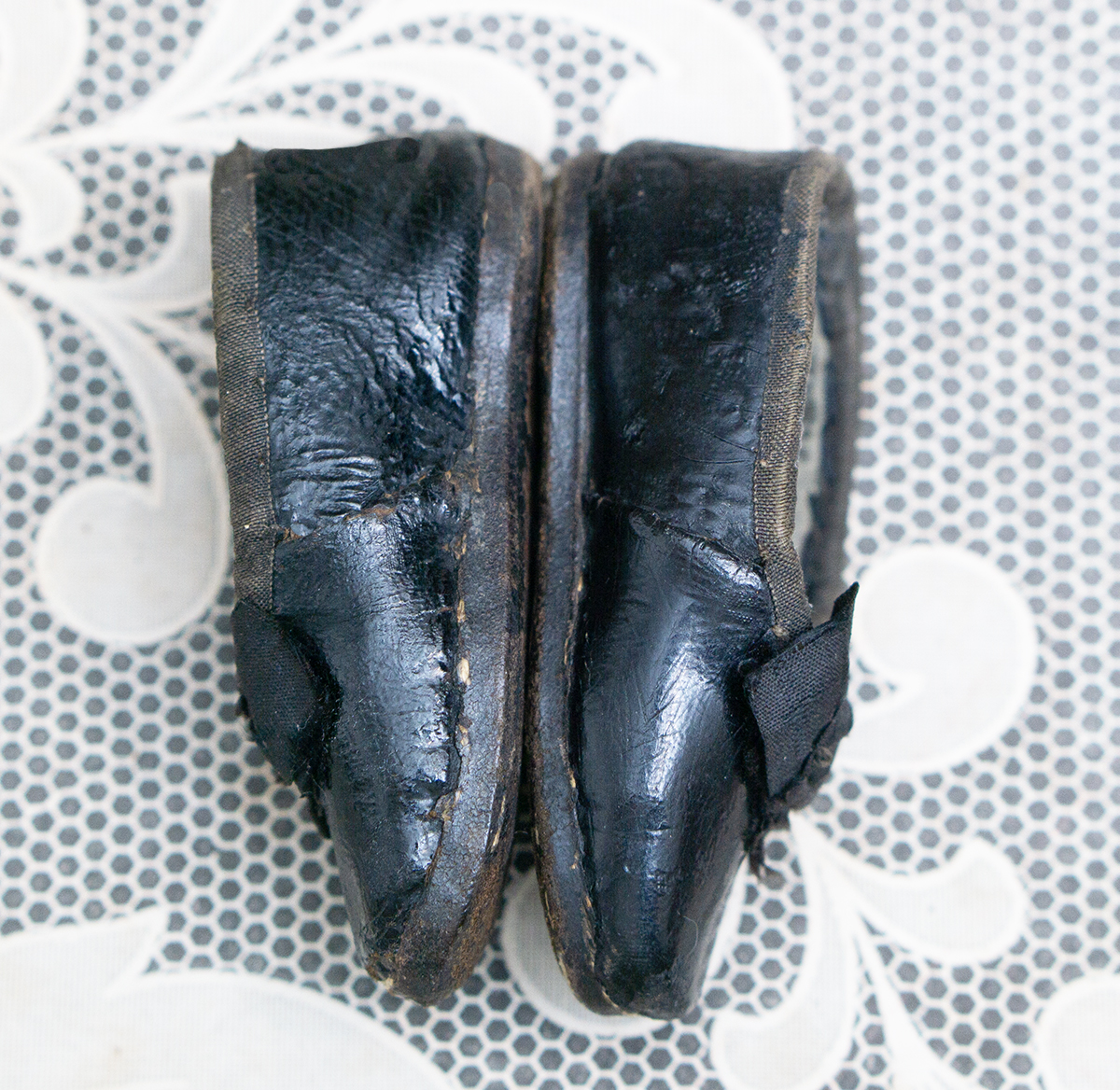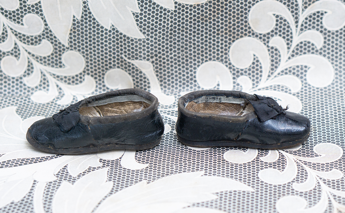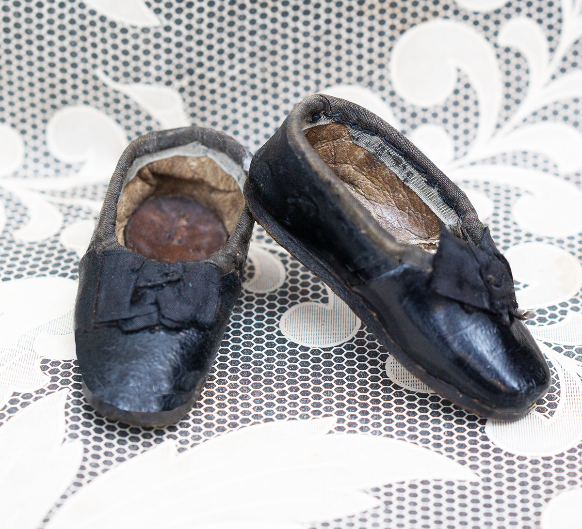 Pair of handmade doll all original shoes for a French fashion doll. Black leather uppers with silk black bows. Thick leather soles and leather inside as well. Nicely made.