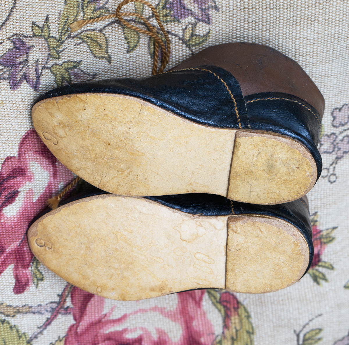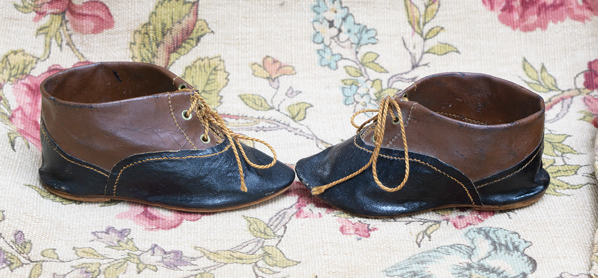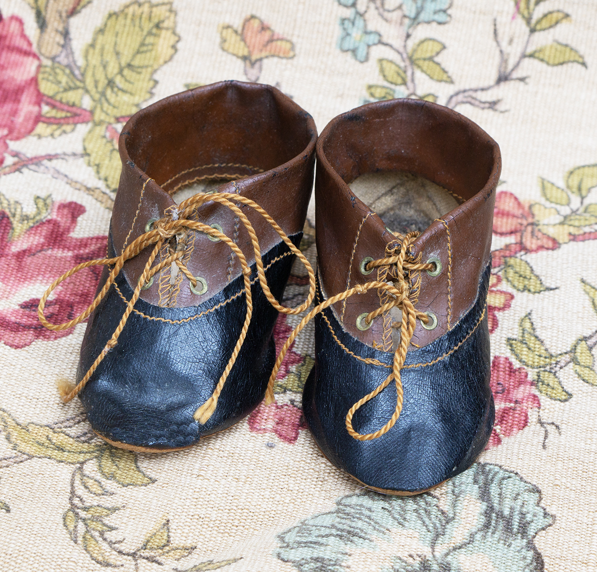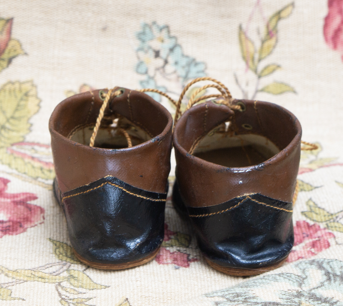 Antique all original German classical character doll`s two colored school shoes, Germany 1900.