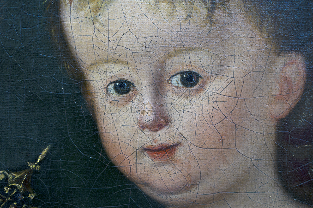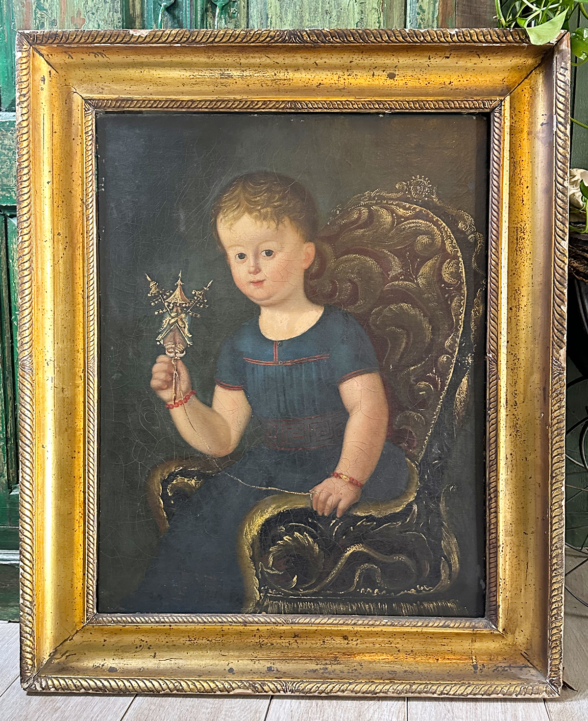 Very beautiful portrait of a little Girl dating from first part of XIX C. The girl is represented half-length and sideways in front of a draped chair, turning her gaze towards the viewer. She is wearing a blue dress wuth red soutache, and old chinese doll in her right hand.