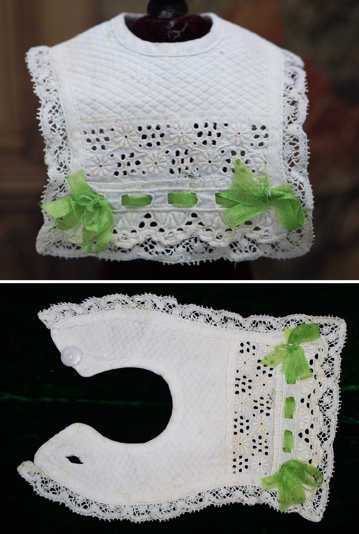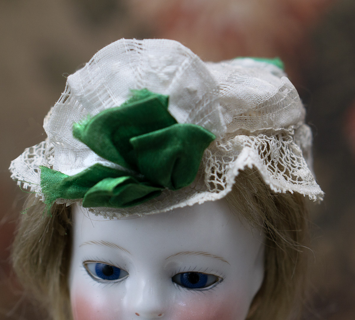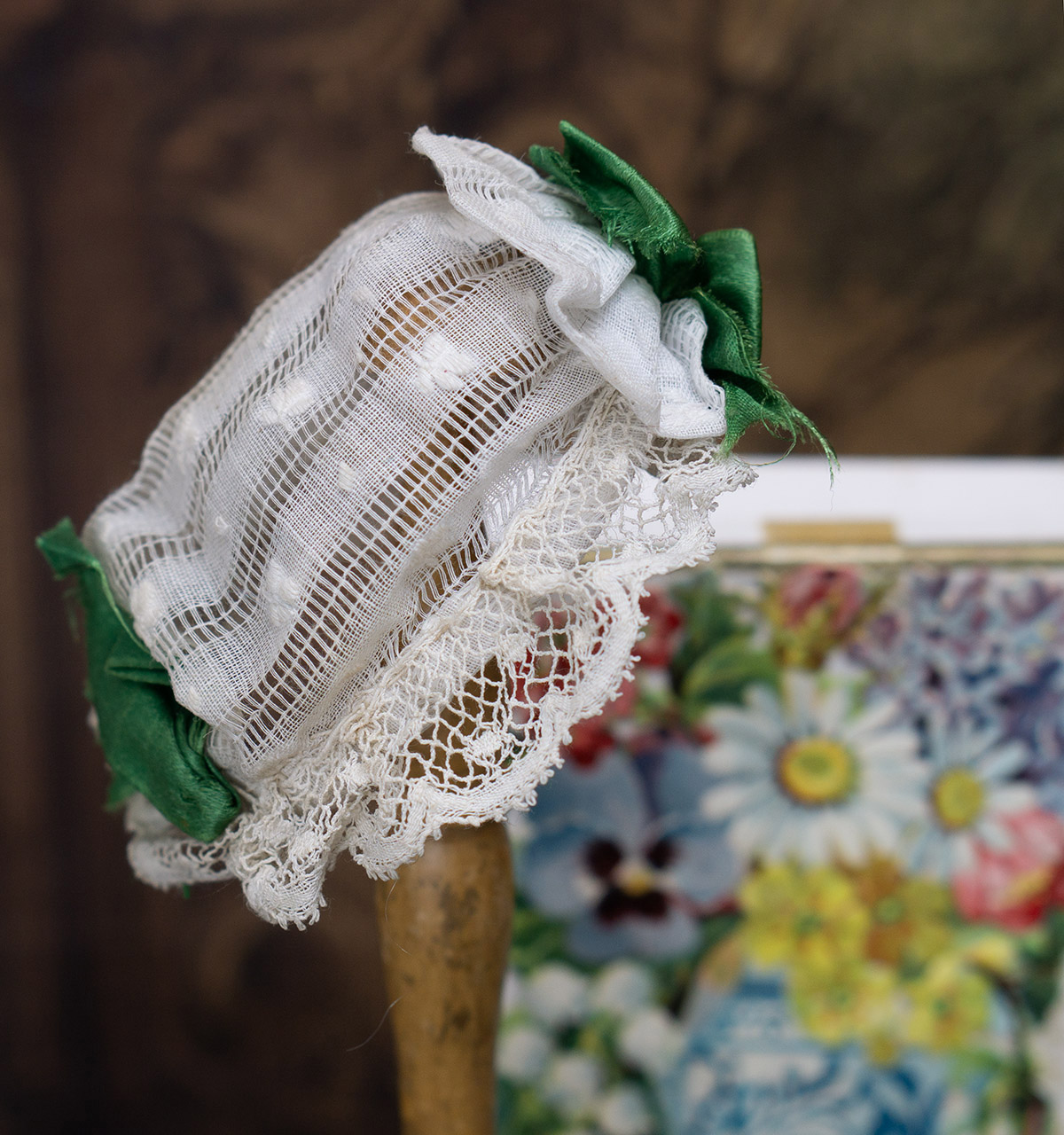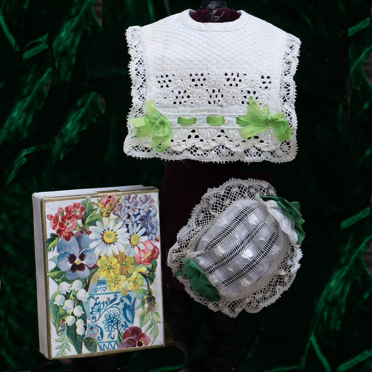 The bonnet is beautifully trimmed with lace and adorned with two vivid green silk ribbons and a rosette, adding a lovely touch of color. The piqué plastron features intricate embroidery and lace edging, decorated with matching green silk ribbon threaded through the front, and fastens at the back. The ensemble is presented in its attractive antique box with a floral design, enhancing its display appeal. A very decorative accessory set, perfect for completing an antique doll’s wardrobe or for display. Condition: Good antique condition with gentle wear consistent with age. Measures The box 3 1/4" x 2 1/2" (8.5 x 6 cm) The bonnet 2" (5cm) wide inside The plastron 5" (13cm) height and 3 1/4" (8.5cm) wide. For fashion doll 15-16" (38-41cm) International shipping cost $45.00 ------------------------------------ I DO A LAYAWAY NO STATE SALES TAX! Thanks for your visit to Respectfulbear doll shop!