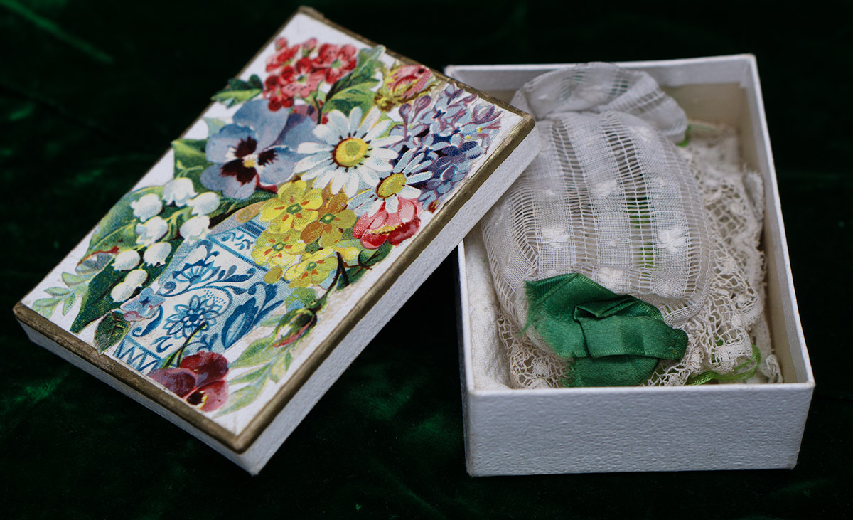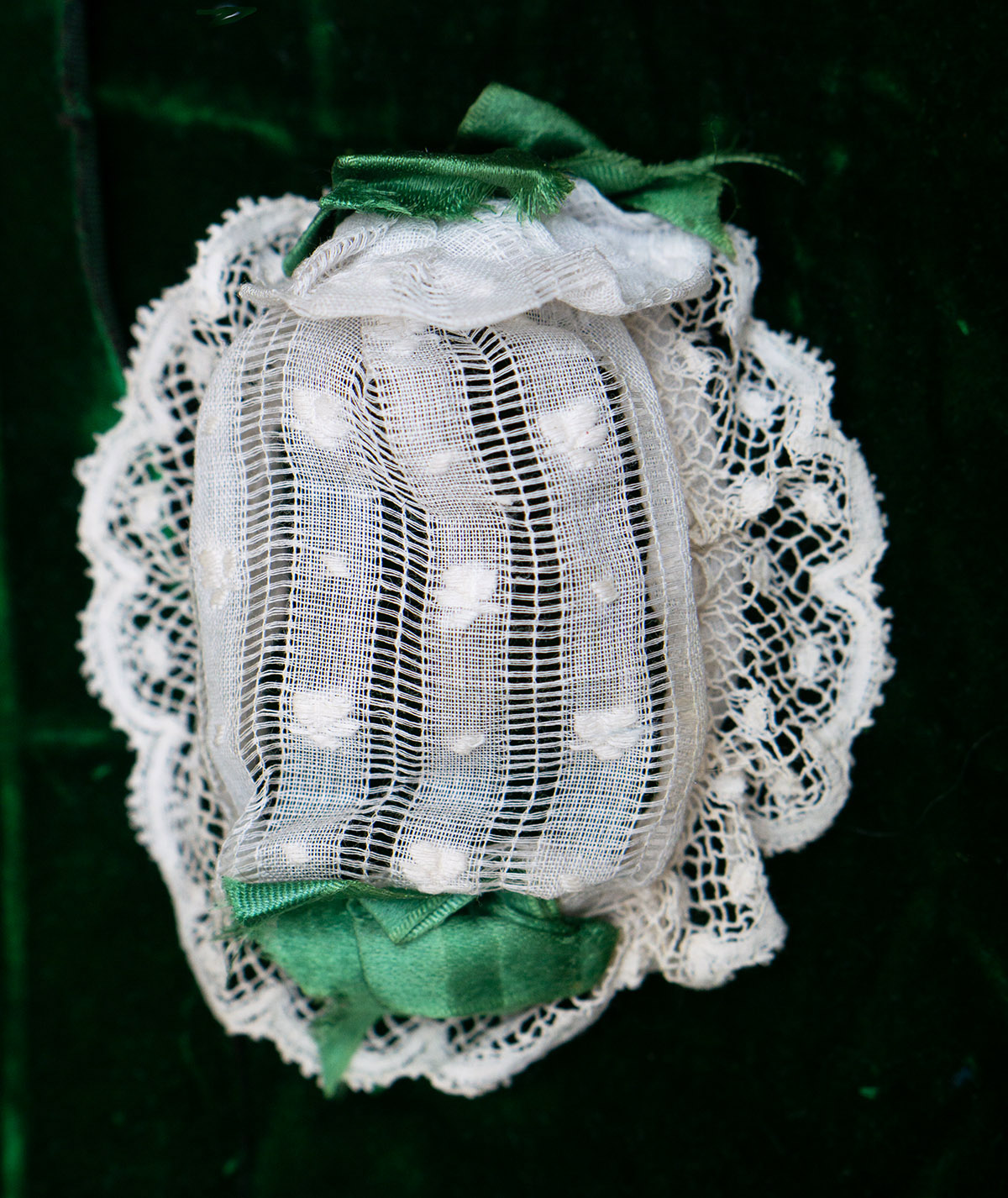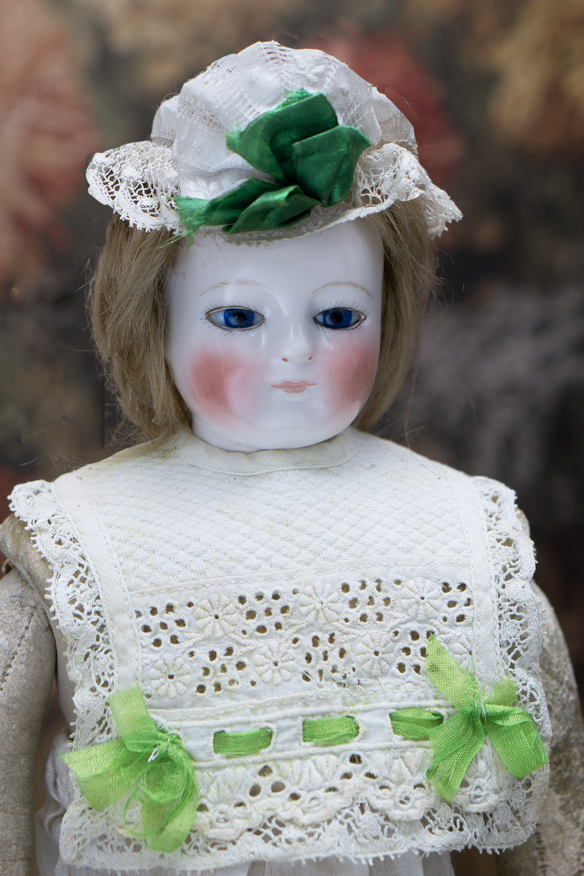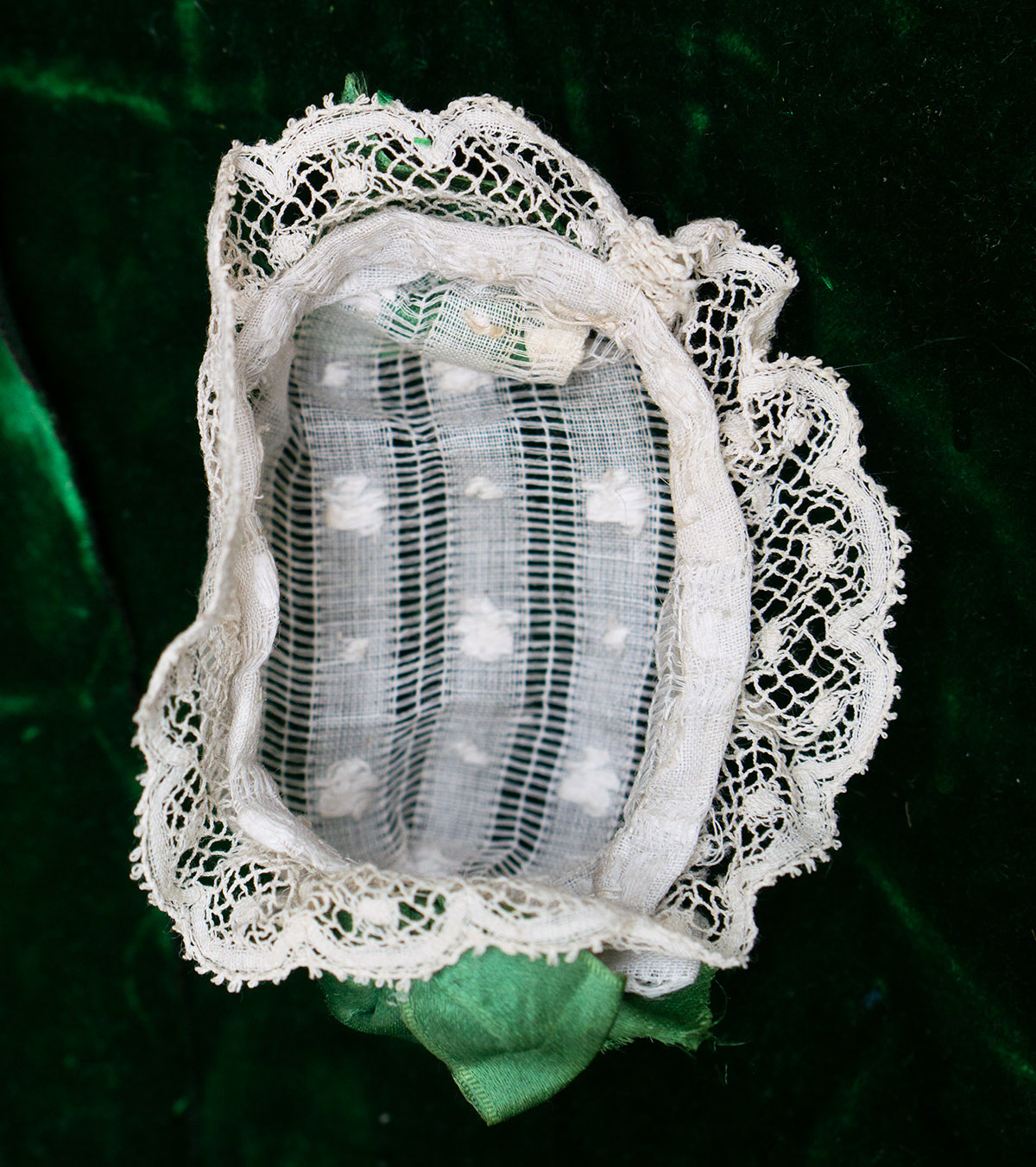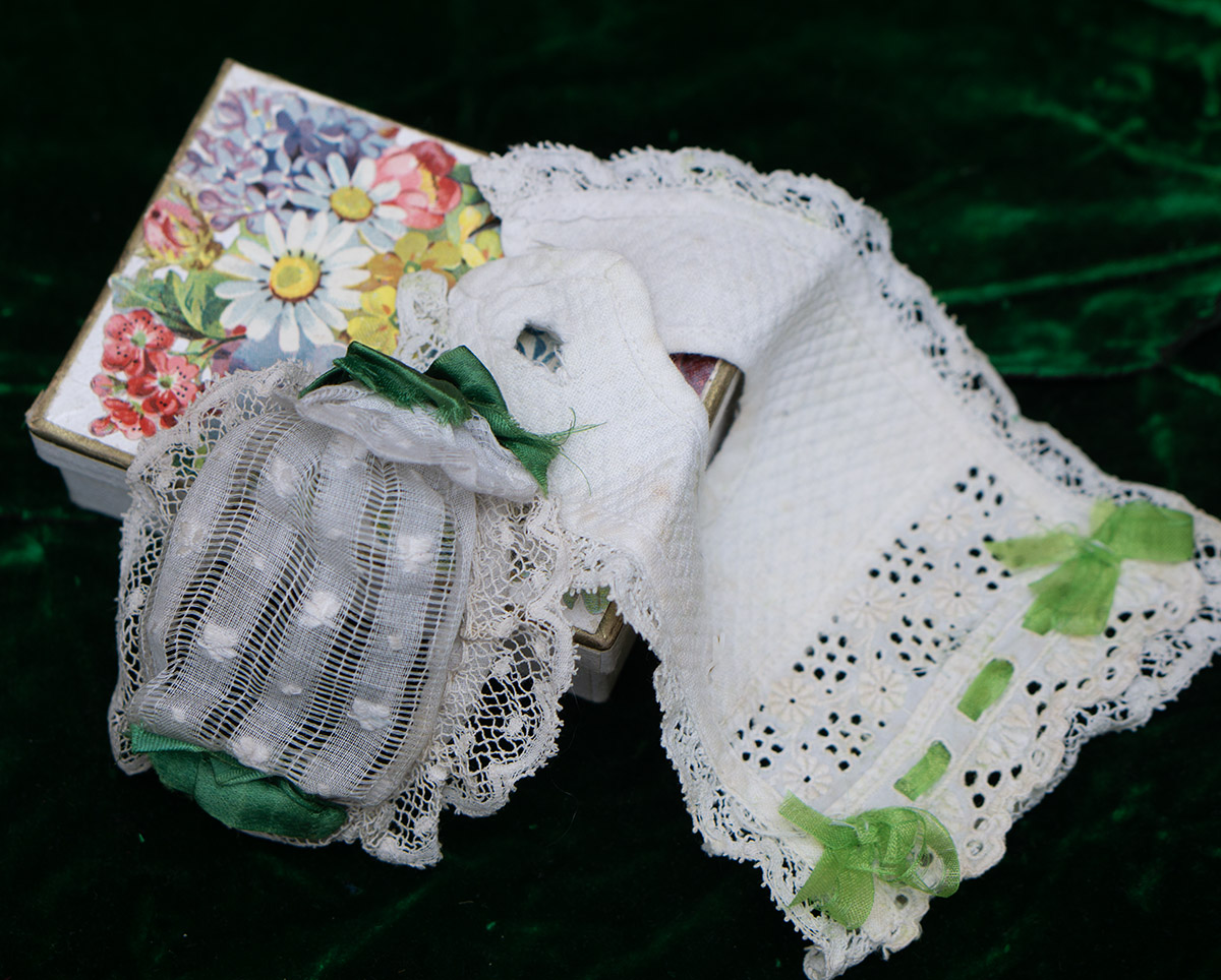 The bonnet is beautifully trimmed with lace and adorned with two vivid green silk ribbons and a rosette, adding a lovely touch of color. The piqué plastron features intricate embroidery and lace edging, decorated with matching green silk ribbon threaded through the front, and fastens at the back. The ensemble is presented in its attractive antique box with a floral design, enhancing its display appeal. A very decorative accessory set, perfect for completing an antique doll’s wardrobe or for display. Condition: Good antique condition with gentle wear consistent with age. Measures The box 3 1/4" x 2 1/2" (8.5 x 6 cm) The bonnet 2" (5cm) wide inside The plastron 5" (13cm) height and 3 1/4" (8.5cm) wide. For fashion doll 15-16" (38-41cm) International shipping cost $45.00 ------------------------------------ I DO A LAYAWAY NO STATE SALES TAX! Thanks for your visit to Respectfulbear doll shop!