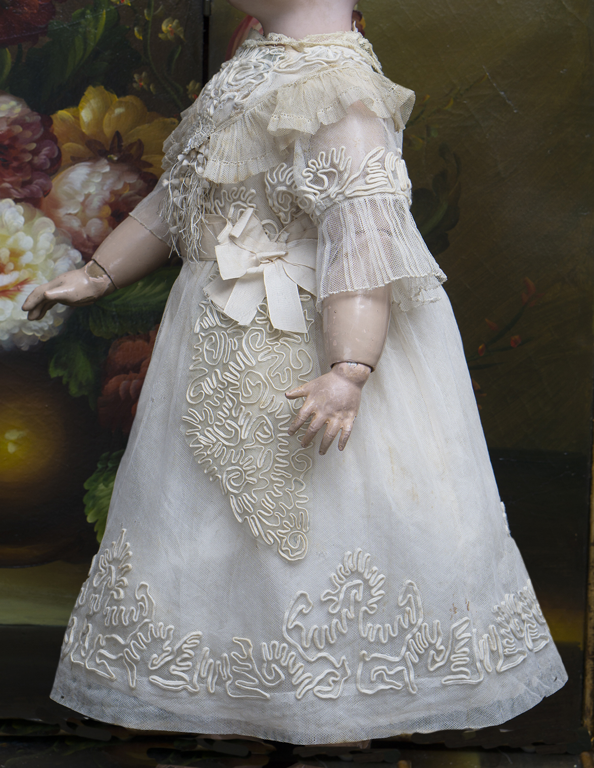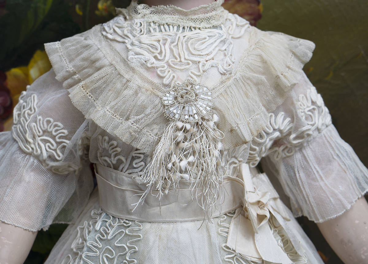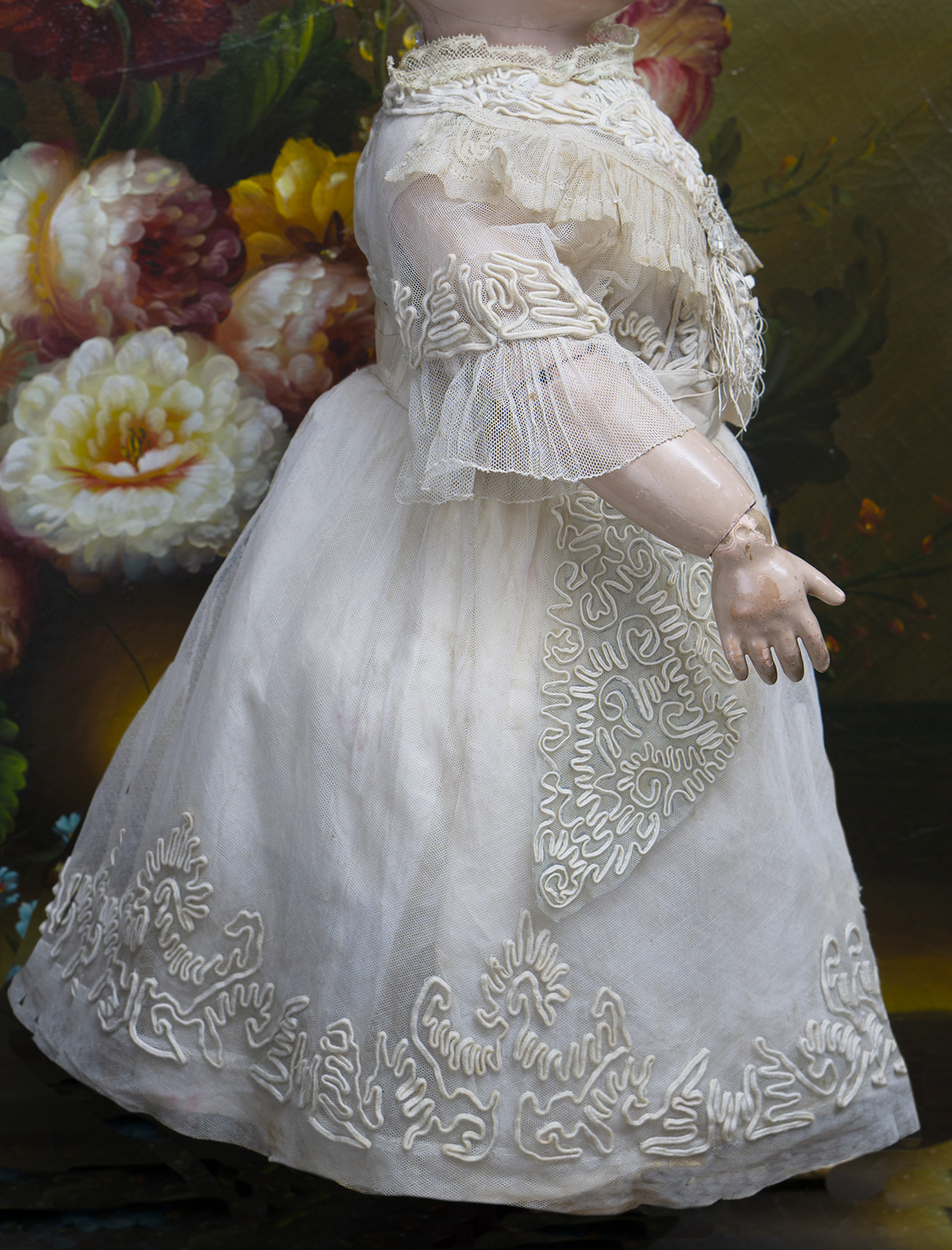 The dress has antique ivory sleeveless silk underdress. Good condition to age. Measures 18" (46cm) length, 7 1/2" (19cm) shoulders, 5" (13cm) sleeve, 16" (41cm) waist. Fit for doll about 26-27 tall (65-68cm). ---------------------------------------- I DO A LAYAWAY. NI ANY SALES TAX! International shipping cost $38.00 Please email me if you have any questions. Thanks for your visit to Respectfulbear doll shop. ------------------------------------ I DO A LAYAWAY NO STATE SALES TAX! Thanks for your visit to Respectfulbear doll shop!