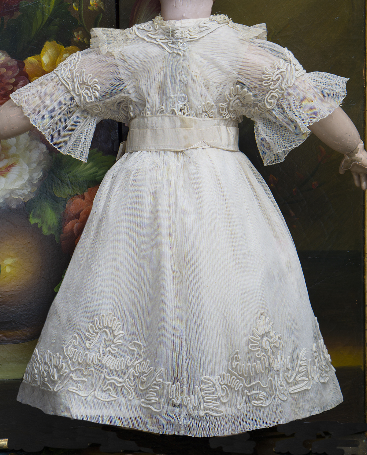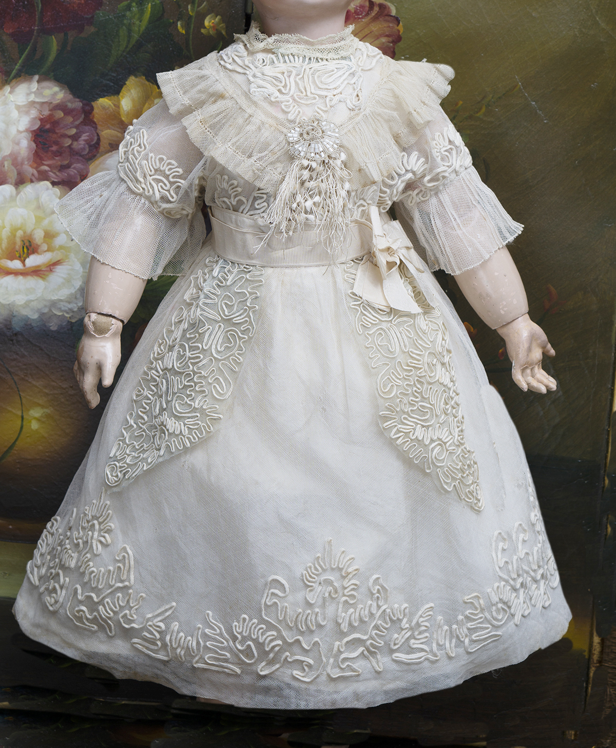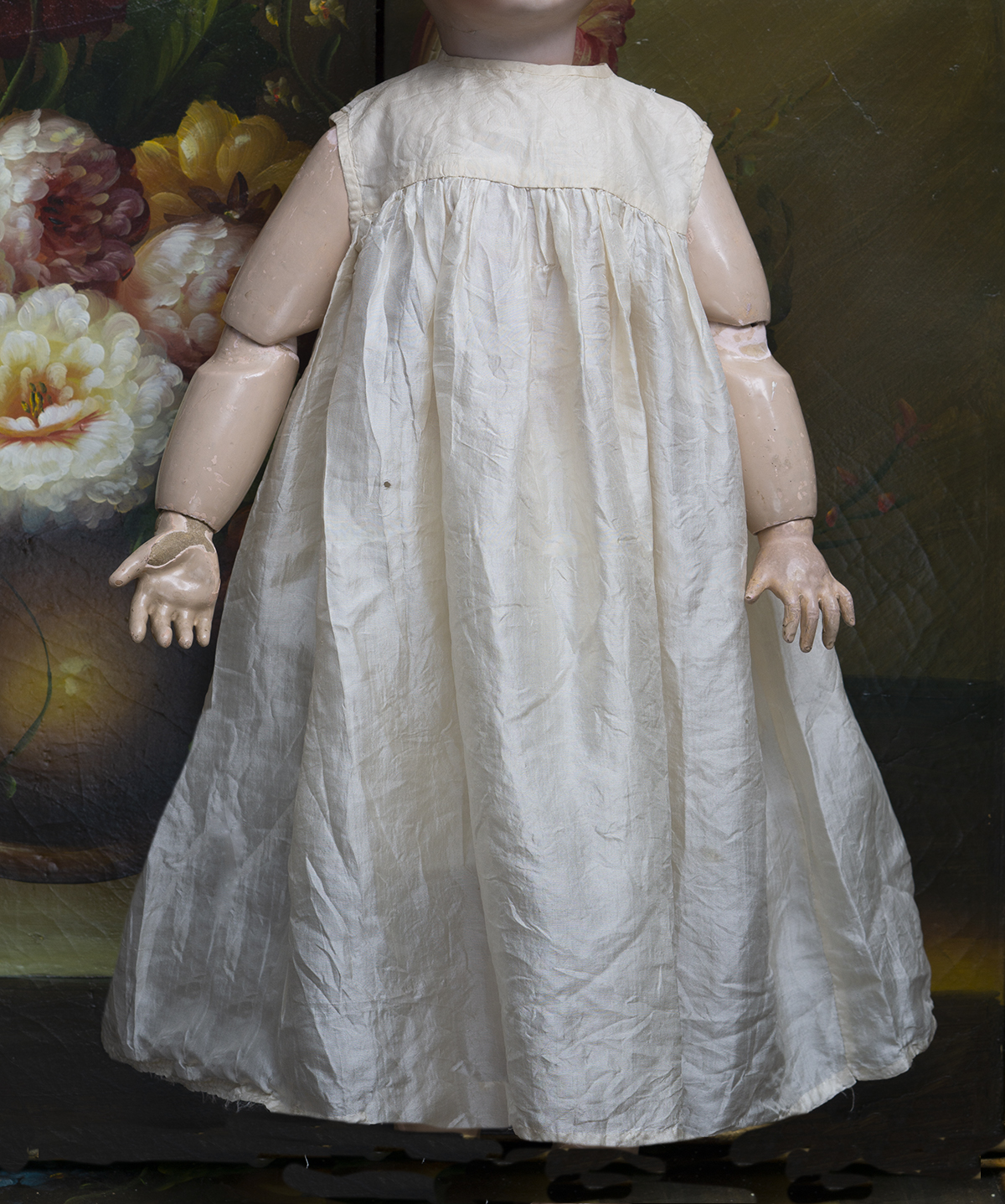 The dress has antique ivory sleeveless silk underdress. Good condition to age. Measures 18" (46cm) length, 7 1/2" (19cm) shoulders, 5" (13cm) sleeve, 16" (41cm) waist. Fit for doll about 26-27 tall (65-68cm). ---------------------------------------- I DO A LAYAWAY. NI ANY SALES TAX! International shipping cost $38.00 Please email me if you have any questions. Thanks for your visit to Respectfulbear doll shop. ------------------------------------ I DO A LAYAWAY NO STATE SALES TAX! Thanks for your visit to Respectfulbear doll shop!