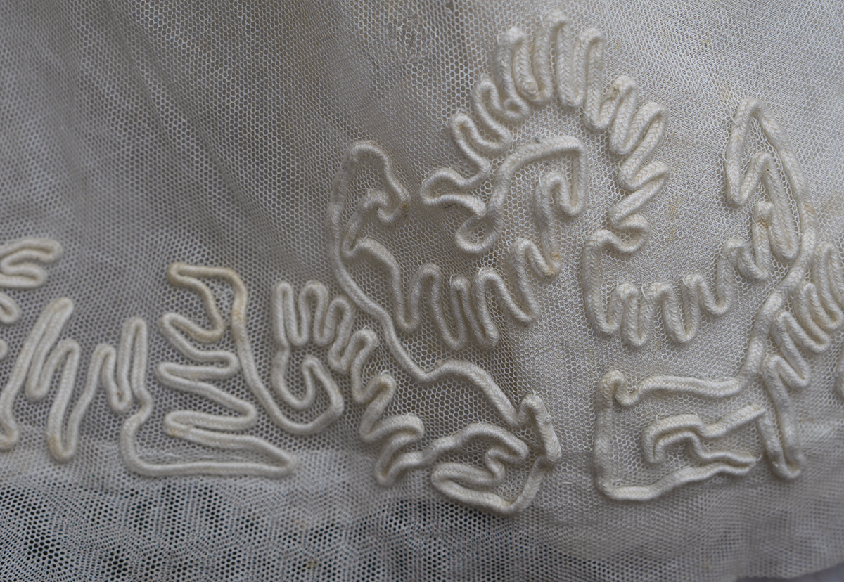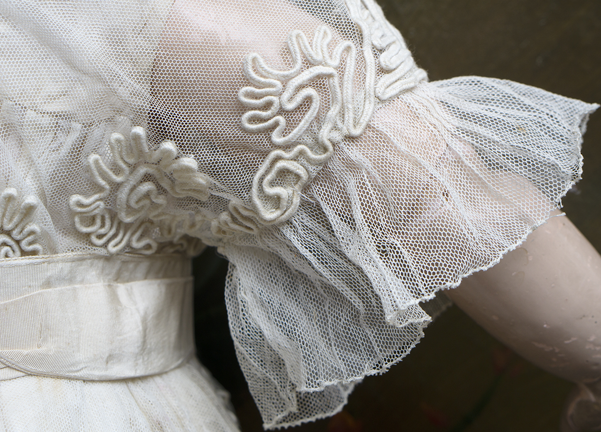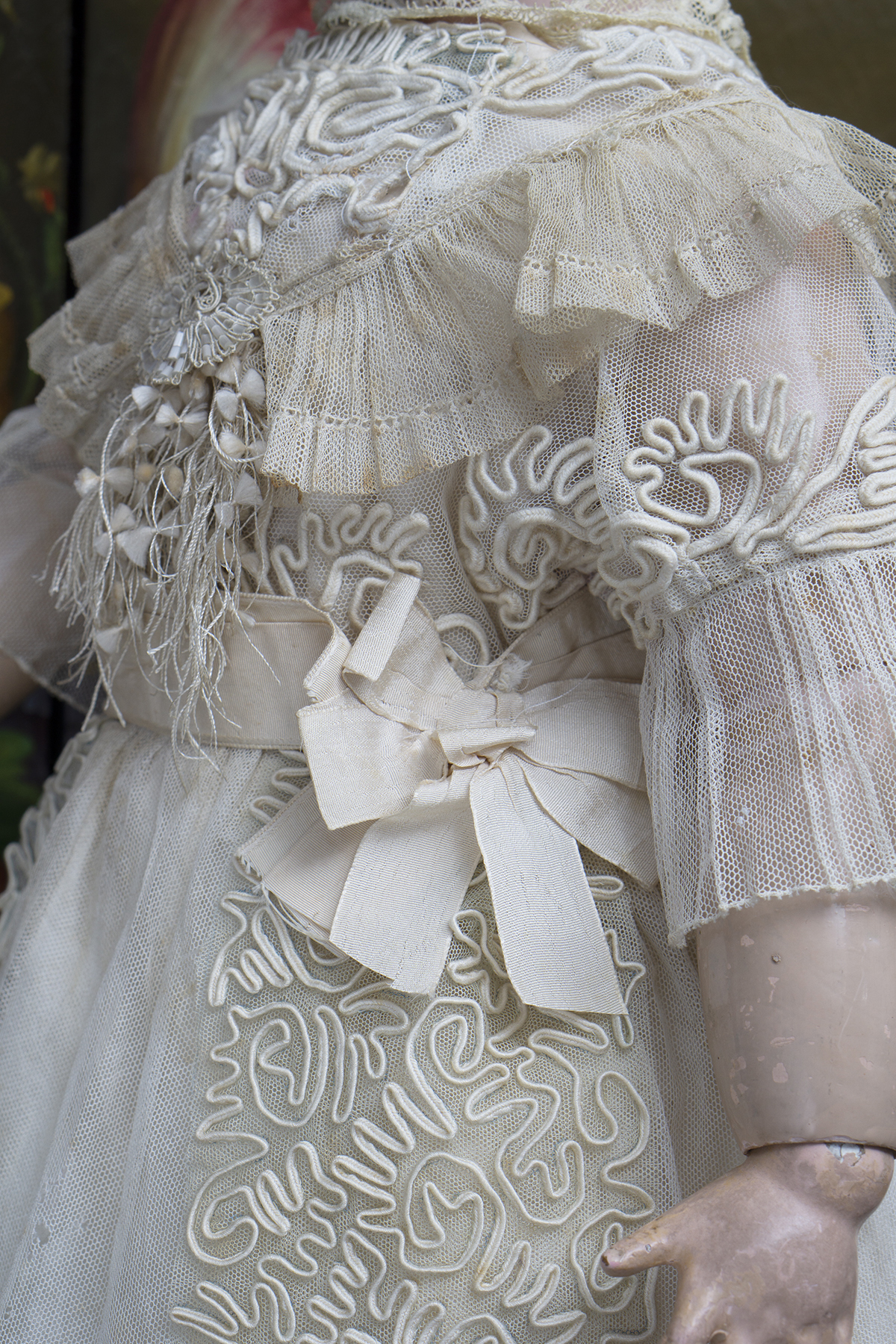 Very beautiful antique original tulle lace dress with silk soutache embroidery features short sleeves, fitted bodice, Bertha tulle collar, very full skirt, ivory silk sash with bow, decorated with pearls and silk , closure at the back with 3 glass buttons, fully hand stitches.