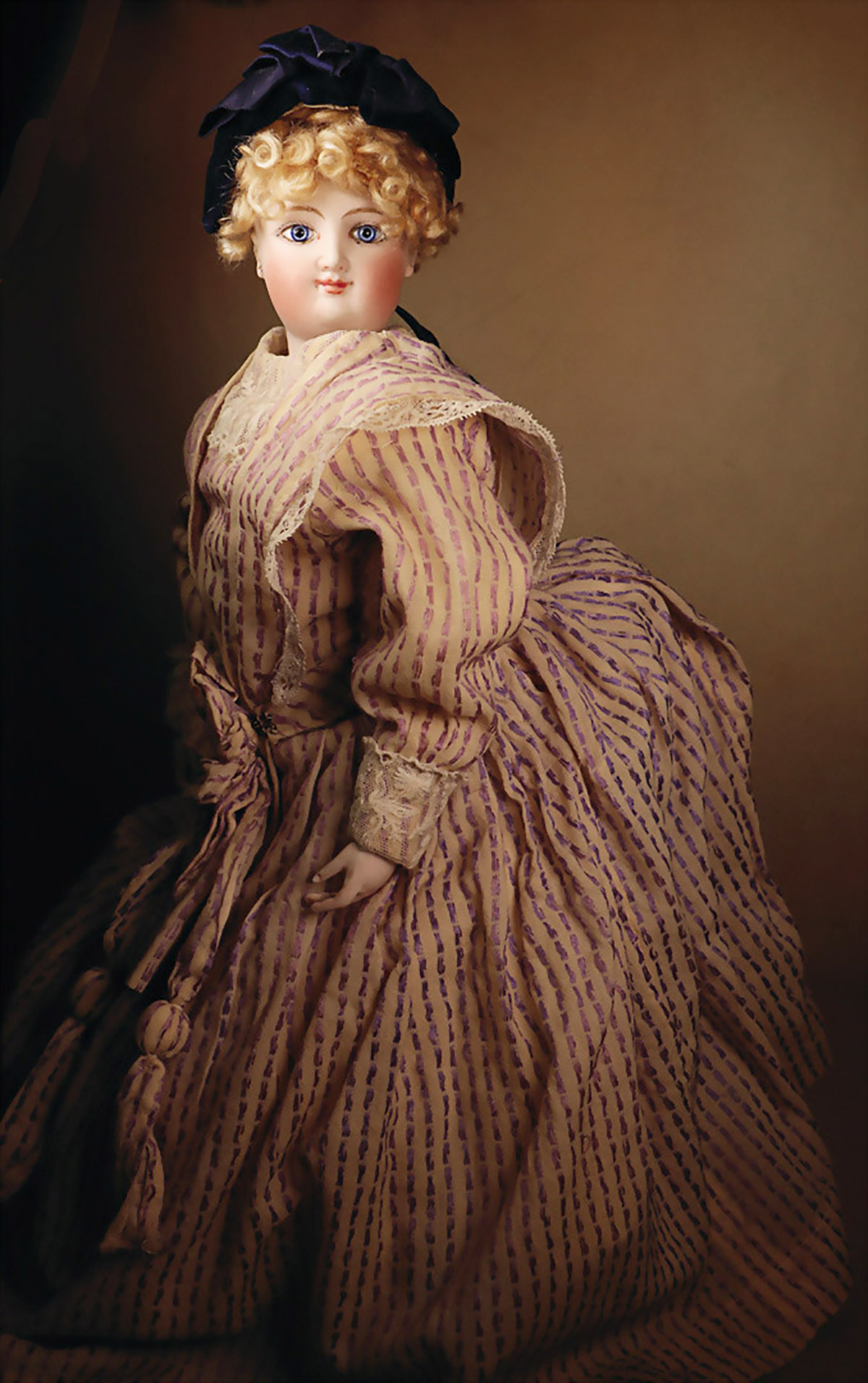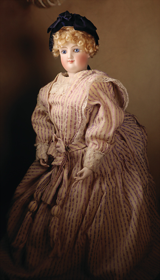 Characteristic of this model is the finely modeled, gently smiling face, which gives this lady her unmistakable liveliness and grace, bisque porcelain head on original porcelain breastplate, fine, round face with gentle smile, inset glacier-blue glass eyes, painted eyelashes and precise brows, closed mouth with slightly raised corners of the mouth ("Bru smile"), subtly shaded nostrils and accentuated corners of the eyes, closed mouth with delicately contoured, lightly shaded lips, blushed cheeks, pierced earlobes, original sitting position, original seat, earlobes, original sitting kid leather body with bisque forearms, 1 finger missing, 41 cm, chamantes dress made of old fabrics, old curly blond wig Condition: generally very nice condition, 1 little finger half missing, some loss of filling to the upper arms Appreciation: rare example of lace production Bru - high-quality modeling, fine painting and museum quality, provenance: " Gerda Ott Collection "