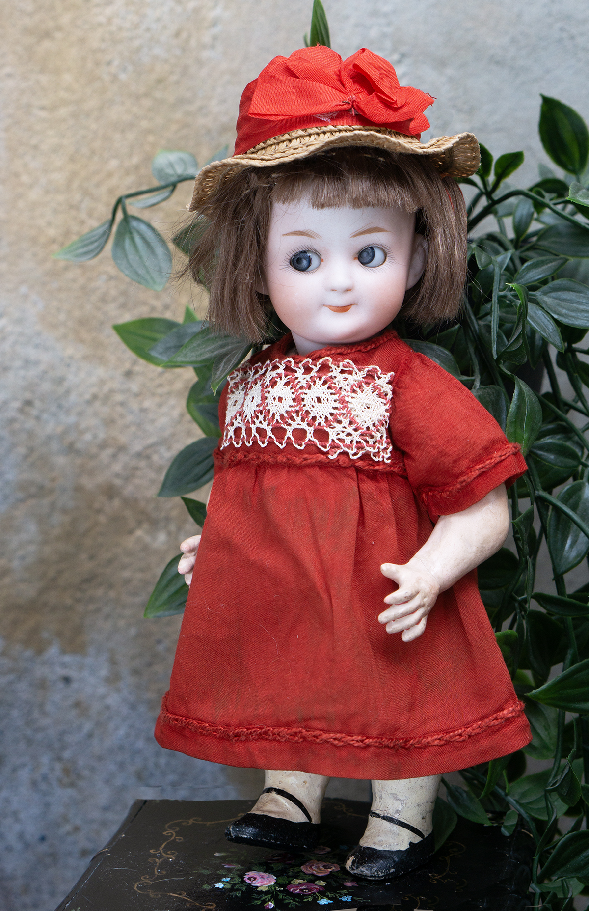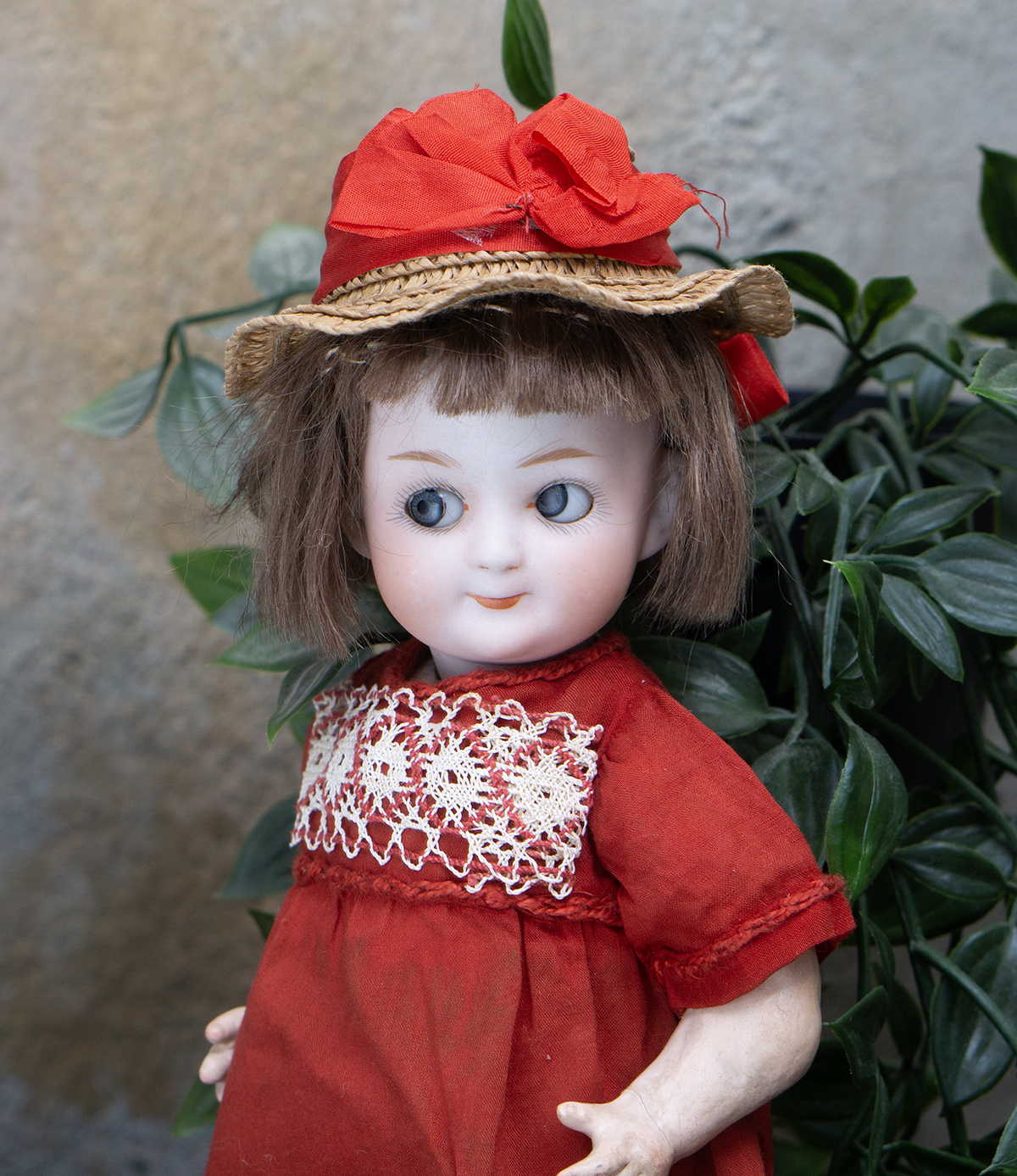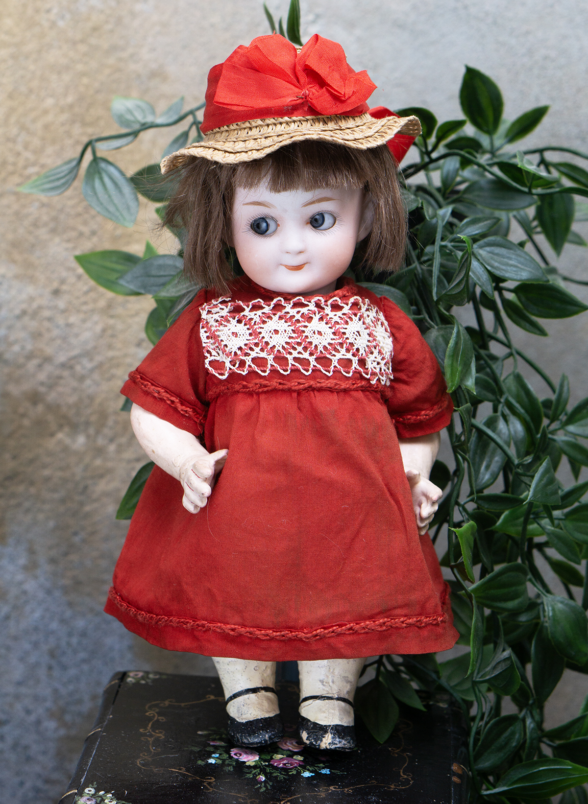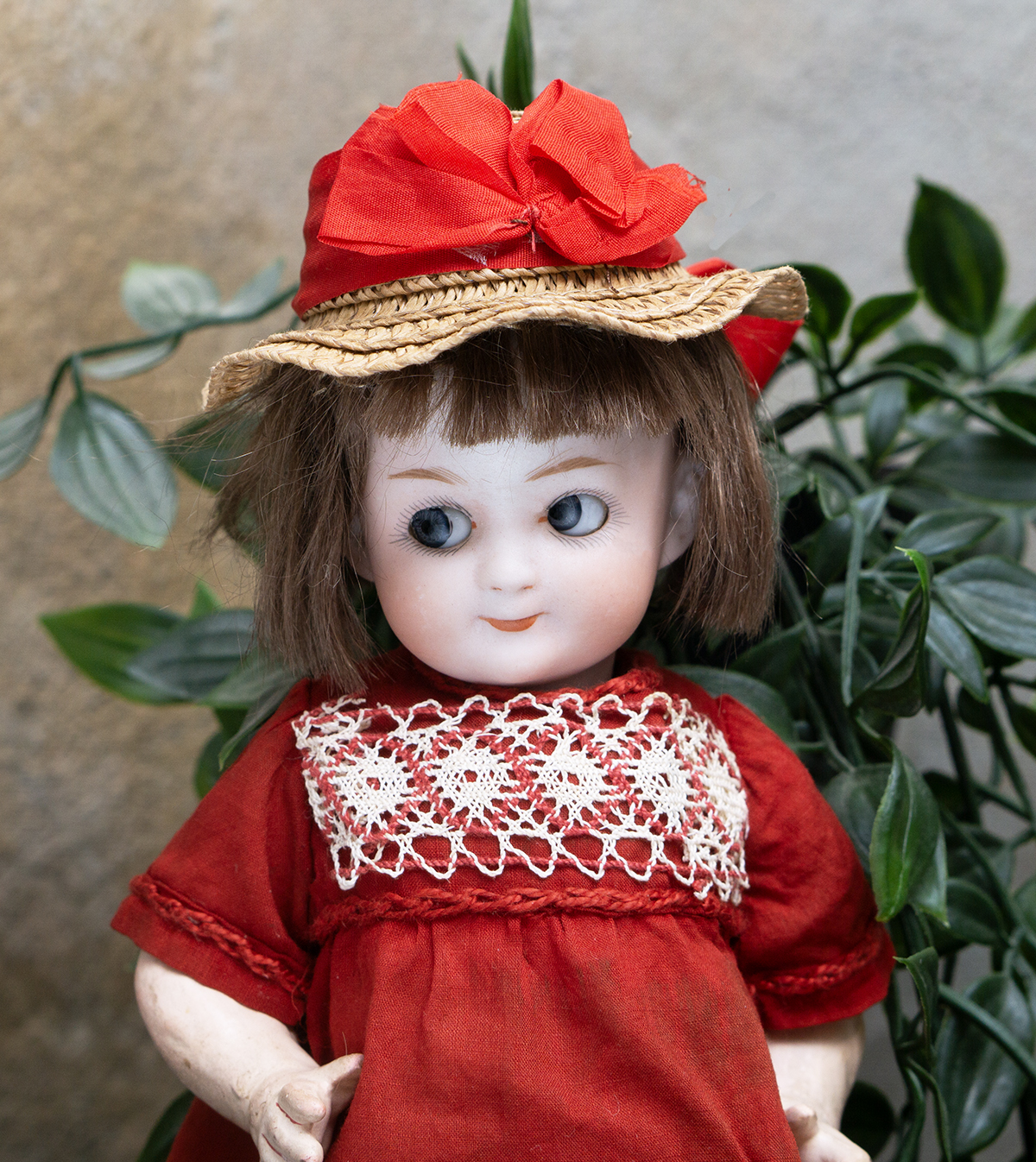 Bisque socket head,brown glass sleep and side-glancing googly eyes, painted long curly lashes, feathered brows,accented nostrils, closed mouth with shy smile, brunette mohair bobbed wig, composition five piece toddler body, antique dress and vintage hat.