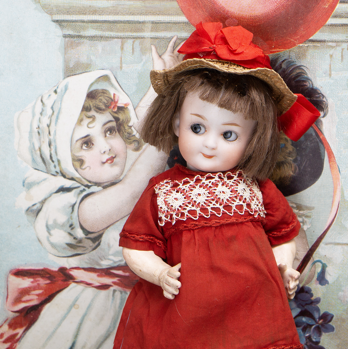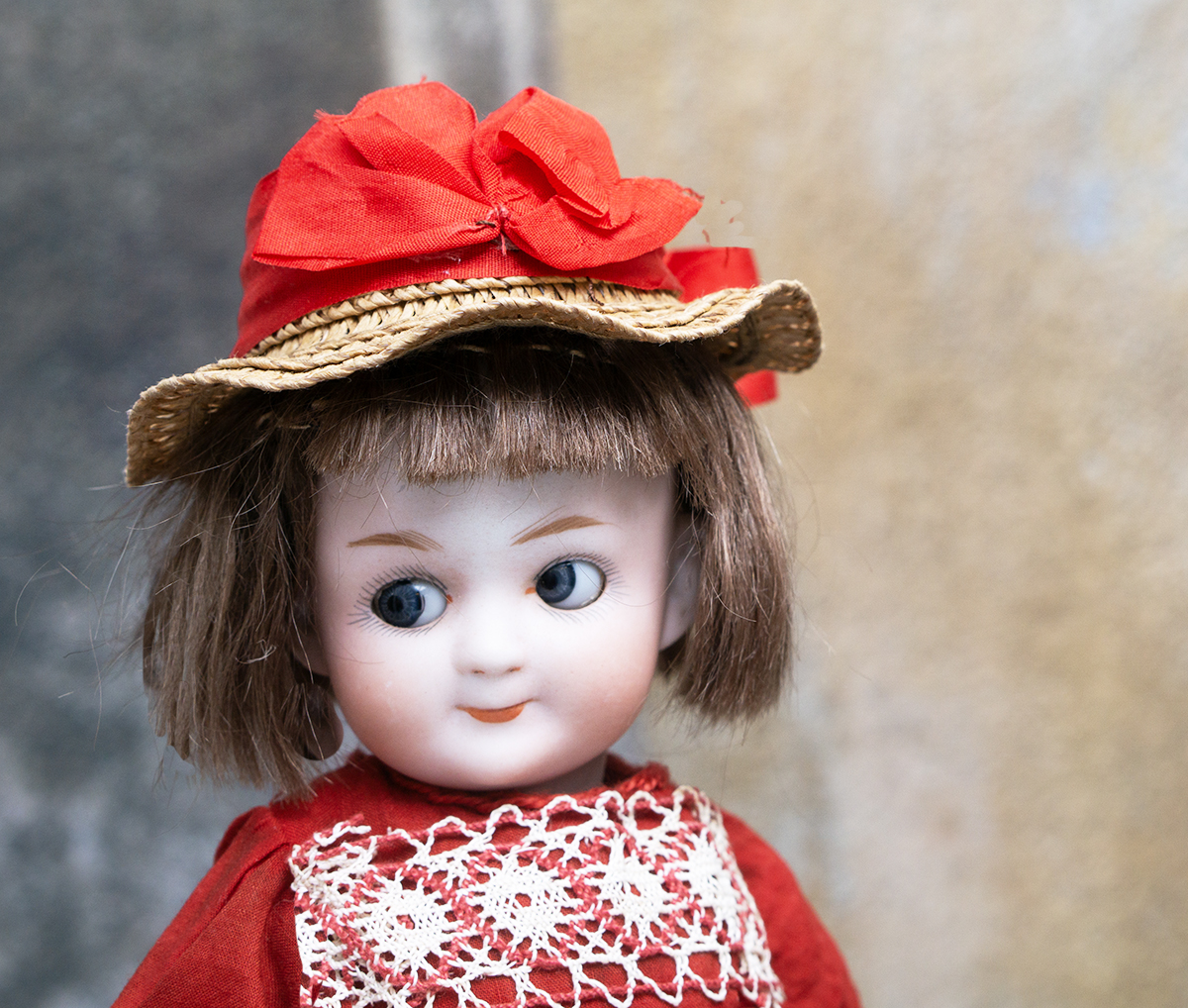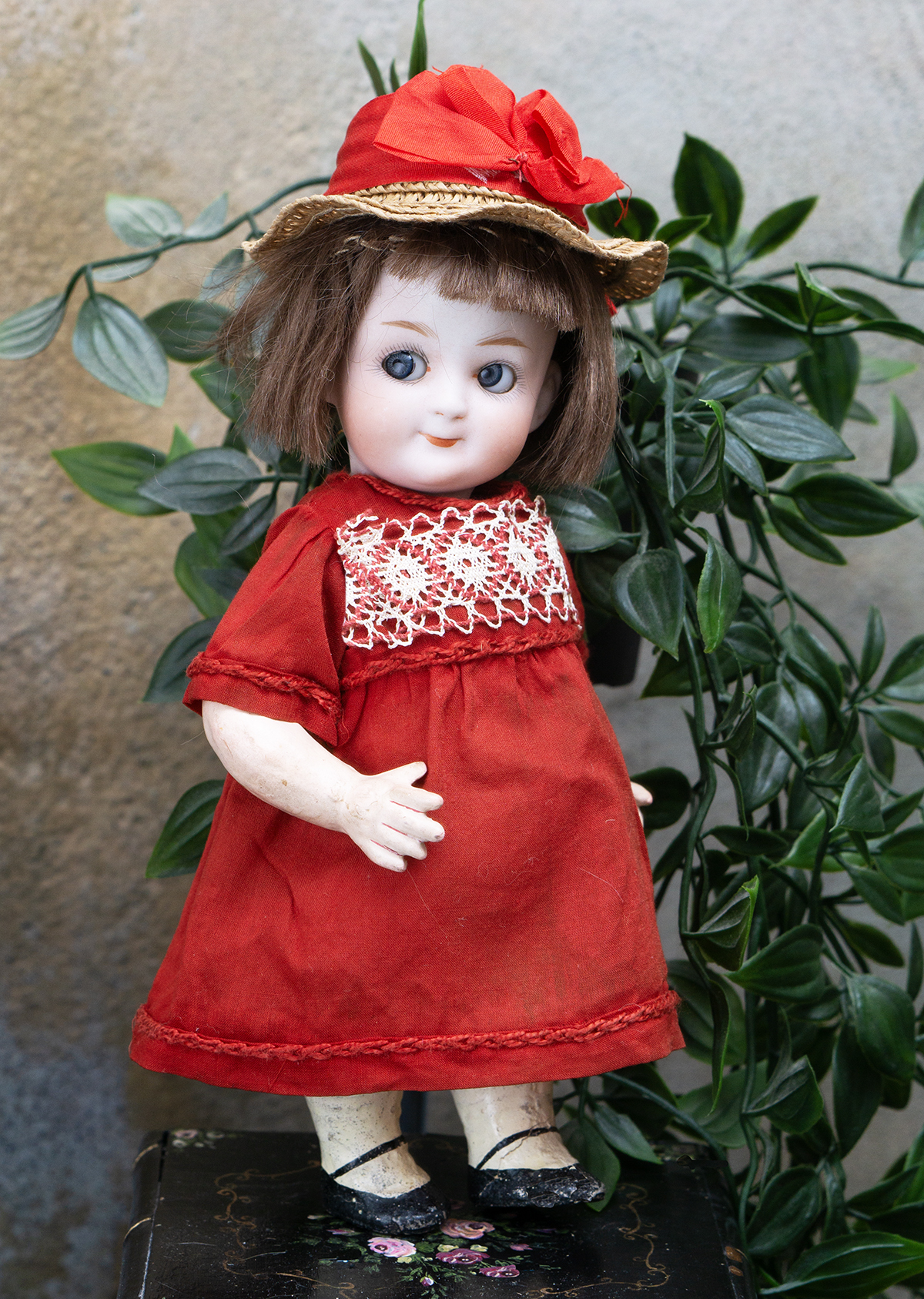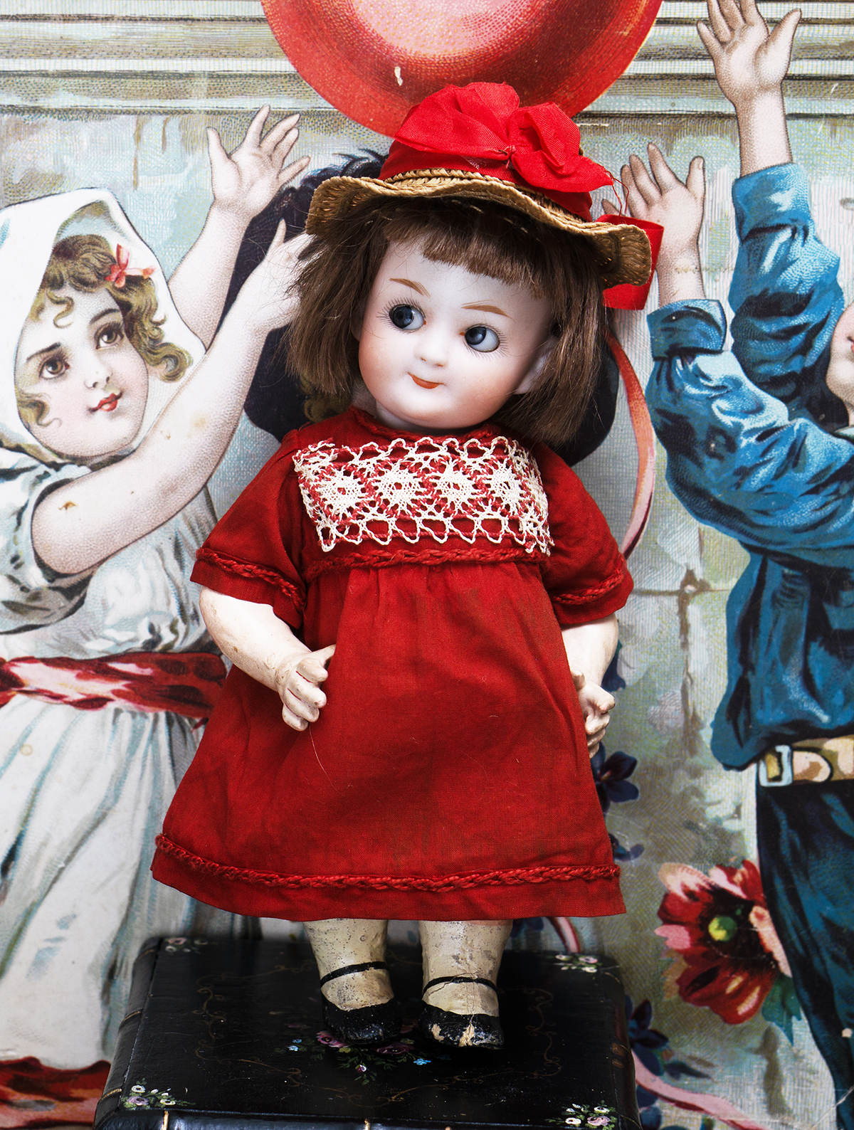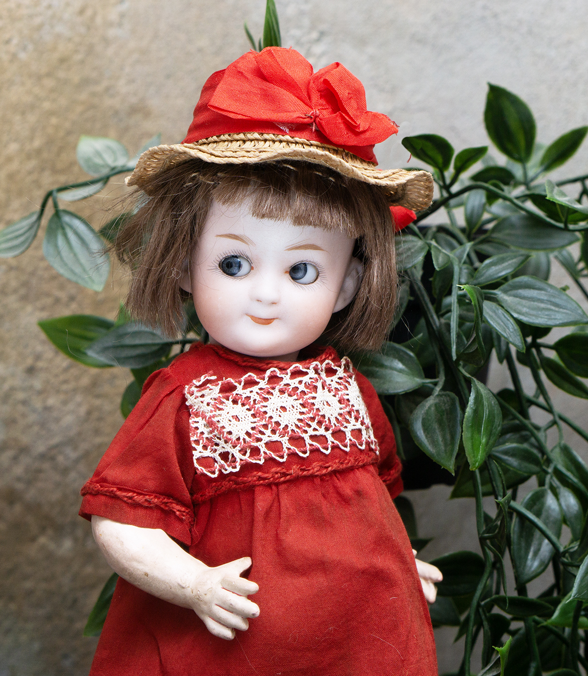 Bisque socket head,brown glass sleep and side-glancing googly eyes, painted long curly lashes, feathered brows,accented nostrils, closed mouth with shy smile, brunette mohair bobbed wig, composition five piece toddler body, antique dress and vintage hat.