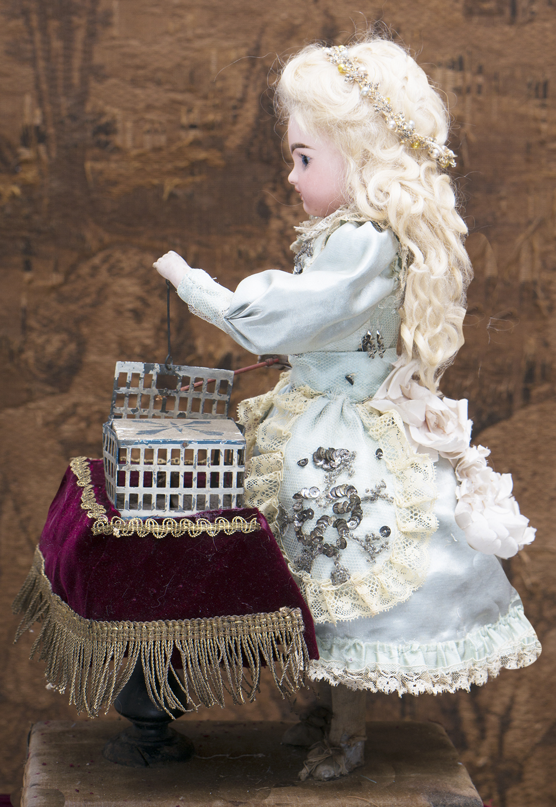 Standing upon a velvet covered platform with velvet covered table and a painted tin mouse cage is a bisque-head doll with blue glass paperweight eyes, closed mouth, blonde mohair wig, carton torso and legs, bisque forearms, wearing blue silk dress, holding a baton in one hand and the string to open the mouse cage in the other.
