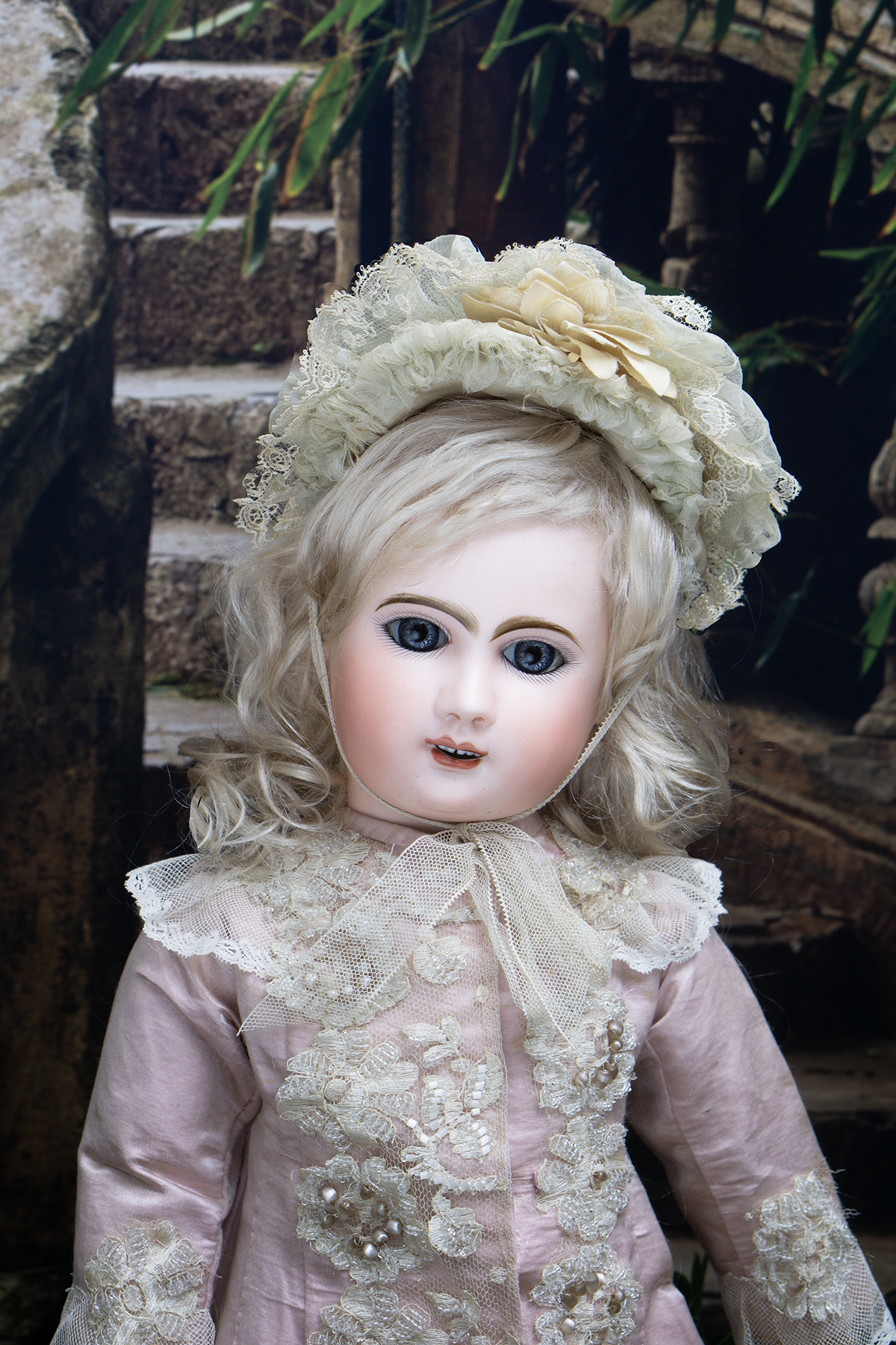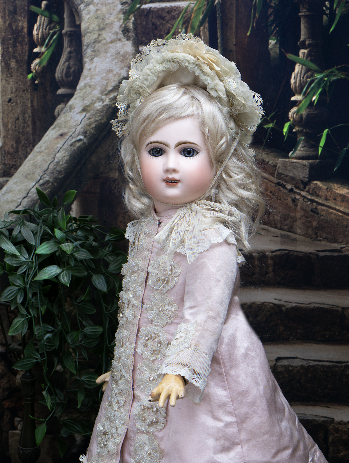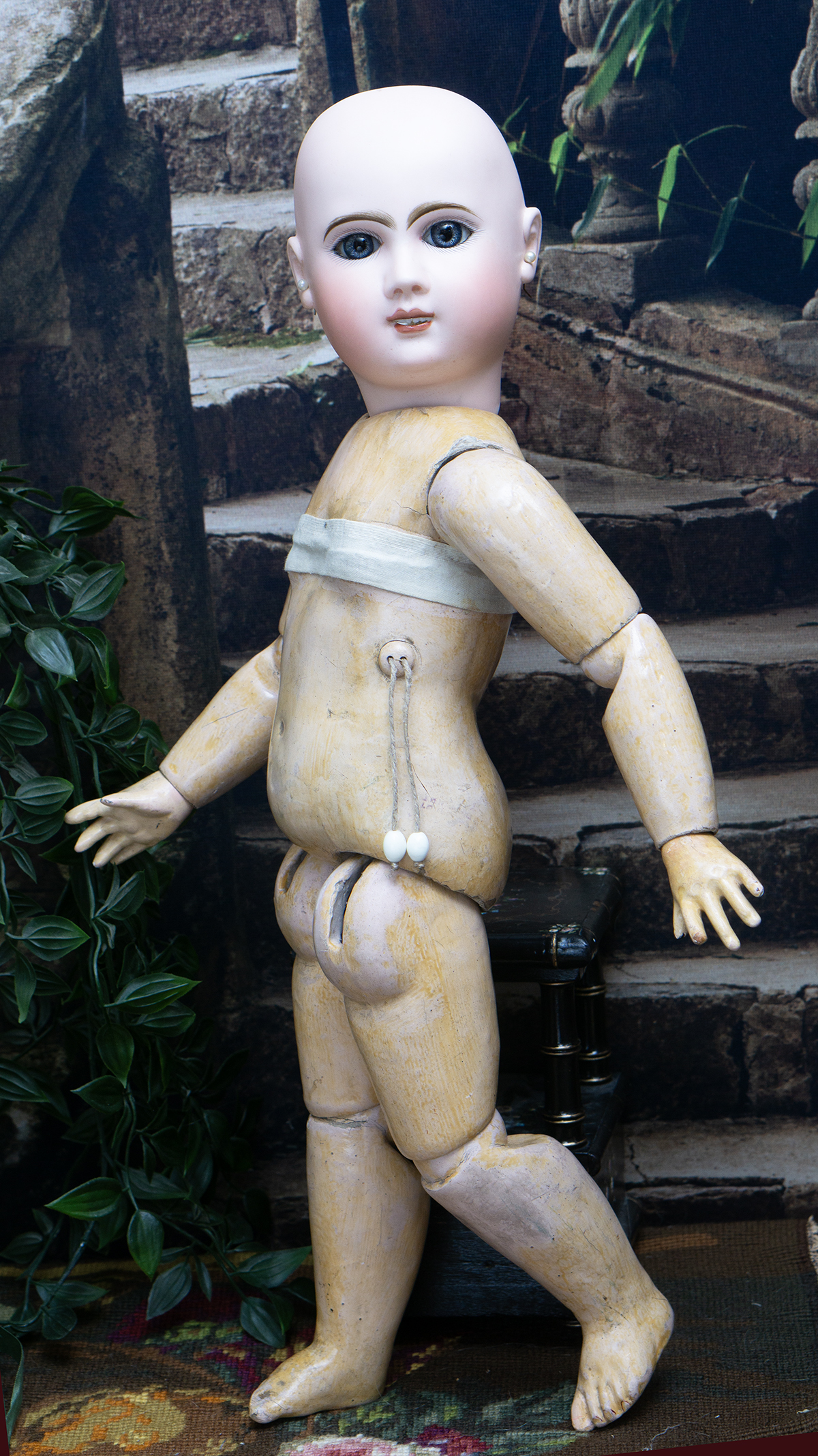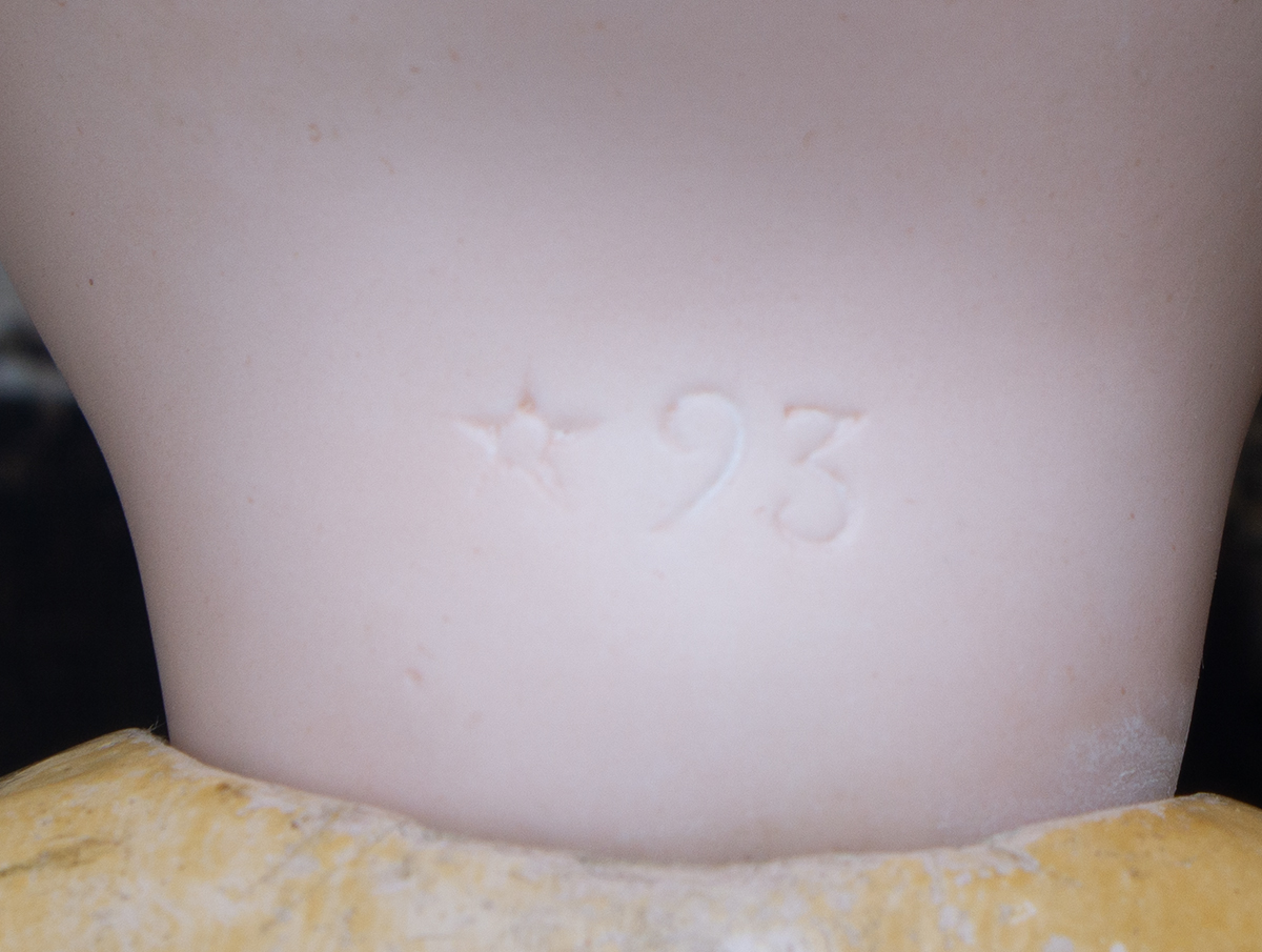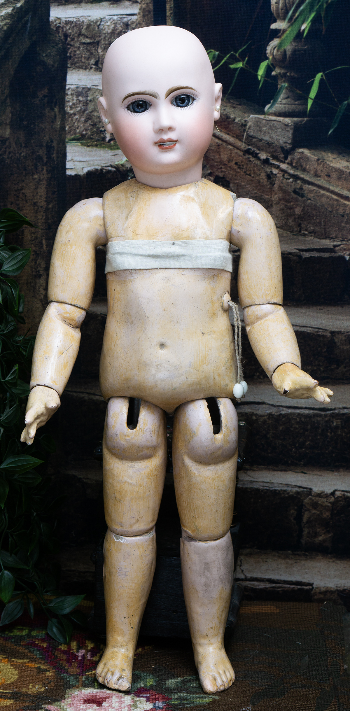 Bisque socket head, blue glass paperweight inset eyes, painted dark lashes, brush-stroked and multi-feathered brows, rose blushed eyeshadow, accented eye corners, shaded nostrils, open mouth, shaded and outlined lips, porcelain teeth, pierced ears, blonde mohair wig over cork pate, Steiner composition and wooden fully-jointed body with mama pull-string crier.