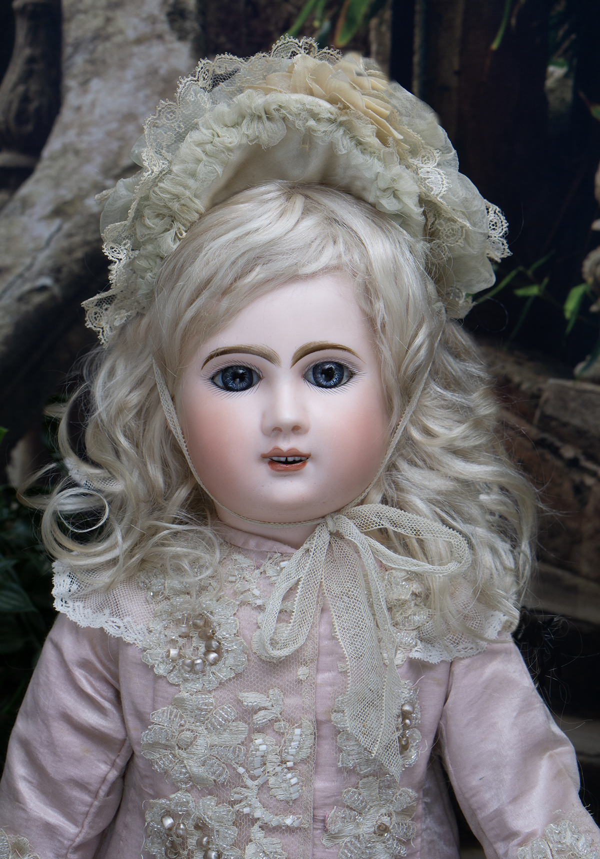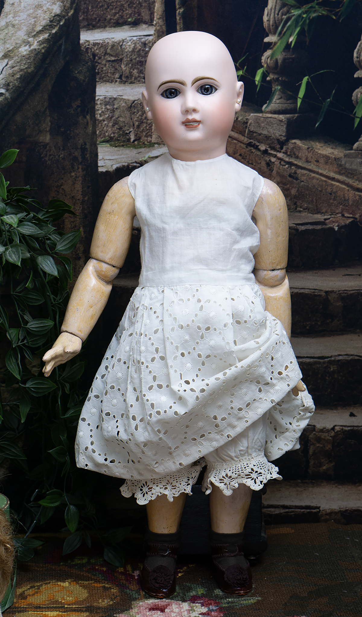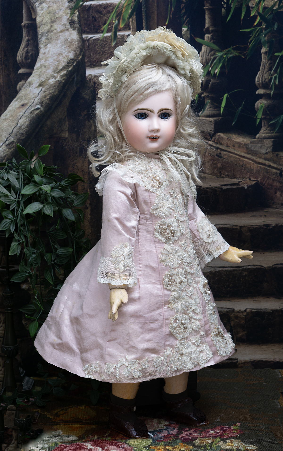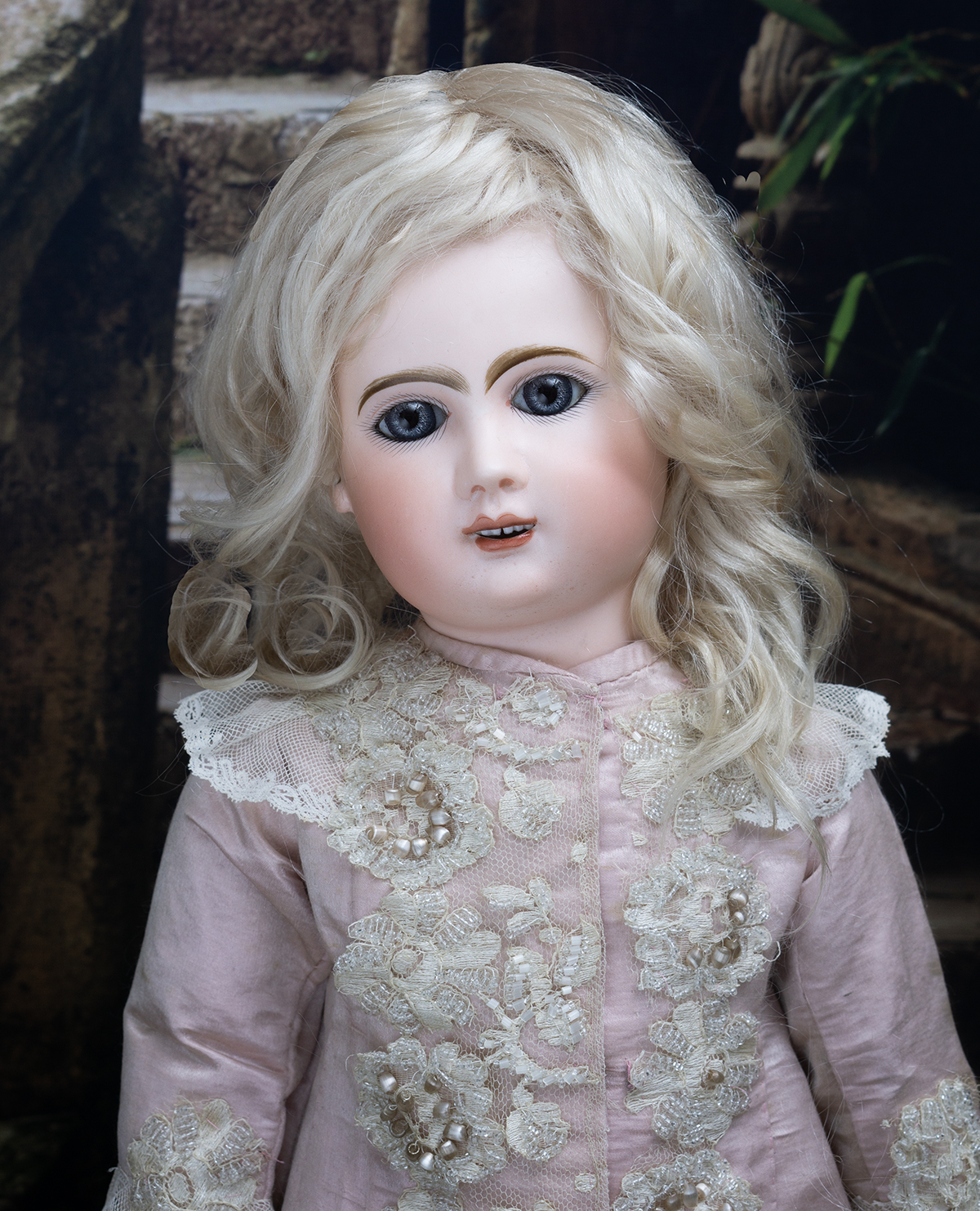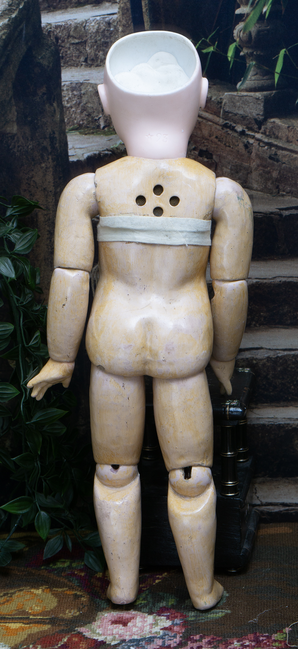 Bisque socket head, blue glass paperweight inset eyes, painted dark lashes, brush-stroked and multi-feathered brows, rose blushed eyeshadow, accented eye corners, shaded nostrils, open mouth, shaded and outlined lips, porcelain teeth, pierced ears, blonde mohair wig over cork pate, Steiner composition and wooden fully-jointed body with mama pull-string crier.