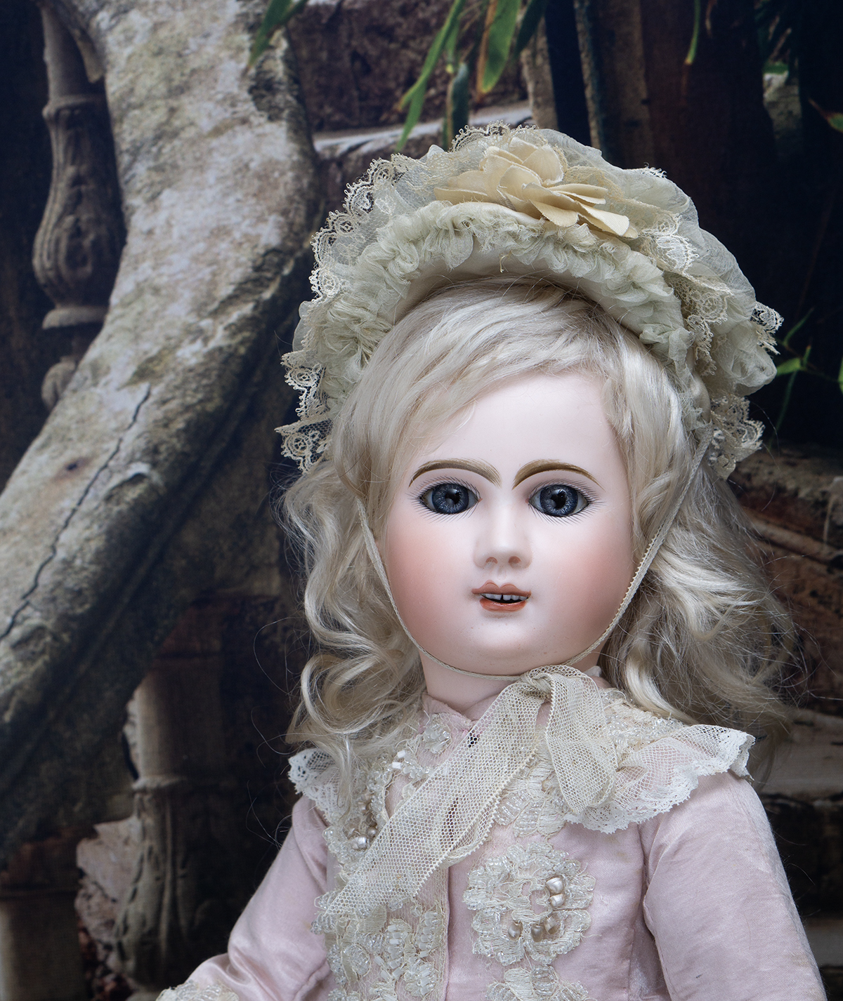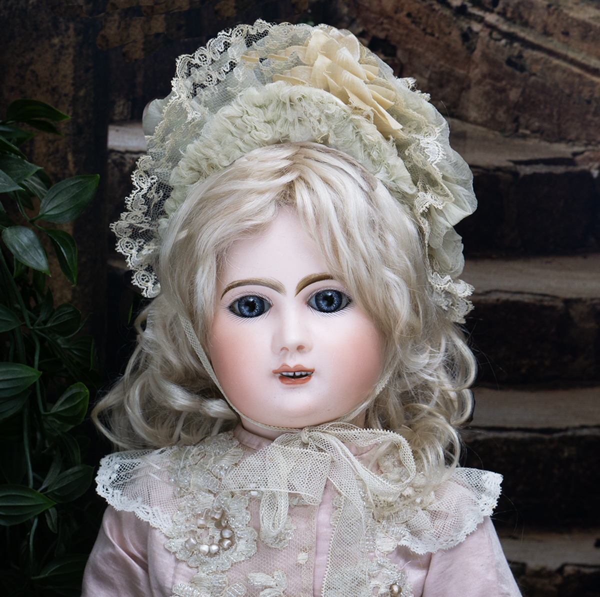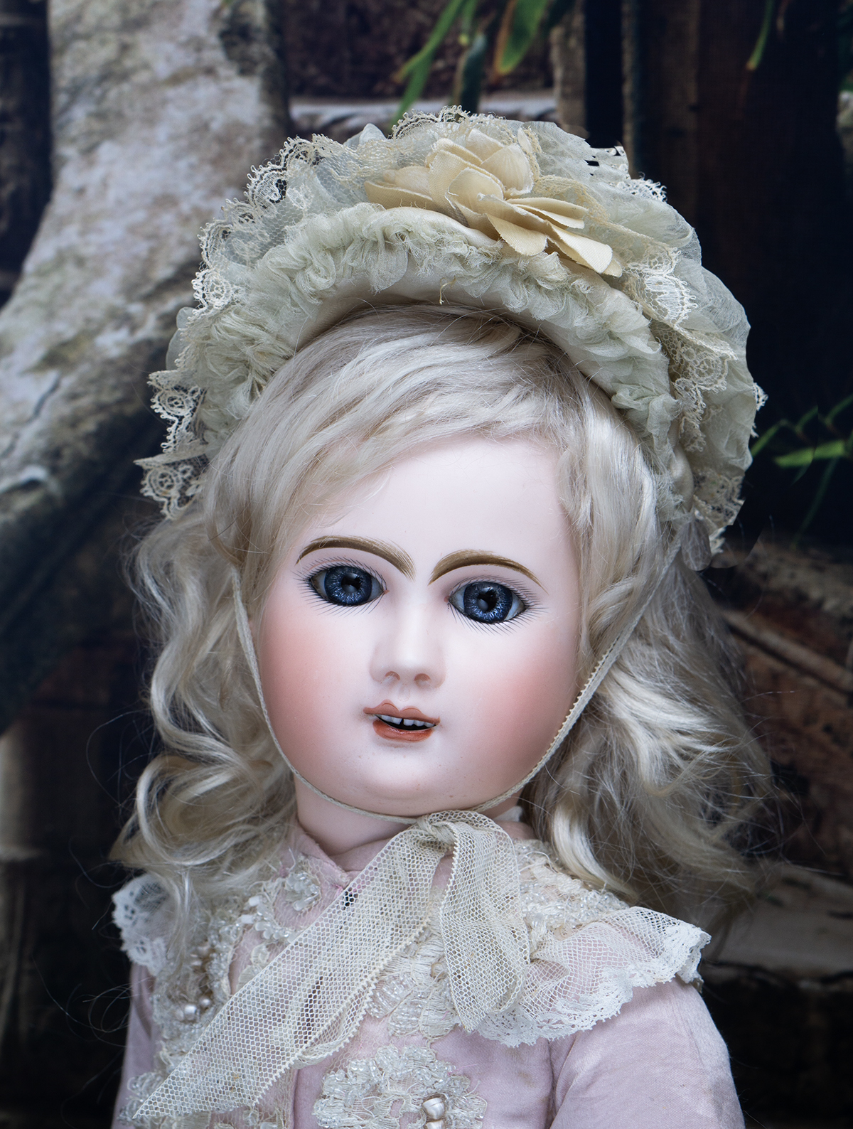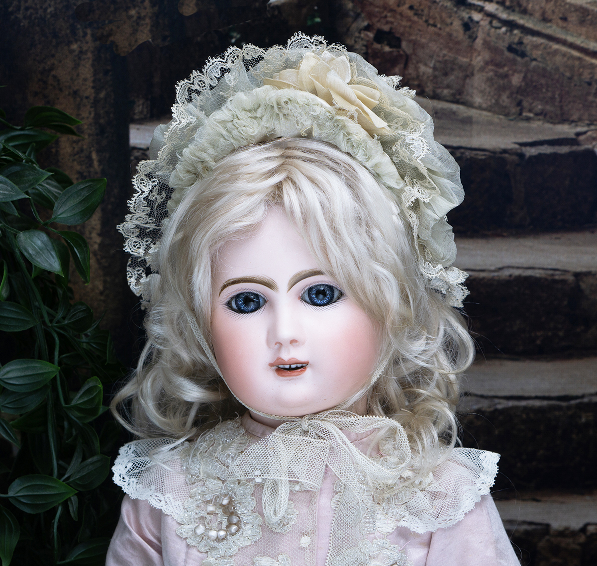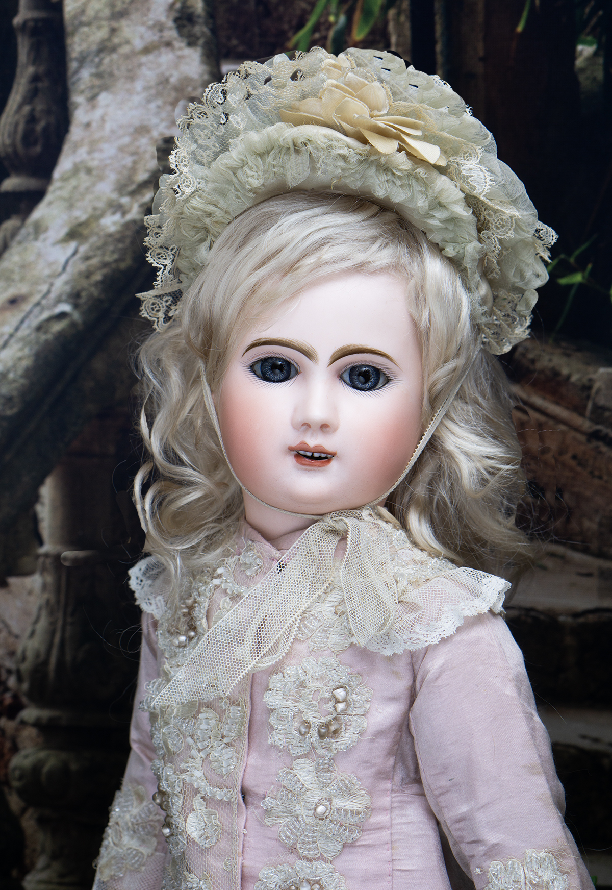 Bisque socket head, blue glass paperweight inset eyes, painted dark lashes, brush-stroked and multi-feathered brows, rose blushed eyeshadow, accented eye corners, shaded nostrils, open mouth, shaded and outlined lips, porcelain teeth, pierced ears, blonde mohair wig over cork pate, Steiner composition and wooden fully-jointed body with mama pull-string crier.