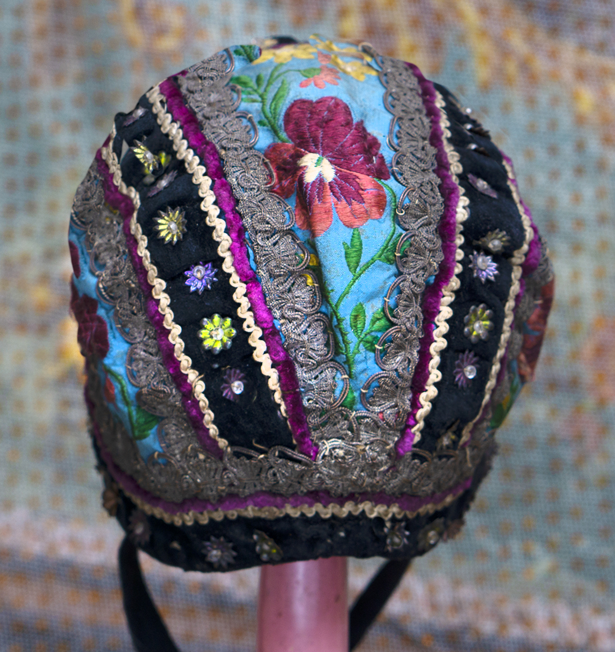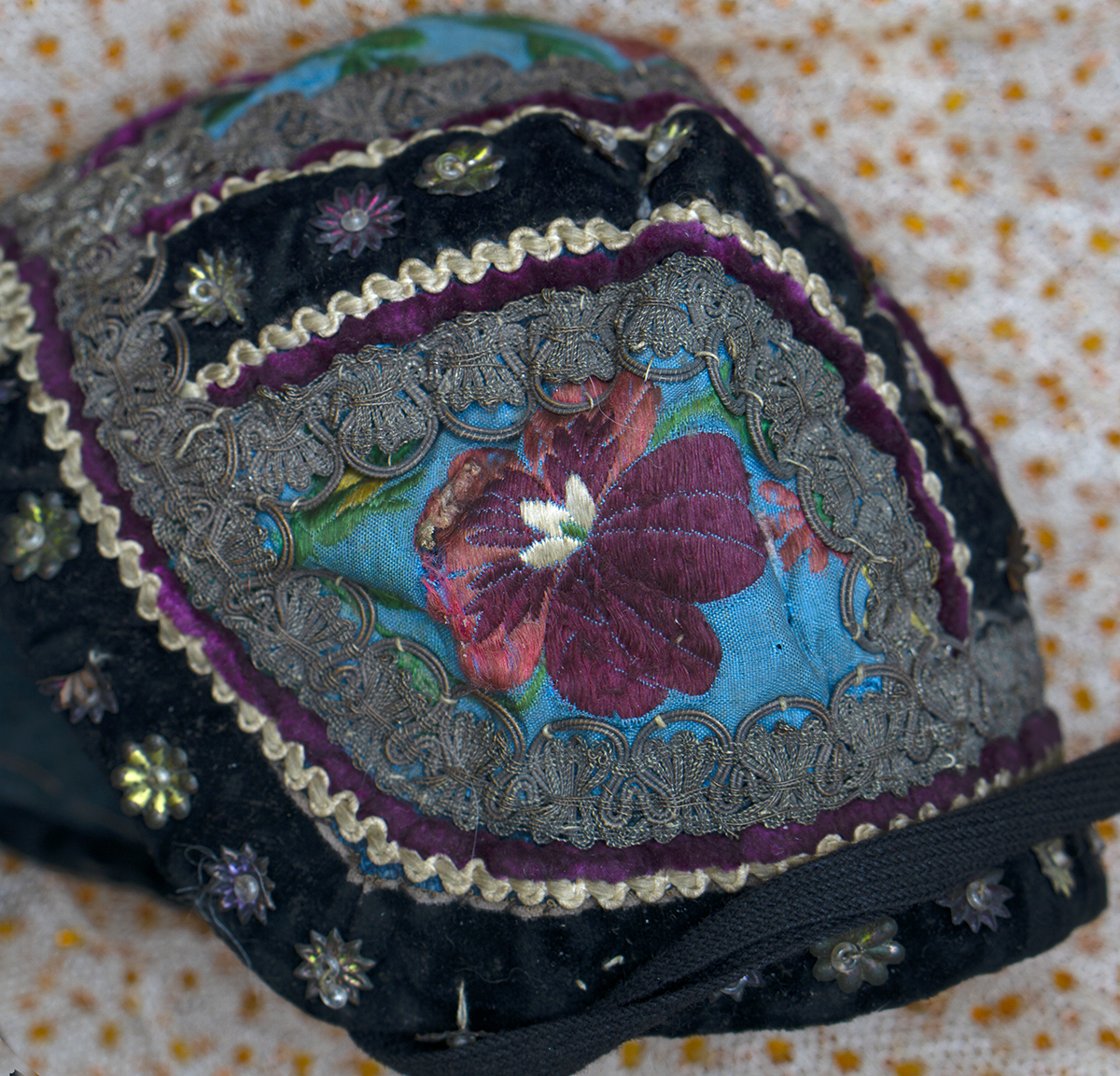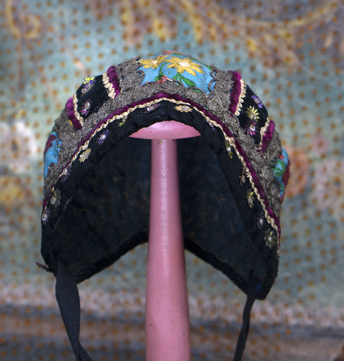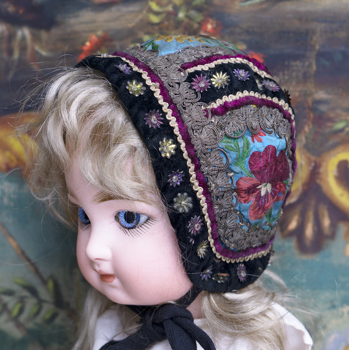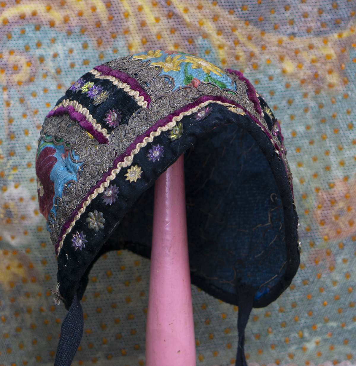 Wonderful antiqaue all original small Bonnet/ cap for doll from c.1830. Embroidered silk, black velvet with floral gold thread embroidery, gold trim and small metal flowers, linen lining. Fully hand stitched.