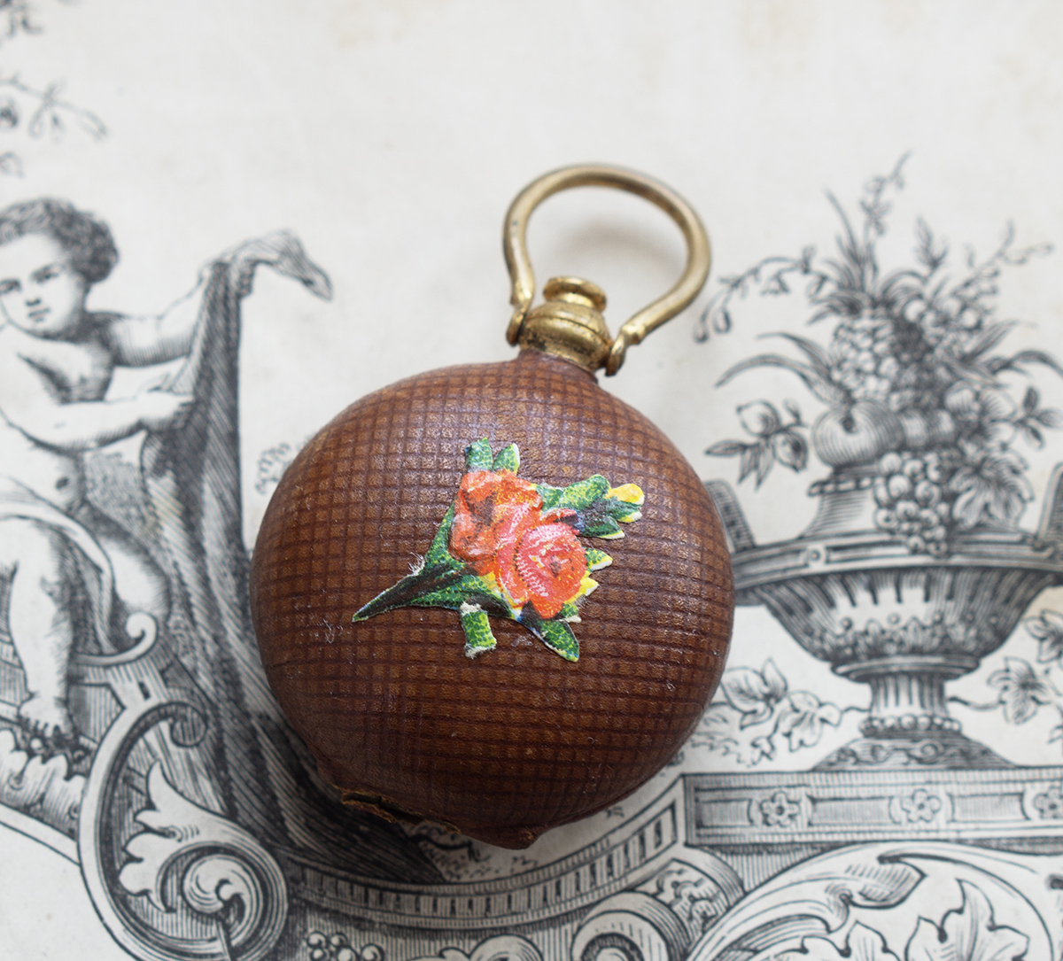 Rare and very beautiful hard to find antique original dolls faux-watch for fashion doll with hand painted enamel back decoration at watch back and painted clock face. The watch face side have its glass original cover, with bead decorated chain. It has wonderful gild ornament setting and tiny chain. Excellent condition! The watch in original french leather case. Excellent condition! Total length of the watch about 5 1/4" (13 cm). The watch 3/4" (1.5 cm) diameter. 6 1/4" (15cm) length the chain the case 1 1/4" (3cm) diameter. France, c.1865. International shipping cost $38.00 ------------------------------------ I DO A LAYAWAY NO STATE SALES TAX! Thanks for your visit to Respectfulbear doll shop!