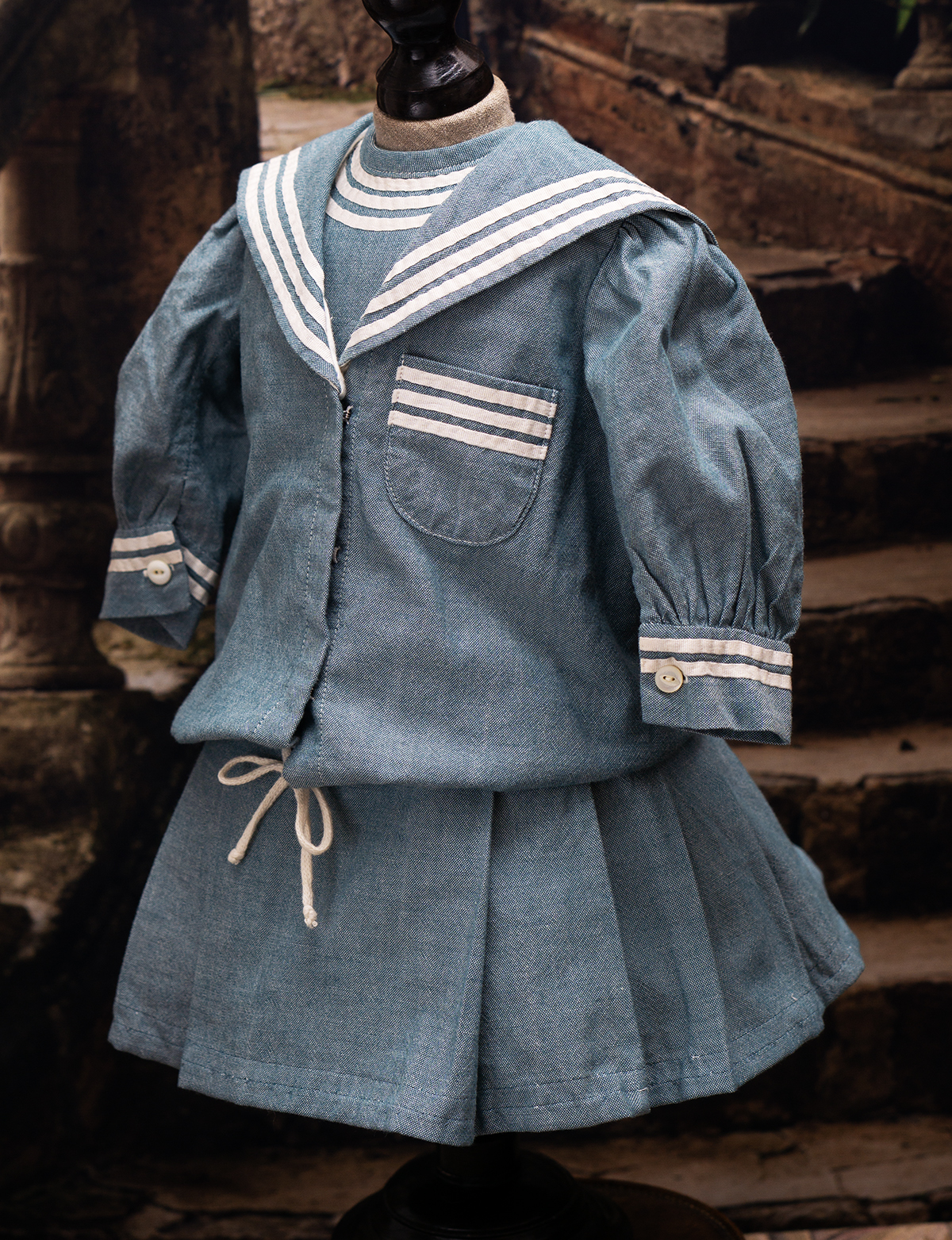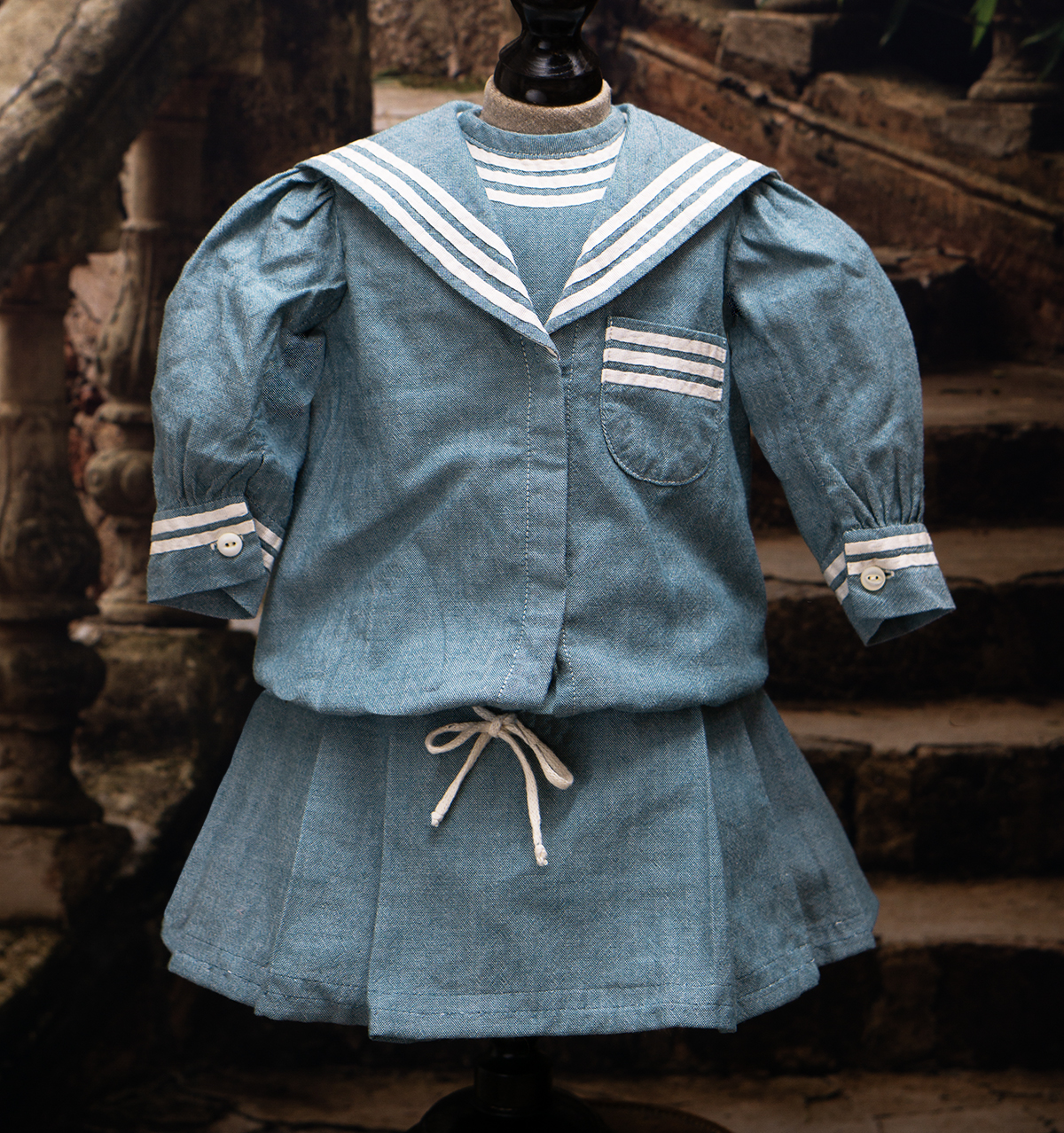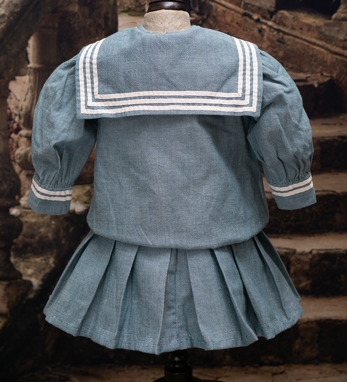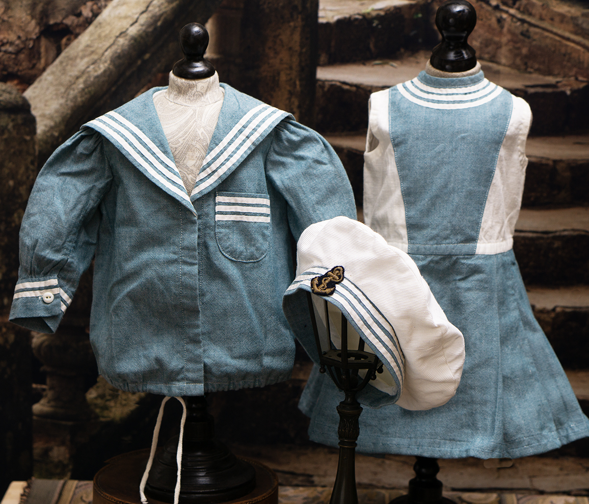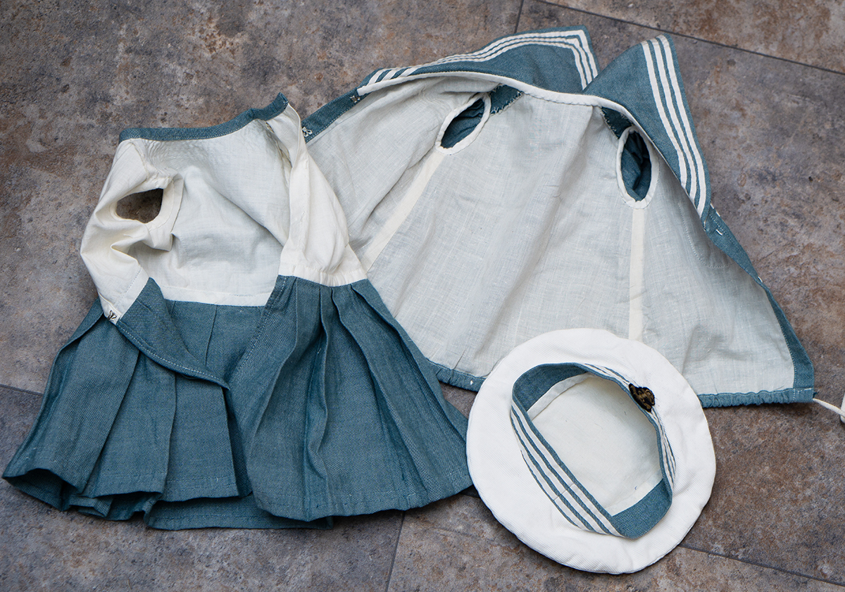 Of white and blue cotton, the three piece ensemble comprising sleeveless dress with pleated skirt, white pique hat, middle jacket with a very full sleeves with cuffs, wide sailor collar.