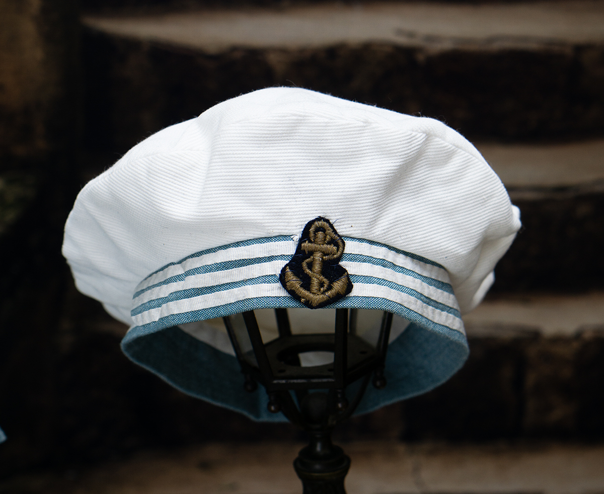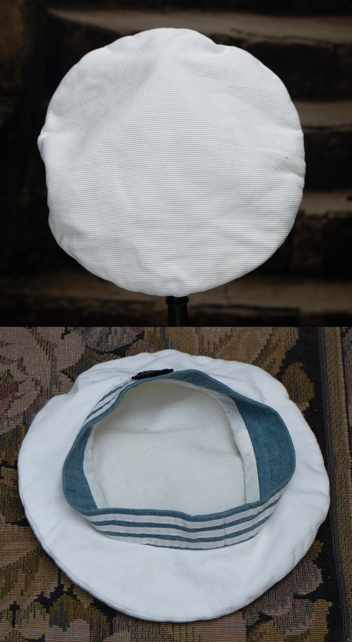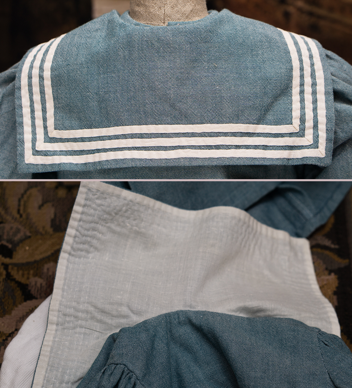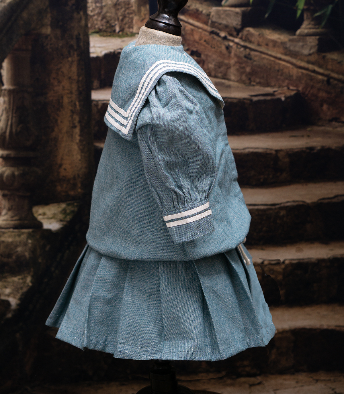 Of white and blue cotton, the three piece ensemble comprising sleeveless dress with pleated skirt, white pique hat, middle jacket with a very full sleeves with cuffs, wide sailor collar.